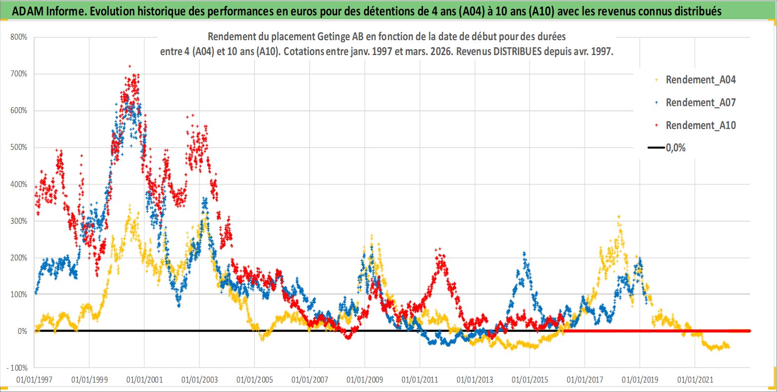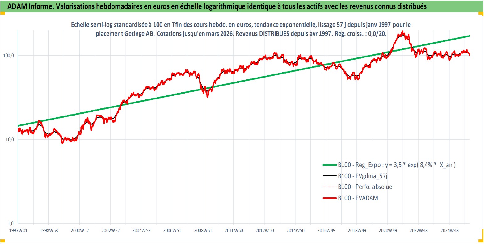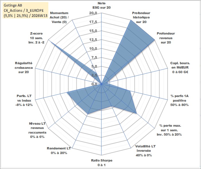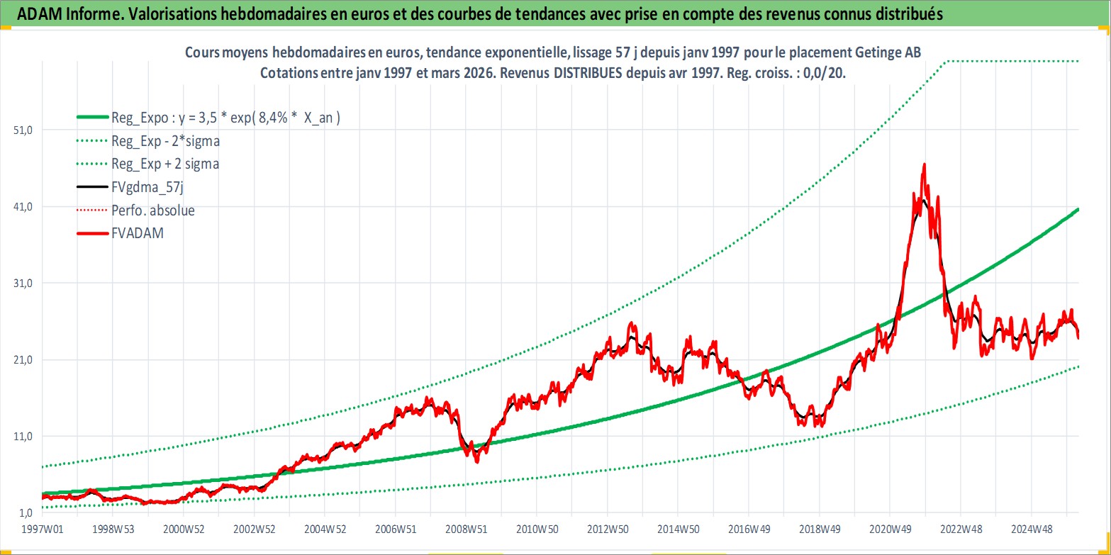 Site dédié aux investisseursPage dédiée sur site financeAnalyse des valorisations hebdomadaires de l'action Getinge AB. Cet actif est cote en SEK. Les valorisations sont en contrevaleur EURO et couvrent les semaines 1997W01 a 2026W13. Les revenus de cet actif financier sont pris en compte depuis la semaine 1997W18. La note ESG de cet actif n'est pas connue.
