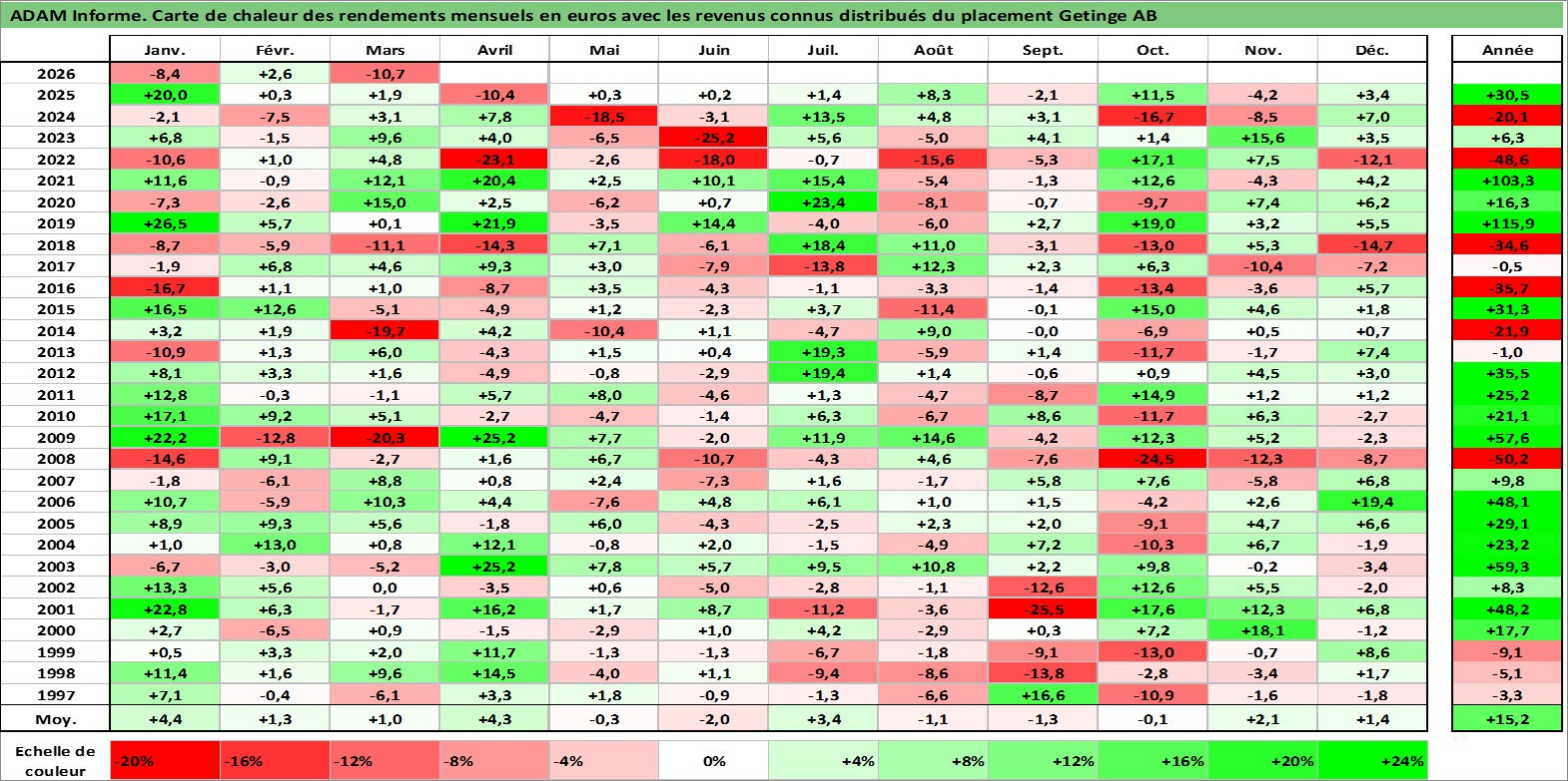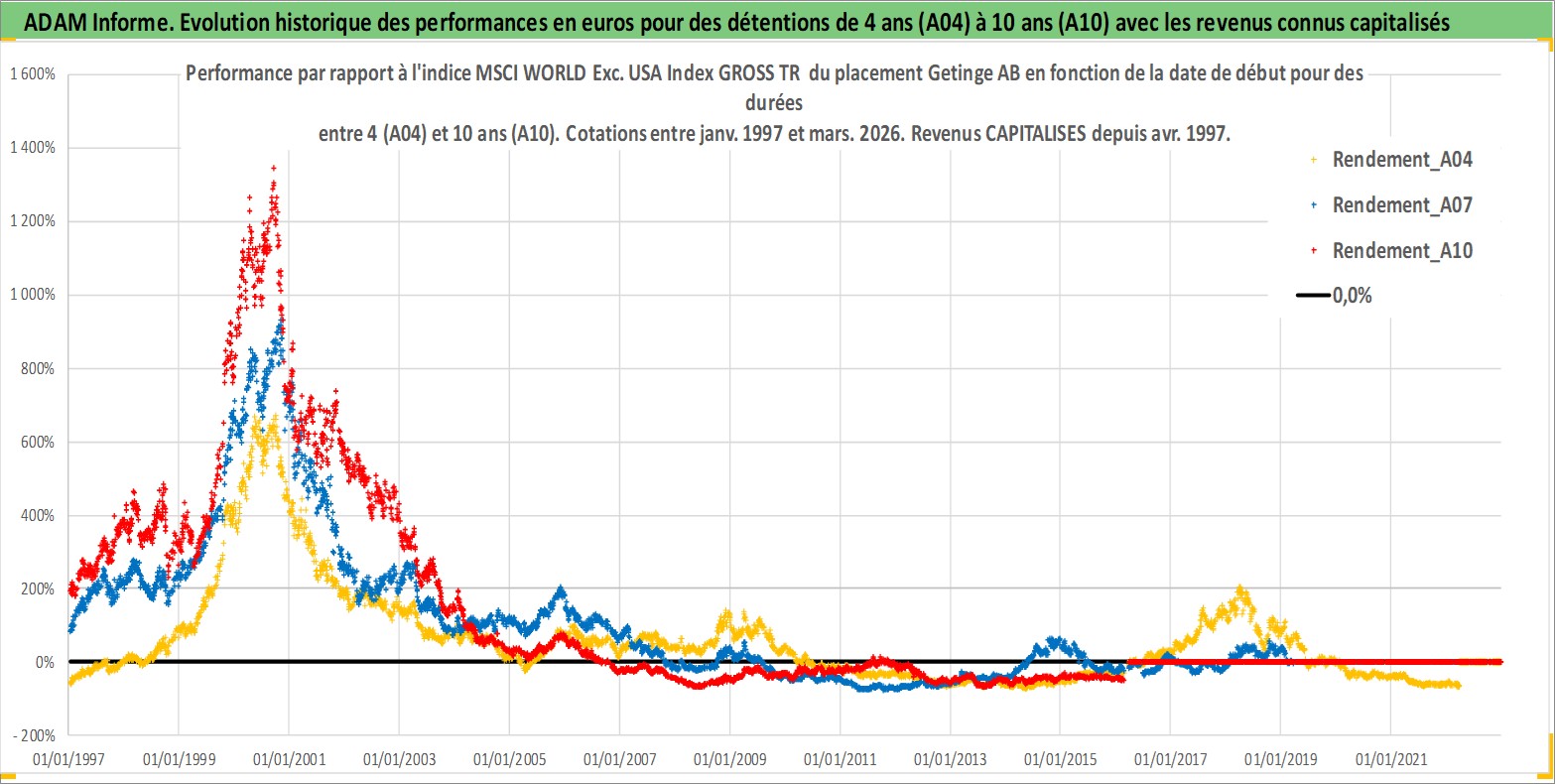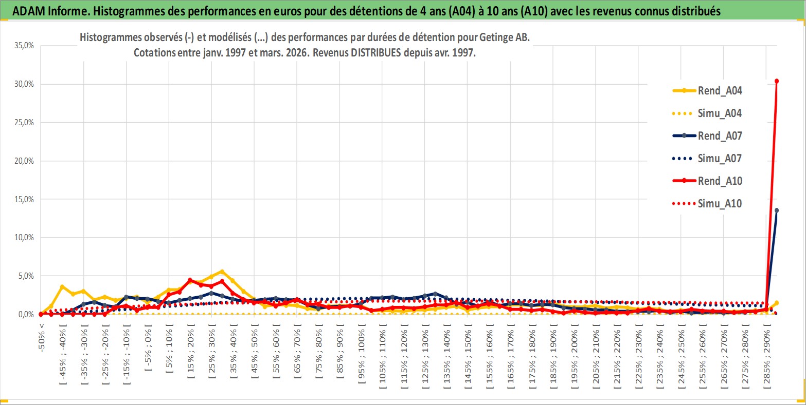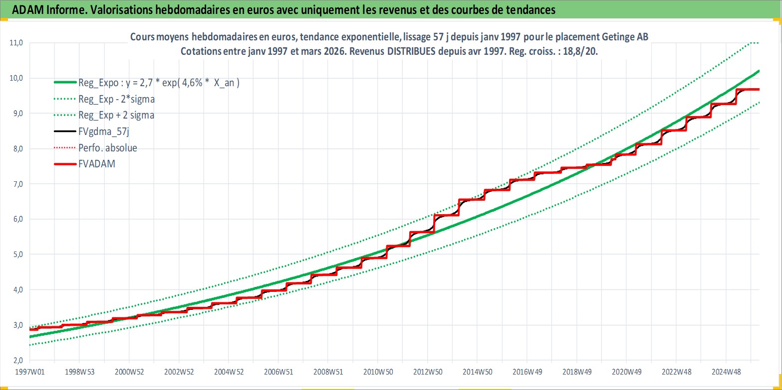 Site dédié aux investisseursPage dédiée sur site financeAnalyse des valorisations hebdomadaires de l'action Getinge AB. Cet actif est cote en SEK. Les valorisations sont en contrevaleur EURO et couvrent les semaines 1997W01 a 2026W13. Les revenus de cet actif financier sont pris en compte depuis la semaine 1997W18. La note ESG de cet actif n'est pas connue.