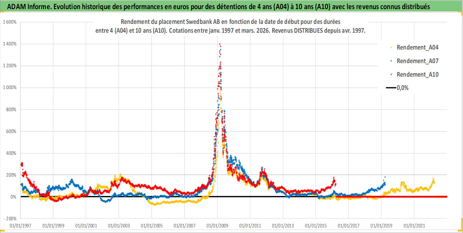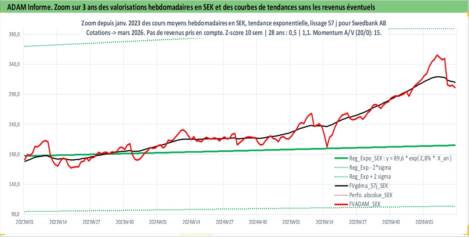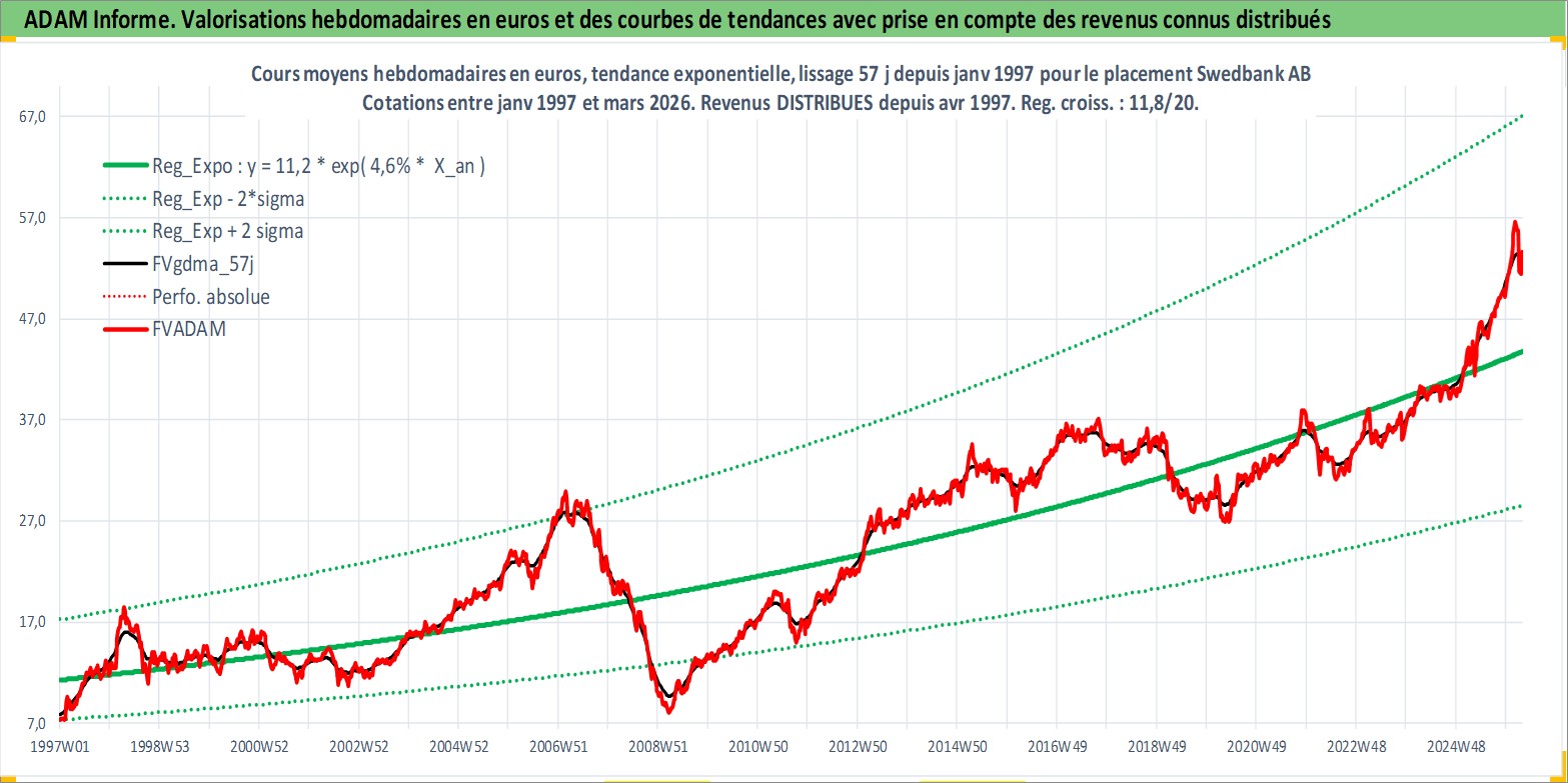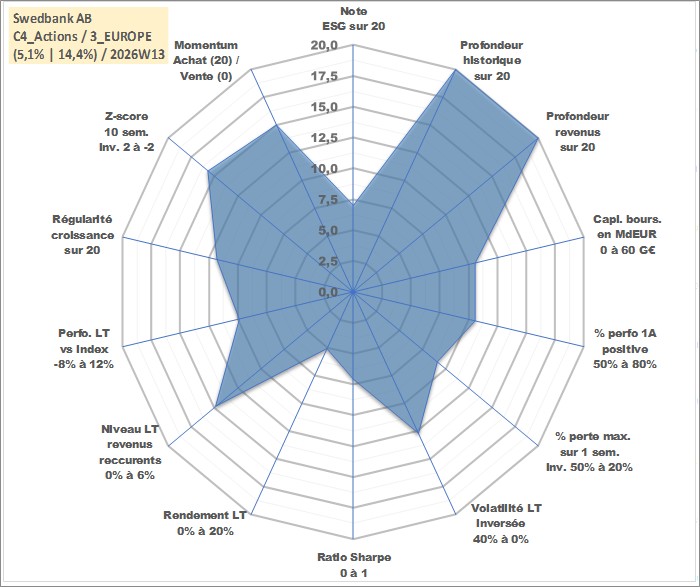 Site dédié aux investisseursPage dédiée sur site financeAnalyse des valorisations hebdomadaires de l'action Swedbank AB. Cet actif est cote en SEK. Les valorisations sont en contrevaleur EURO et couvrent les semaines 1997W01 a 2026W13. Les revenus de cet actif financier sont pris en compte depuis la semaine 1997W17. La note globale ESG de cet actif est estimee a 7.0 (apres rebasage entre 0 et 20).