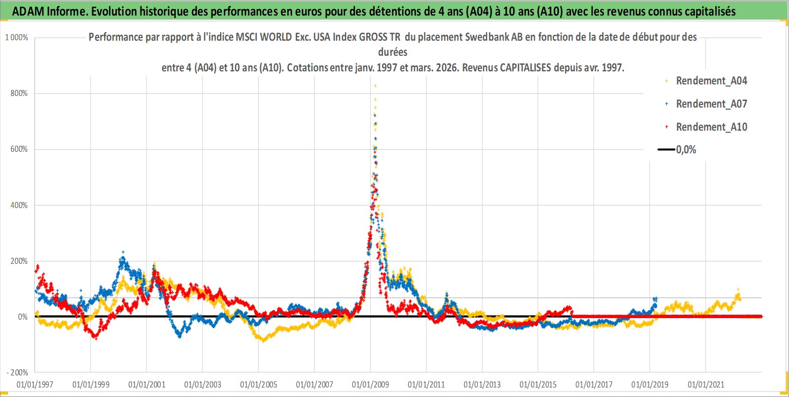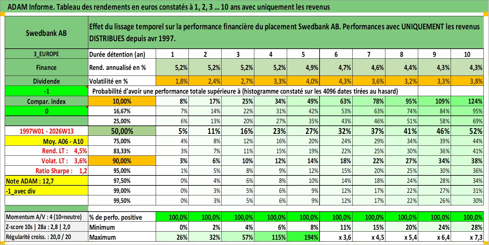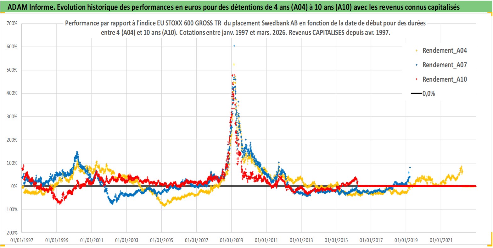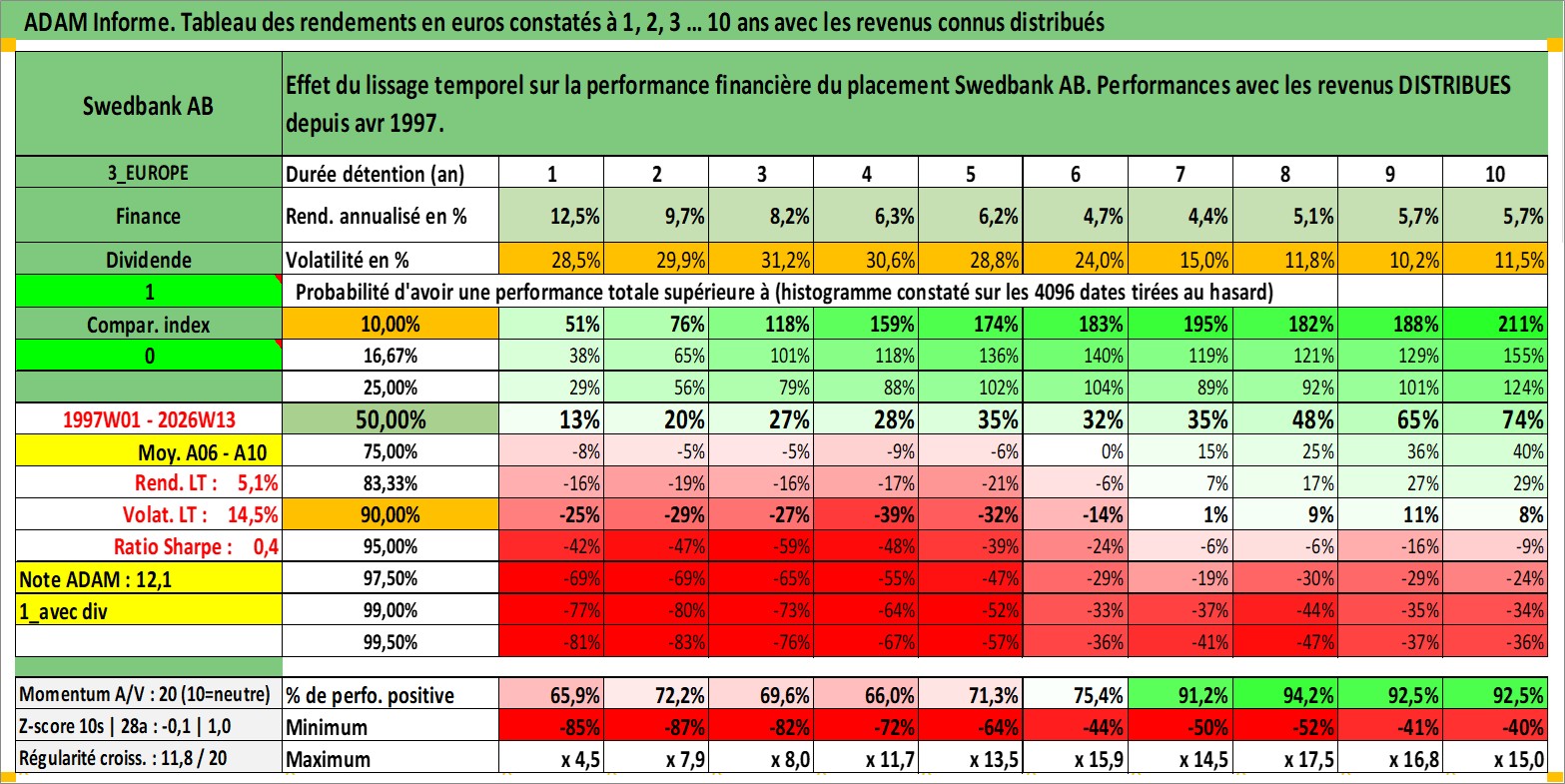 Site dédié aux investisseursPage dédiée sur site financeAnalyse des valorisations hebdomadaires de l'action Swedbank AB. Cet actif est cote en SEK. Les valorisations sont en contrevaleur EURO et couvrent les semaines 1997W01 a 2026W13. Les revenus de cet actif financier sont pris en compte depuis la semaine 1997W17. La note globale ESG de cet actif est estimee a 7.0 (apres rebasage entre 0 et 20).