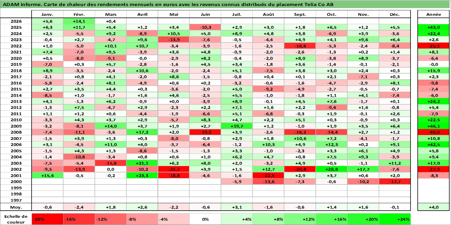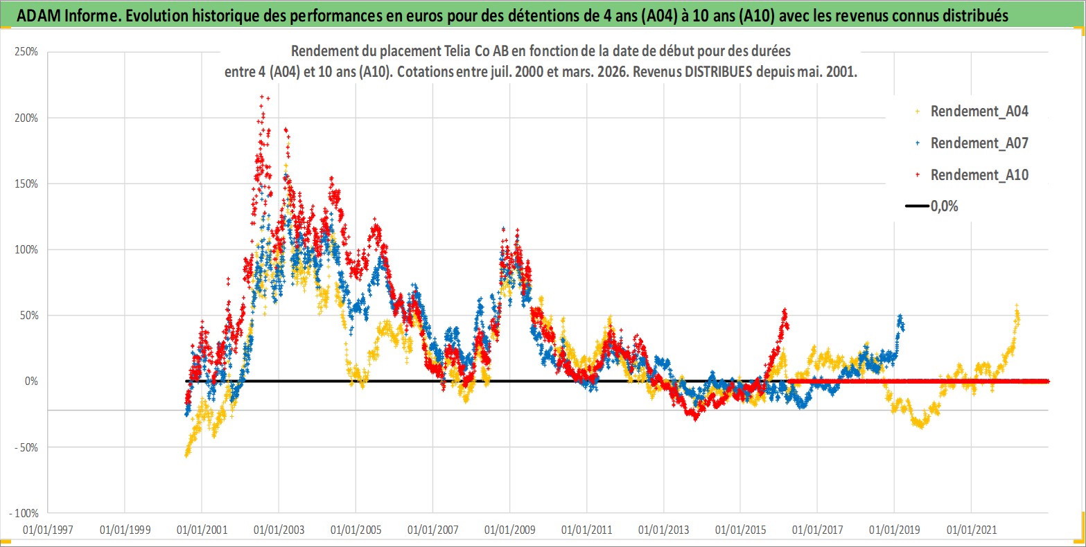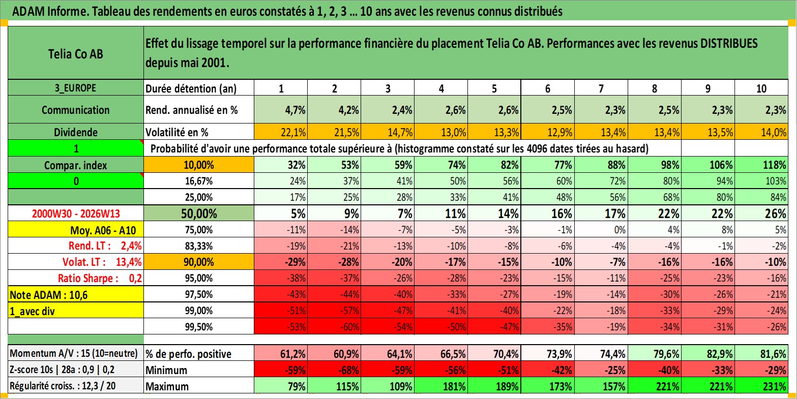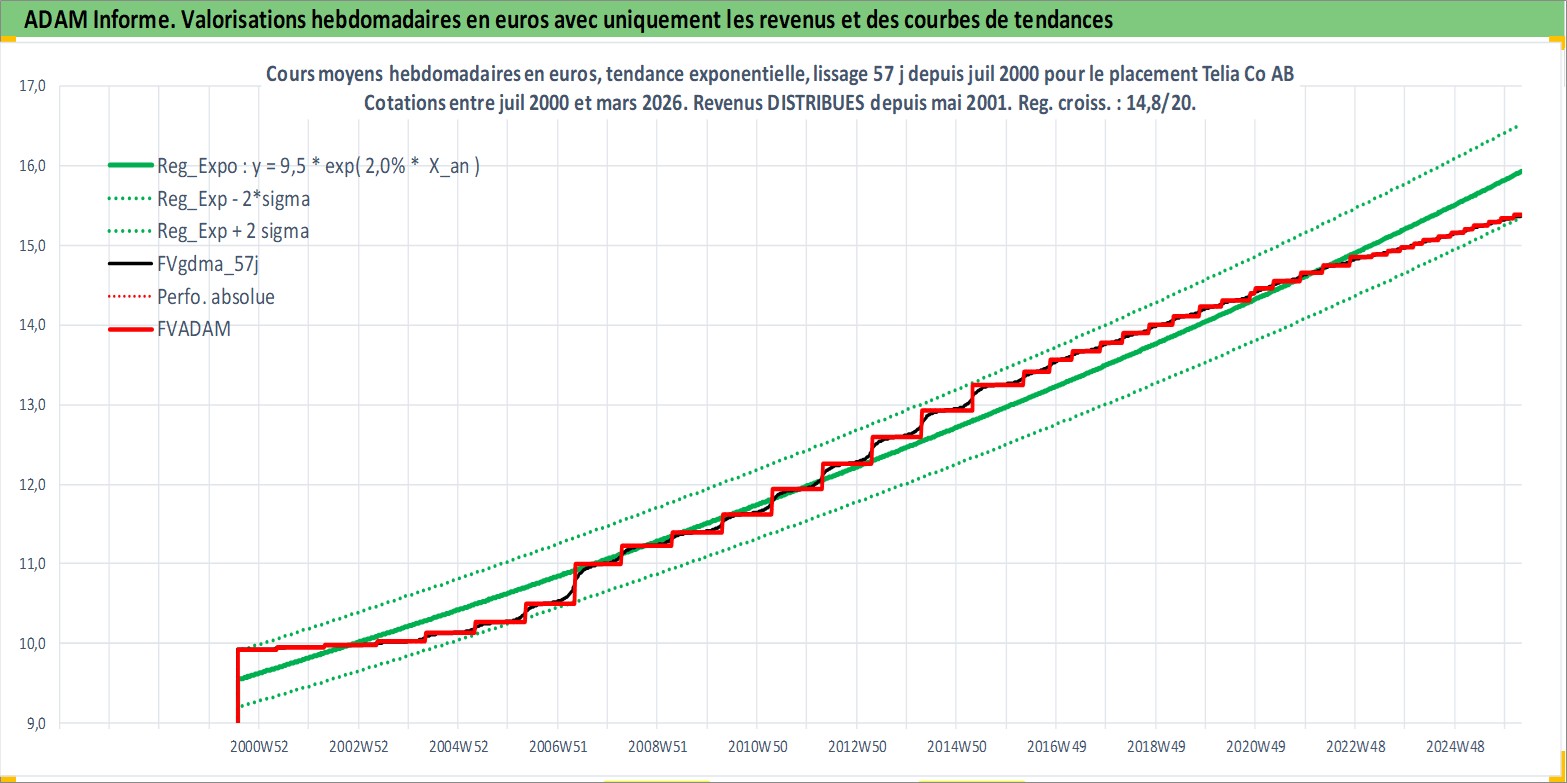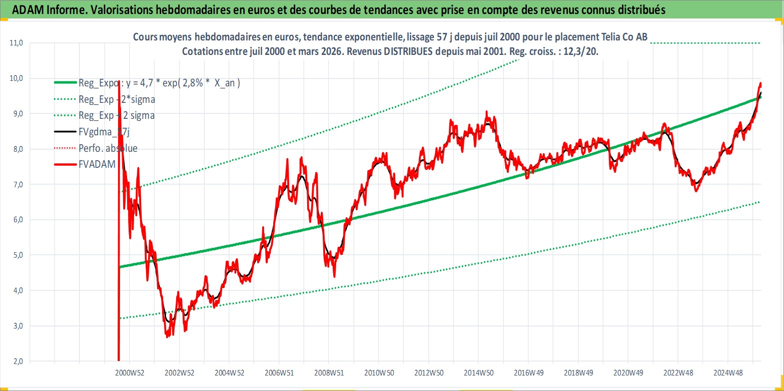 Site dédié aux investisseursPage dédiée sur site financeAnalyse des valorisations hebdomadaires de l'action Telia Co AB. Cet actif est cote en SEK. Les valorisations sont en contrevaleur EURO et couvrent les semaines 2000W30 a 2026W13. Les revenus de cet actif financier sont pris en compte depuis la semaine 2001W19. La note globale ESG de cet actif est estimee a 11.0 (apres rebasage entre 0 et 20).