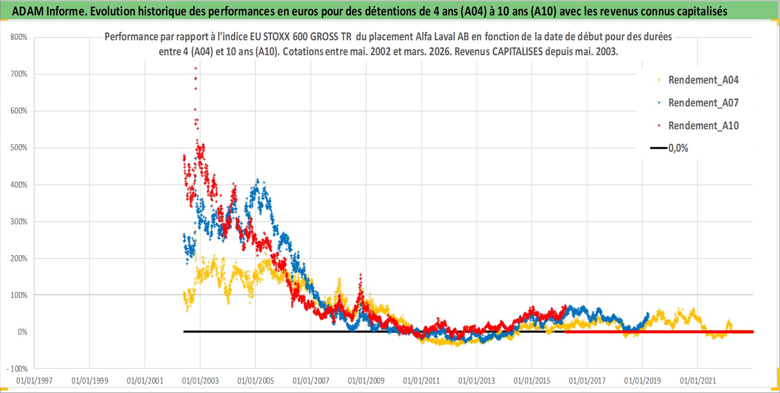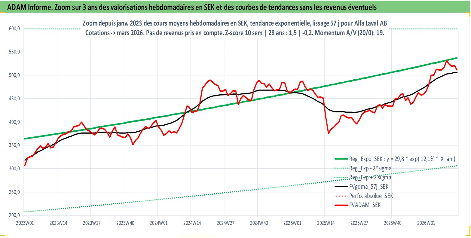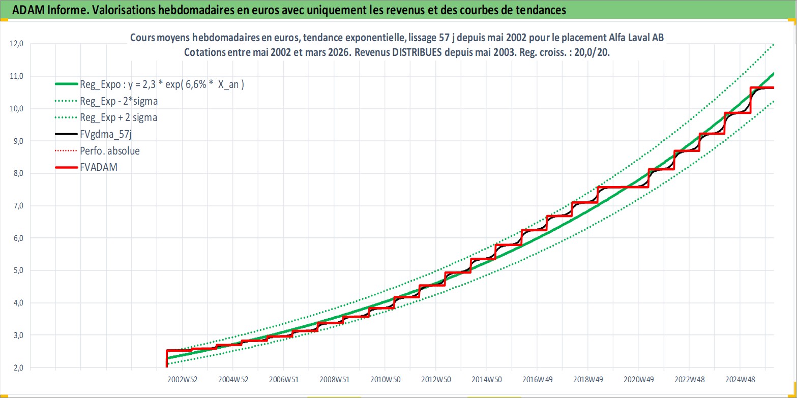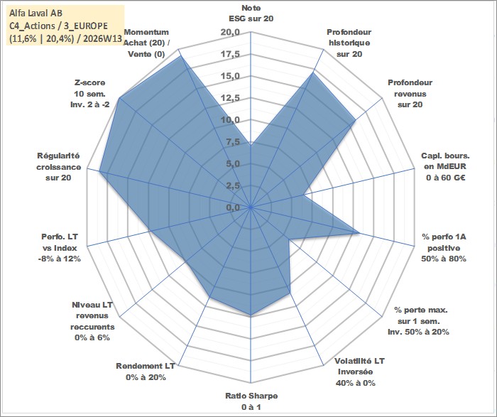 Site dédié aux investisseursPage dédiée sur site financeAnalyse des valorisations hebdomadaires de l'action Alfa Laval AB. Cet actif est cote en SEK. Les valorisations sont en contrevaleur EURO et couvrent les semaines 2002W20 a 2026W13. Les revenus de cet actif financier sont pris en compte depuis la semaine 2003W19. La note globale ESG de cet actif est estimee a 7.0 (apres rebasage entre 0 et 20).