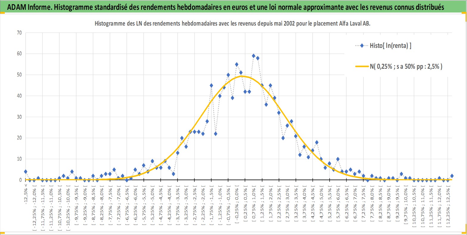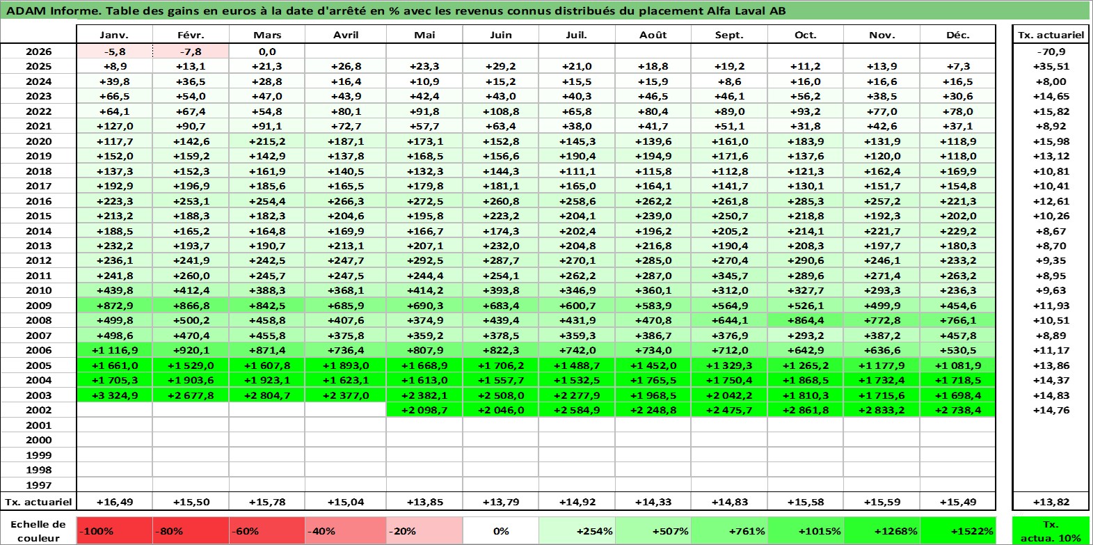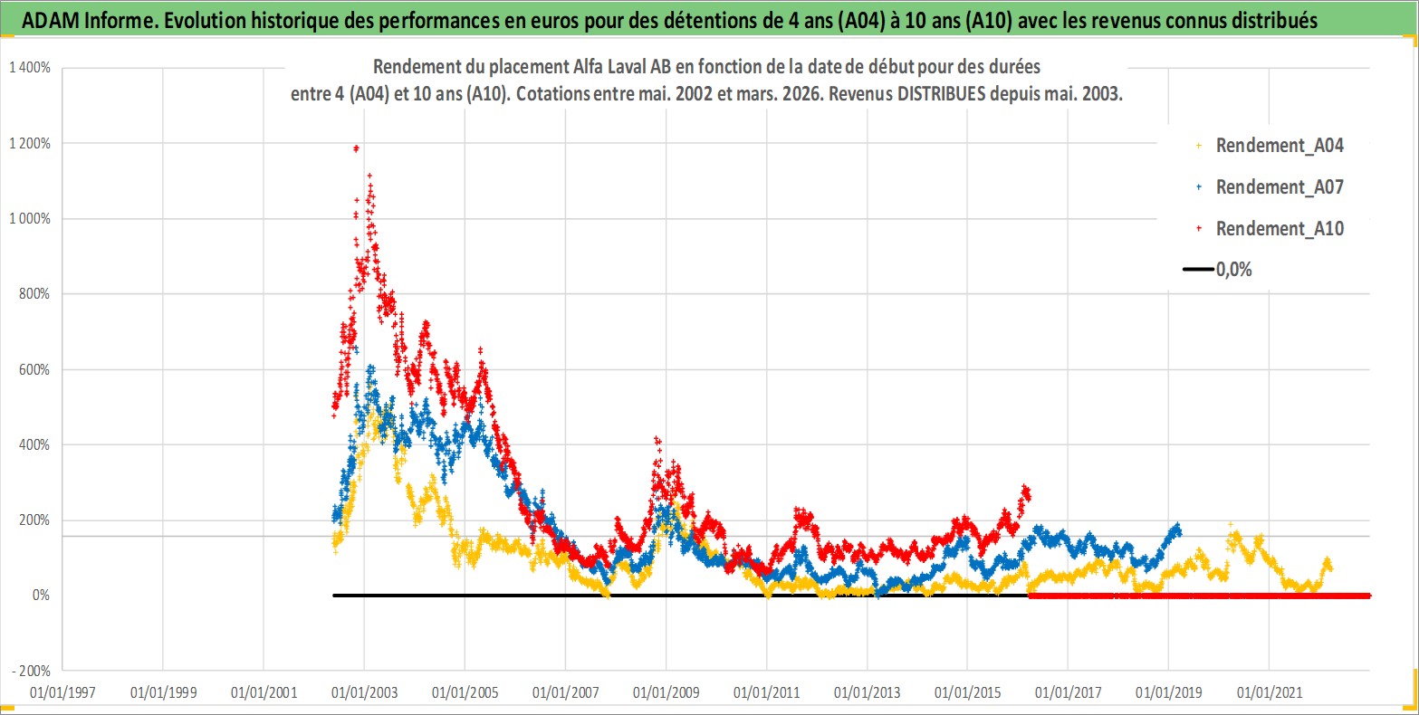 Site dédié aux investisseursPage dédiée sur site financeAnalyse des valorisations hebdomadaires de l'action Alfa Laval AB. Cet actif est cote en SEK. Les valorisations sont en contrevaleur EURO et couvrent les semaines 2002W20 a 2026W13. Les revenus de cet actif financier sont pris en compte depuis la semaine 2003W19. La note globale ESG de cet actif est estimee a 7.0 (apres rebasage entre 0 et 20).