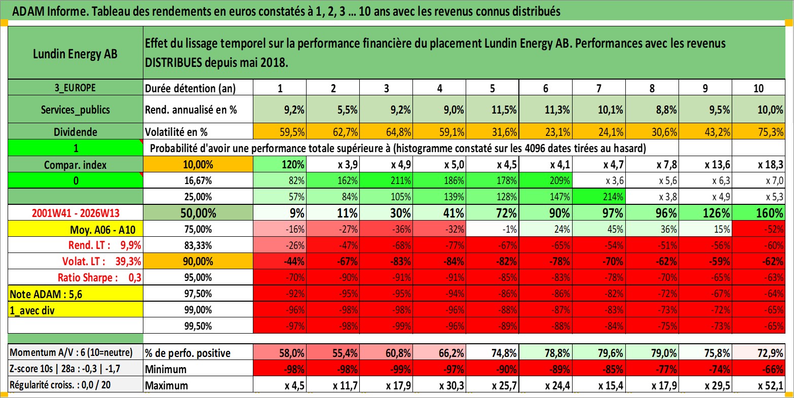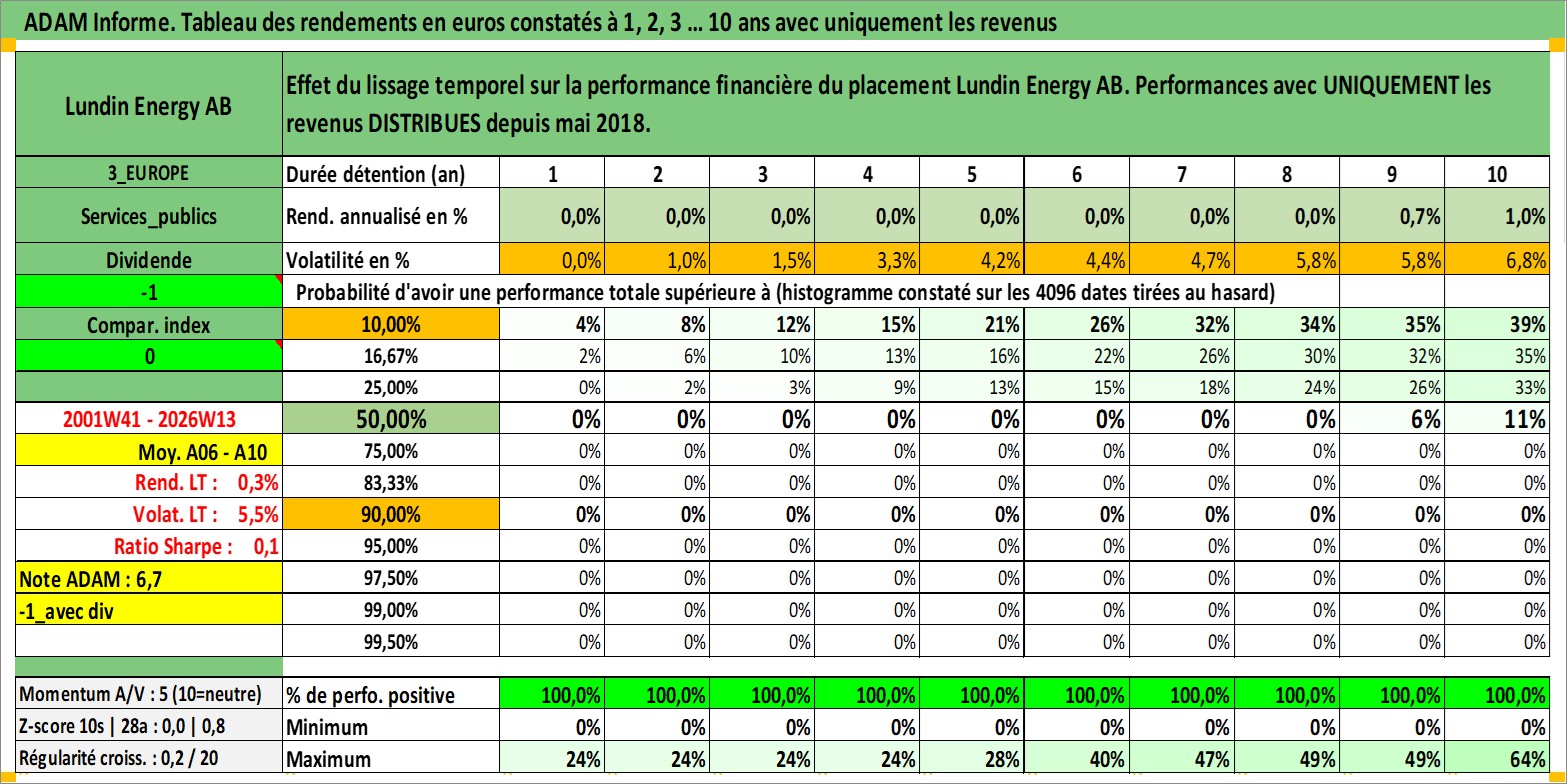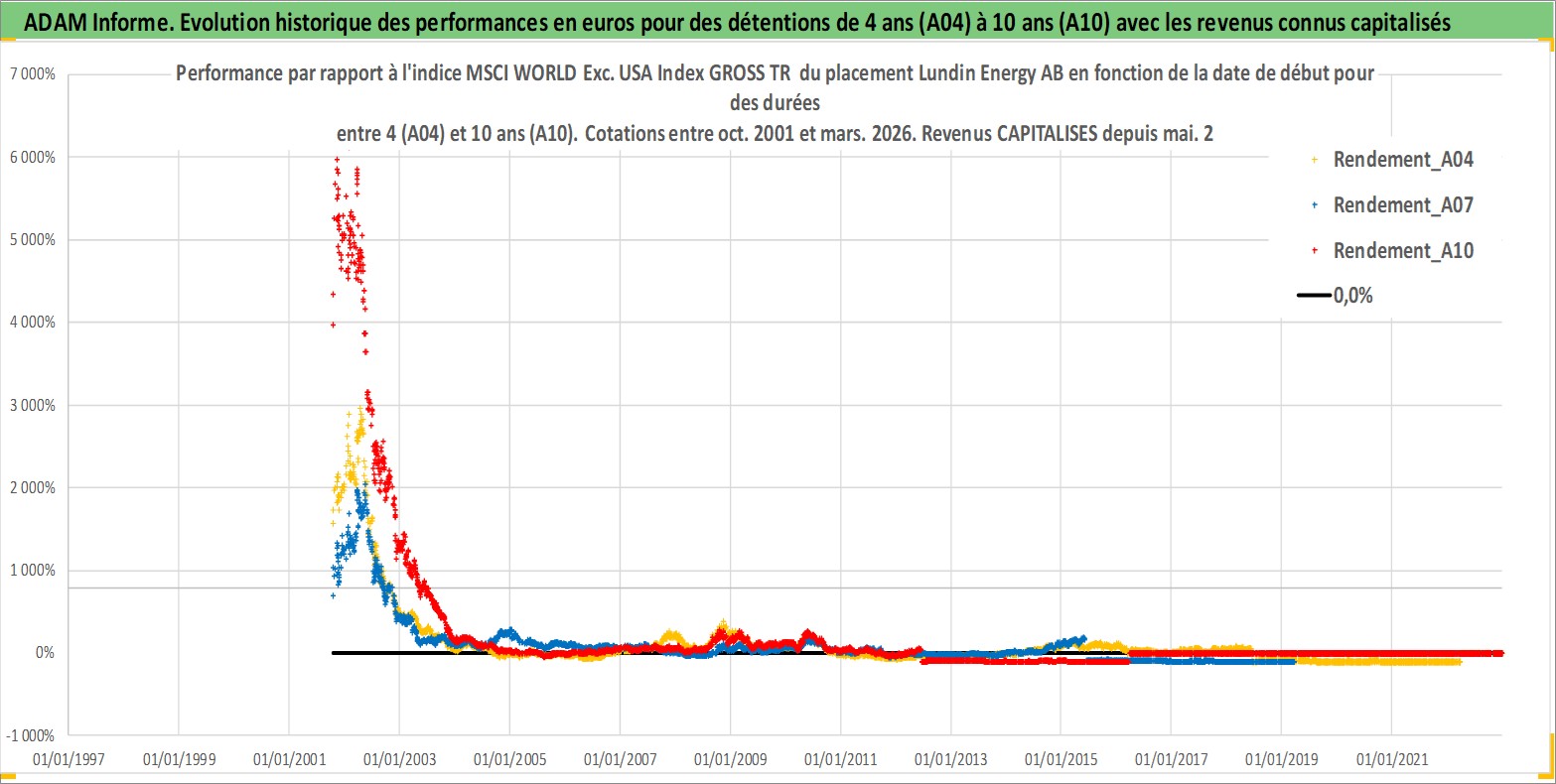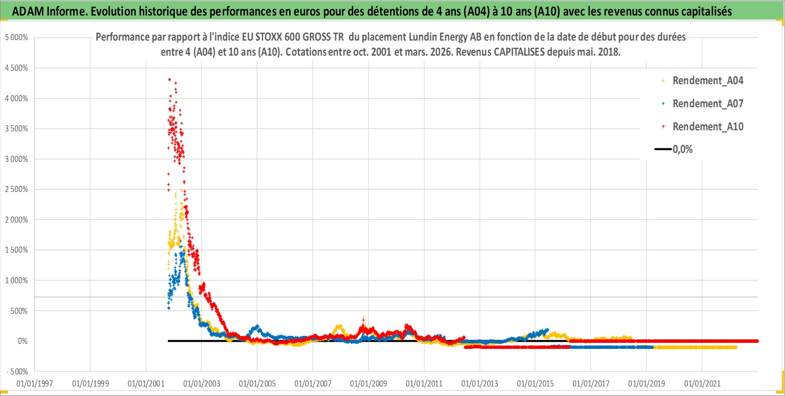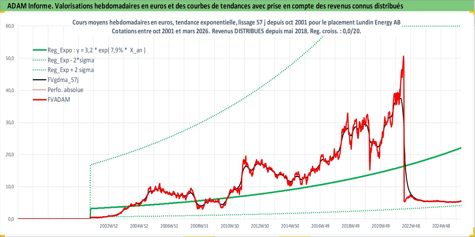 Site dédié aux investisseursPage dédiée sur site financeAnalyse des valorisations hebdomadaires de l'action Lundin Energy AB. Cet actif est cote en SEK. Les valorisations sont en contrevaleur EURO et couvrent les semaines 2001W41 a 2026W13. Les revenus de cet actif financier sont pris en compte depuis la semaine 2018W18. La note globale ESG de cet actif est estimee a 4.0 (apres rebasage entre 0 et 20).