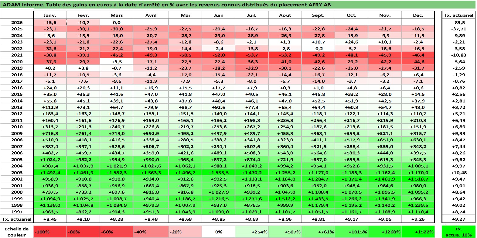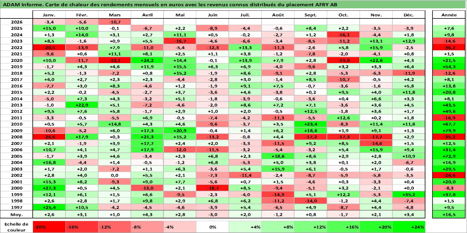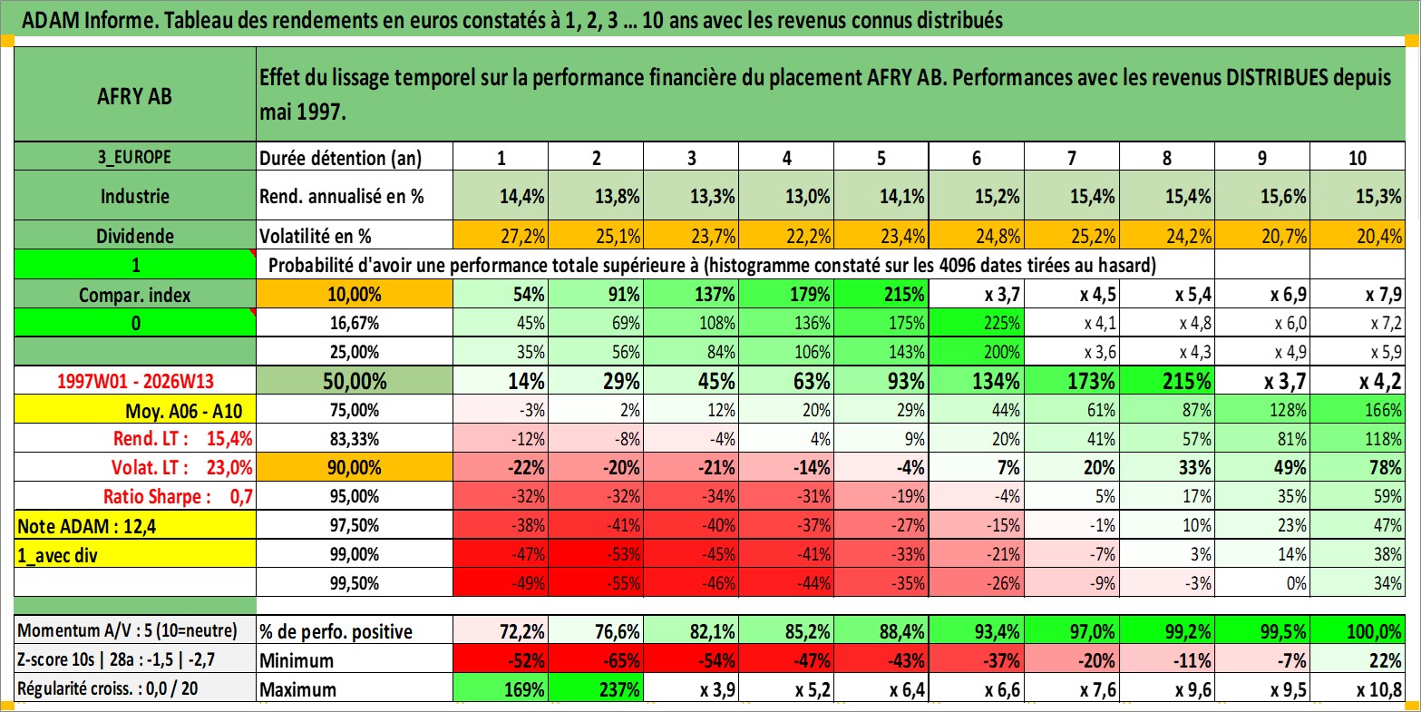 Site dédié aux investisseursPage dédiée sur site financeAnalyse des valorisations hebdomadaires de l'action AFRY AB. Cet actif est cote en SEK. Les valorisations sont en contrevaleur EURO et couvrent les semaines 1997W01 a 2026W13. Les revenus de cet actif financier sont pris en compte depuis la semaine 1997W19. La note ESG de cet actif n'est pas connue.