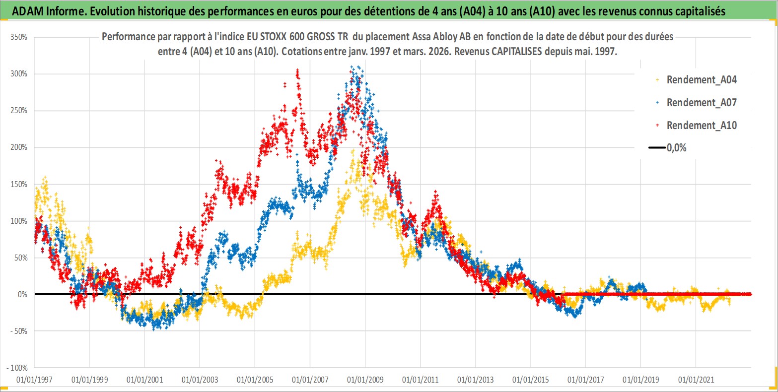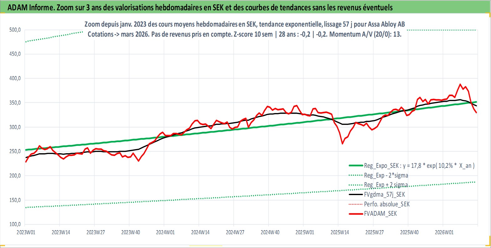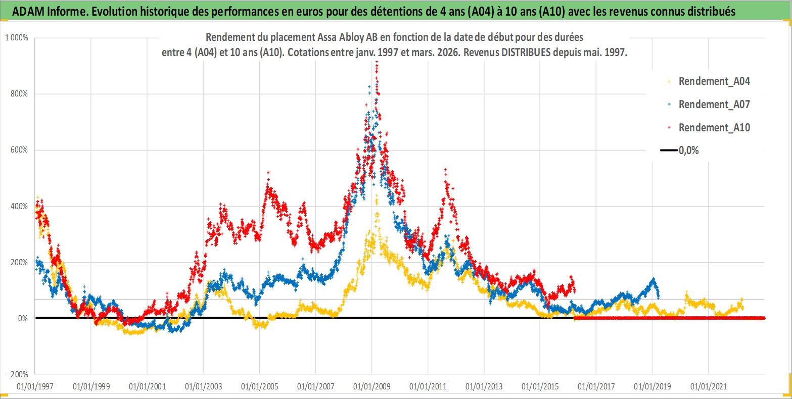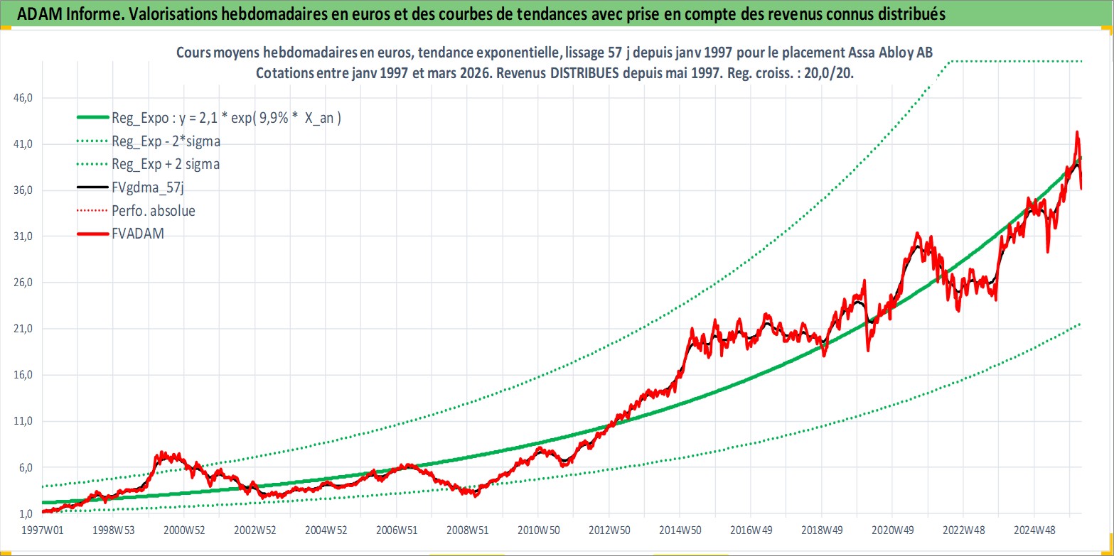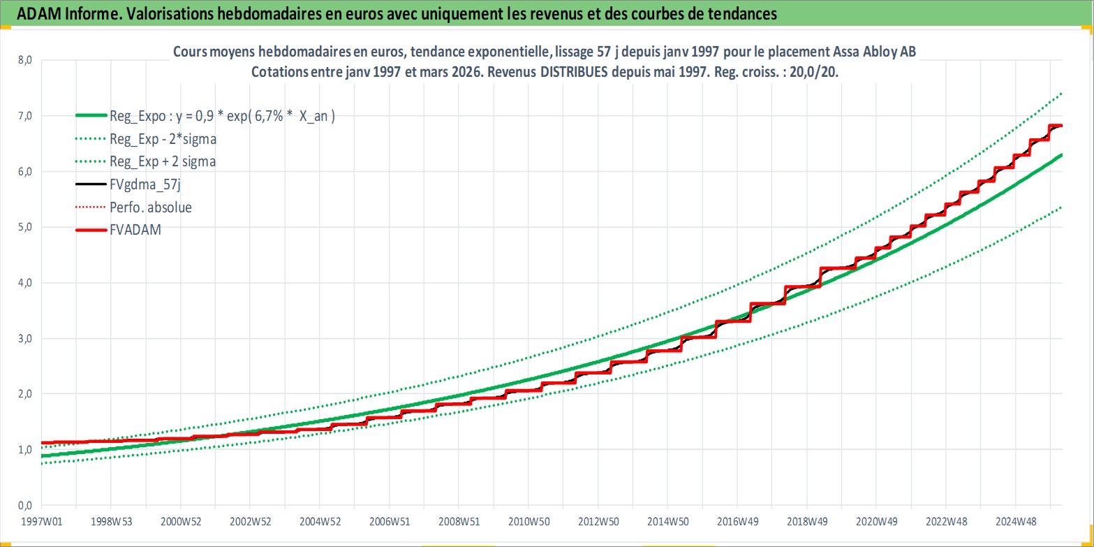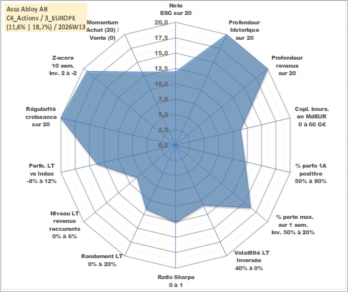 Site dédié aux investisseursPage dédiée sur site financeAnalyse des valorisations hebdomadaires de l'action Assa Abloy AB. Cet actif est cote en SEK. Les valorisations sont en contrevaleur EURO et couvrent les semaines 1997W01 a 2026W13. Les revenus de cet actif financier sont pris en compte depuis la semaine 1997W19. La note globale ESG de cet actif est estimee a 12.0 (apres rebasage entre 0 et 20).