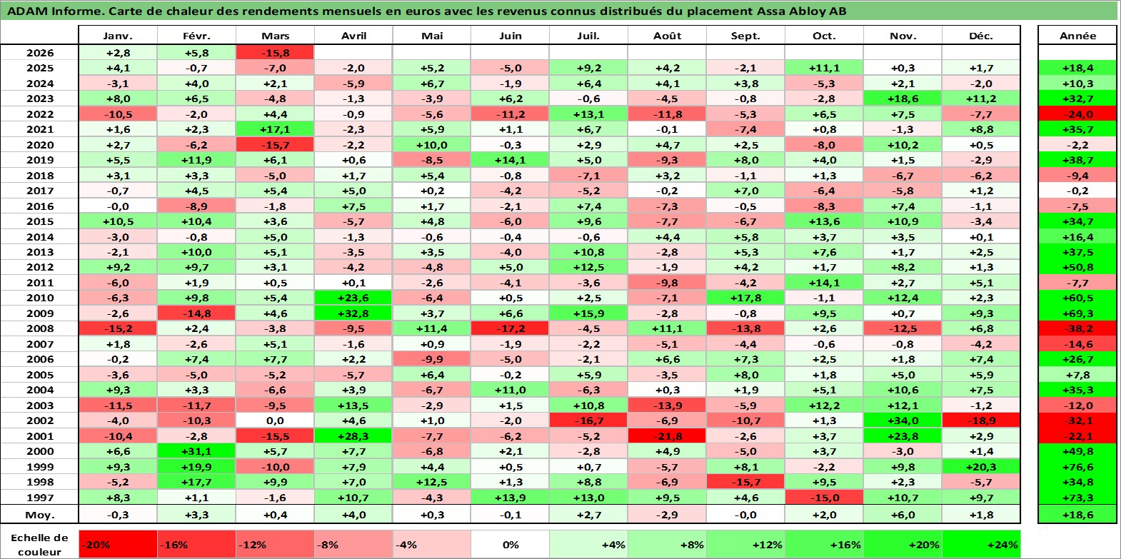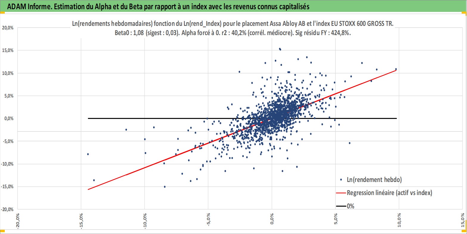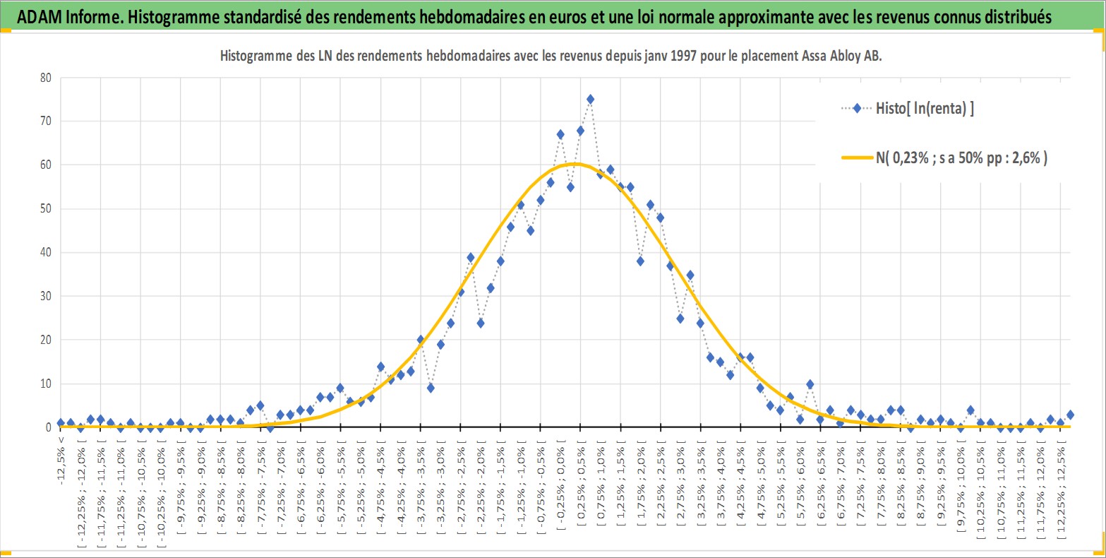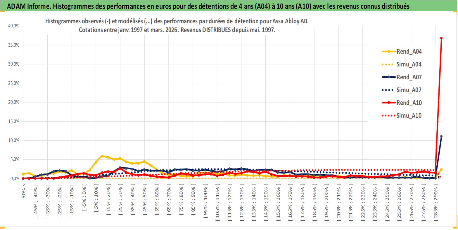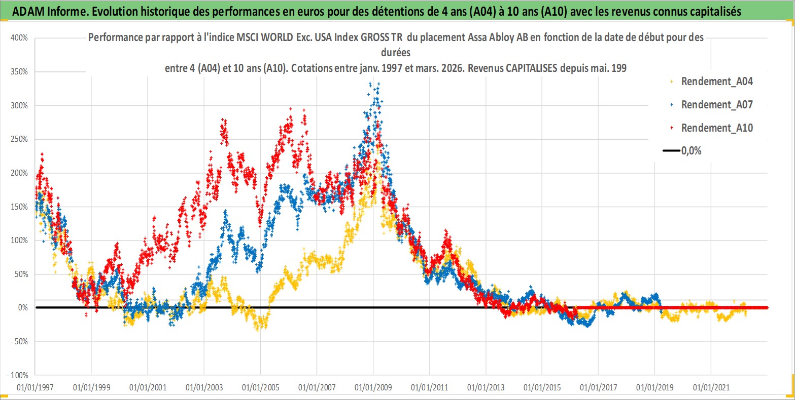 Site dédié aux investisseursPage dédiée sur site financeAnalyse des valorisations hebdomadaires de l'action Assa Abloy AB. Cet actif est cote en SEK. Les valorisations sont en contrevaleur EURO et couvrent les semaines 1997W01 a 2026W13. Les revenus de cet actif financier sont pris en compte depuis la semaine 1997W19. La note globale ESG de cet actif est estimee a 12.0 (apres rebasage entre 0 et 20).