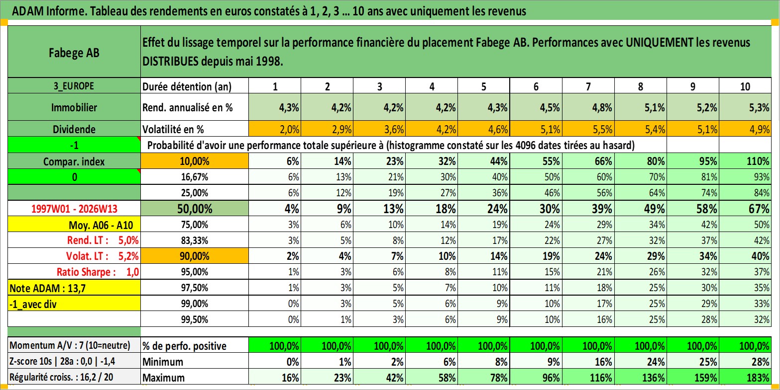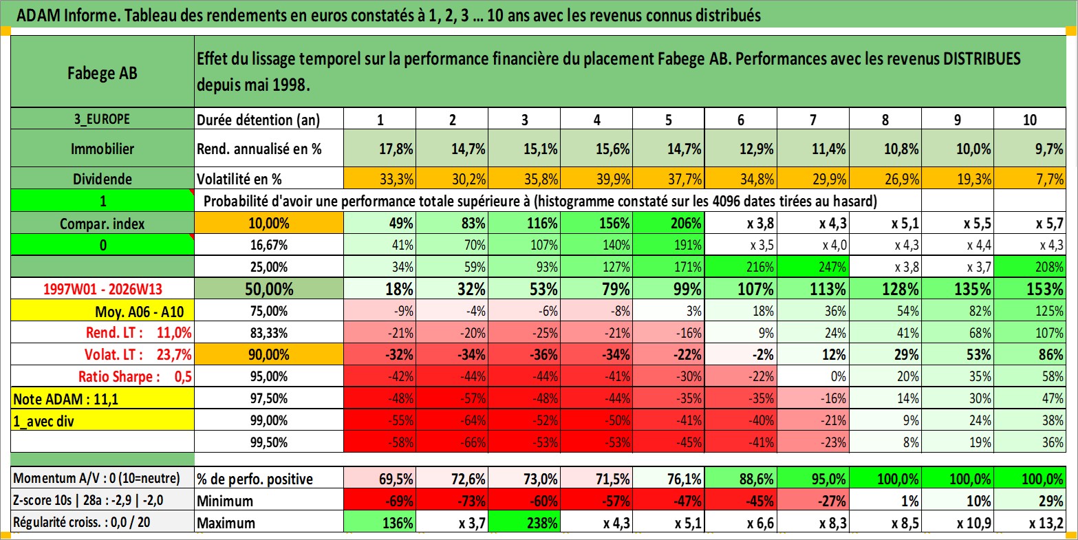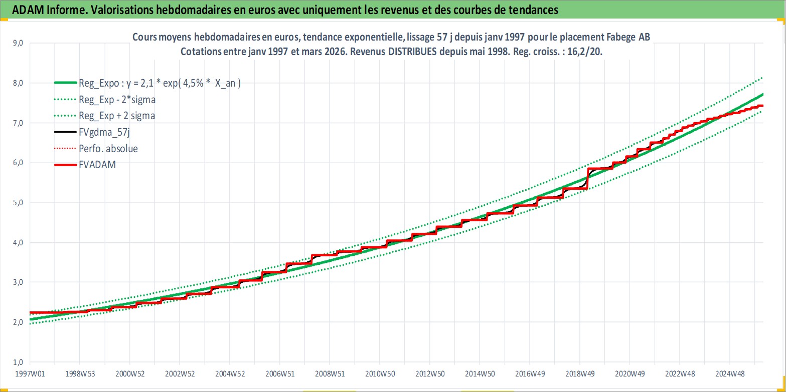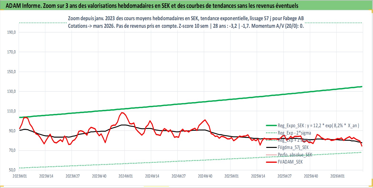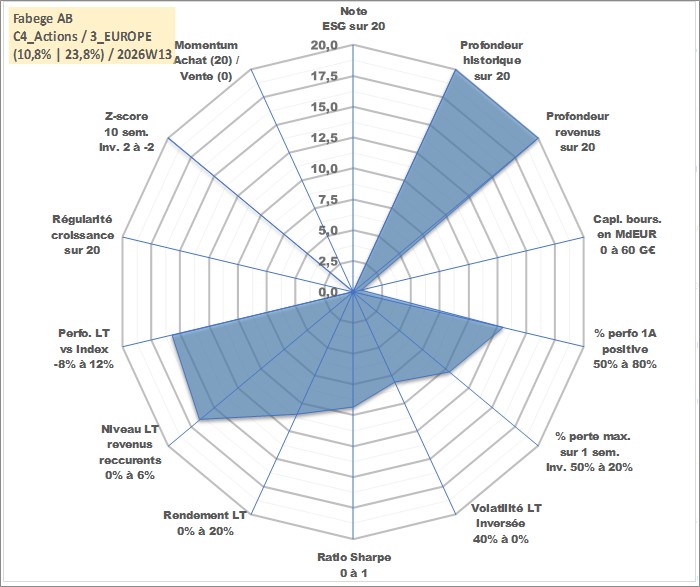 Site dédié aux investisseursPage dédiée sur site financeAnalyse des valorisations hebdomadaires de l'action Fabege AB. Cet actif est cote en SEK. Les valorisations sont en contrevaleur EURO et couvrent les semaines 1997W01 a 2026W13. Les revenus de cet actif financier sont pris en compte depuis la semaine 1998W19. La note ESG de cet actif n'est pas connue.