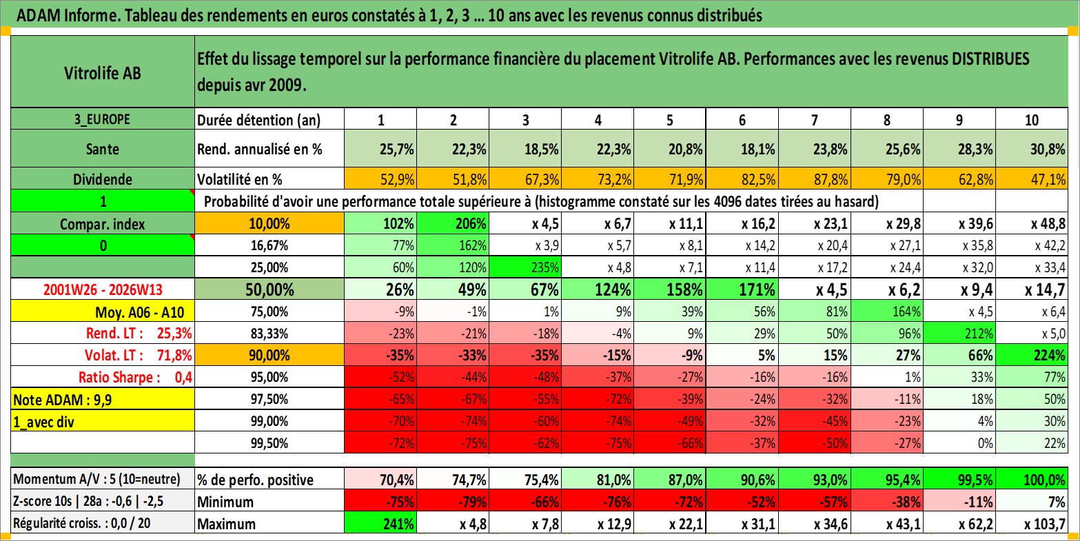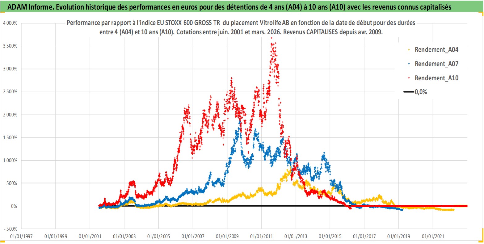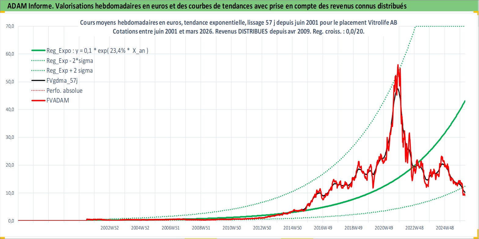 Site dédié aux investisseursPage dédiée sur site financeAnalyse des valorisations hebdomadaires de l'action Vitrolife AB. Cet actif est cote en SEK. Les valorisations sont en contrevaleur EURO et couvrent les semaines 2001W26 a 2026W13. Les revenus de cet actif financier sont pris en compte depuis la semaine 2009W18. La note ESG de cet actif n'est pas connue.