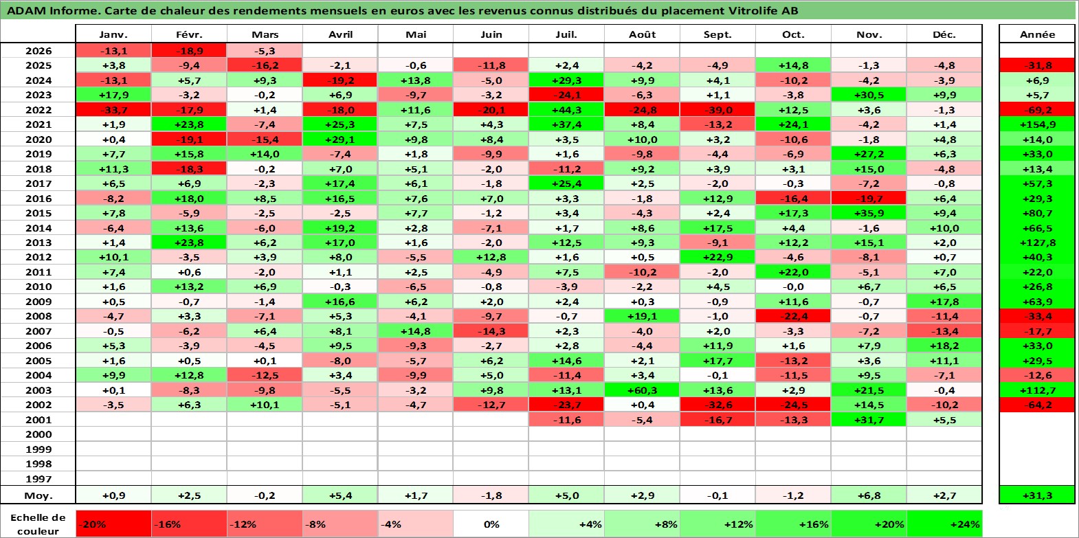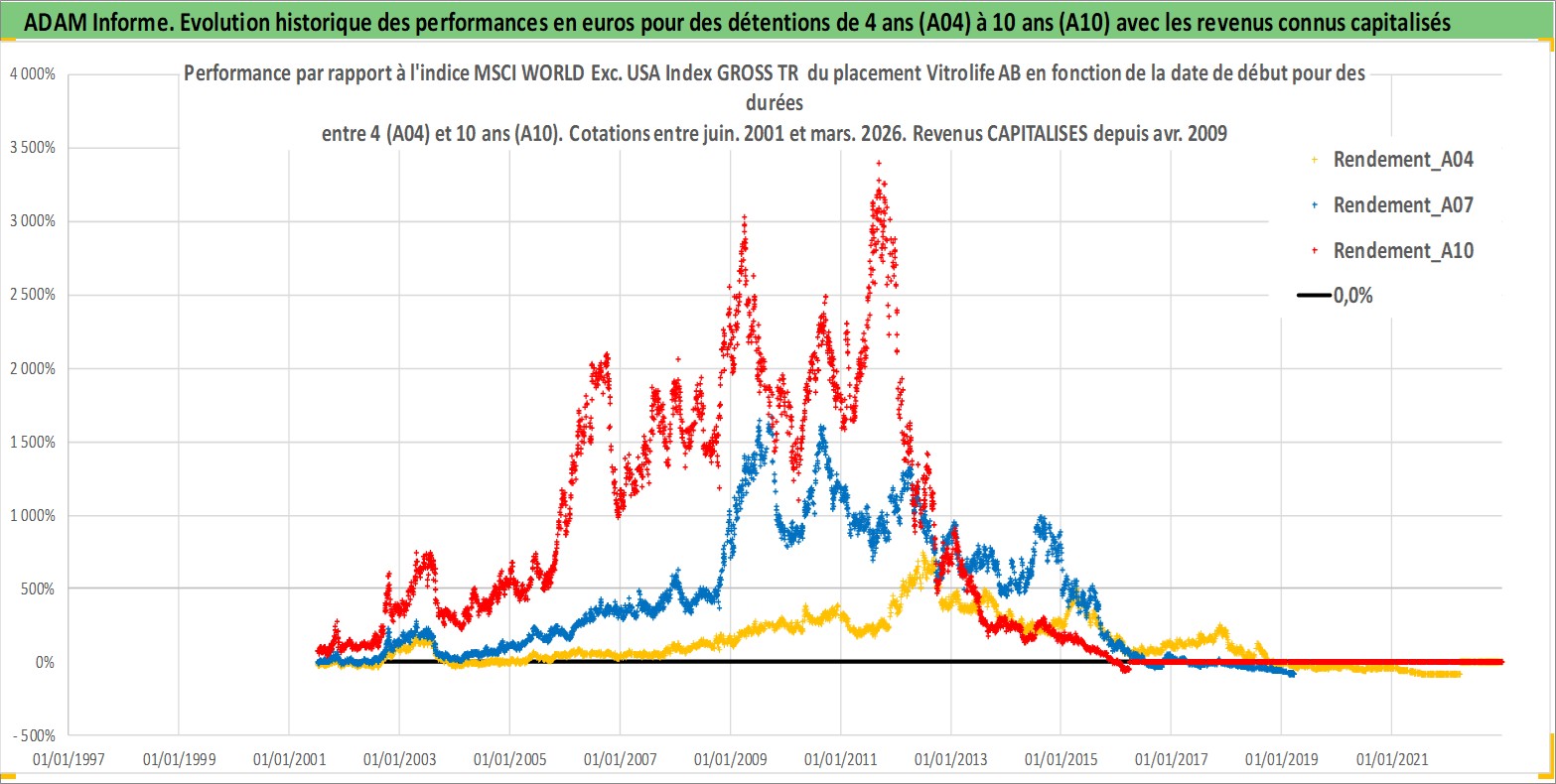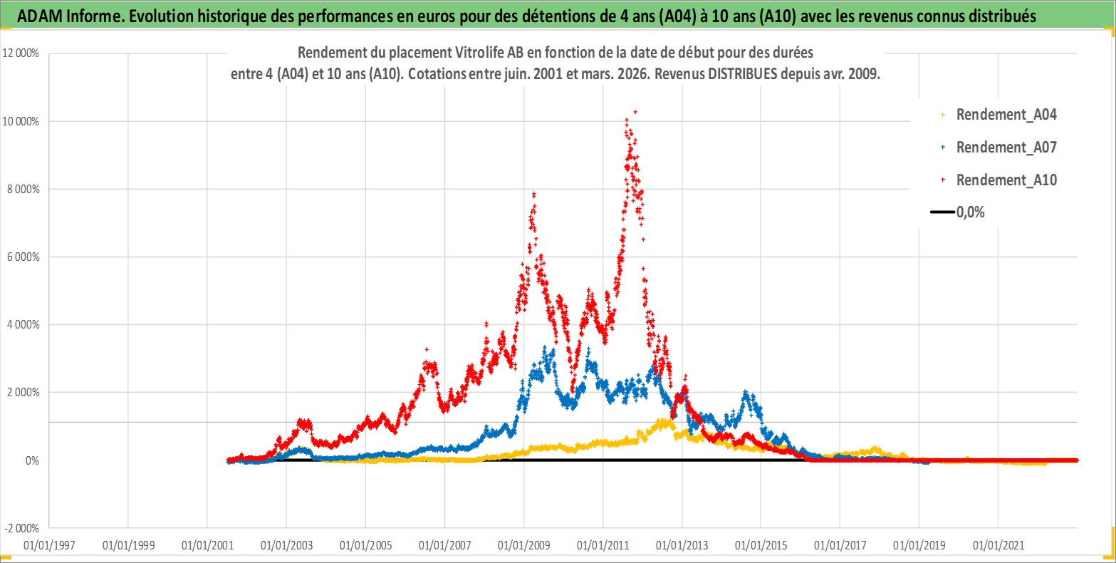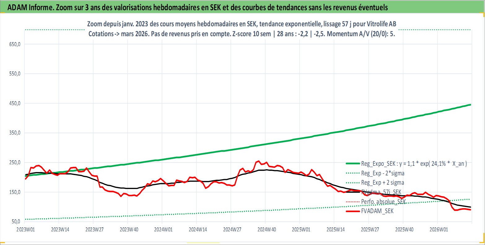 Site dédié aux investisseursPage dédiée sur site financeAnalyse des valorisations hebdomadaires de l'action Vitrolife AB. Cet actif est cote en SEK. Les valorisations sont en contrevaleur EURO et couvrent les semaines 2001W26 a 2026W13. Les revenus de cet actif financier sont pris en compte depuis la semaine 2009W18. La note ESG de cet actif n'est pas connue.