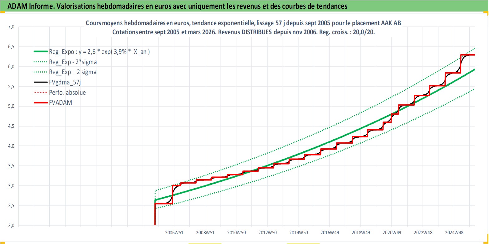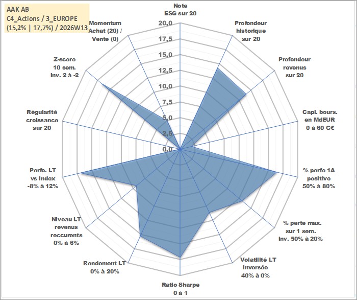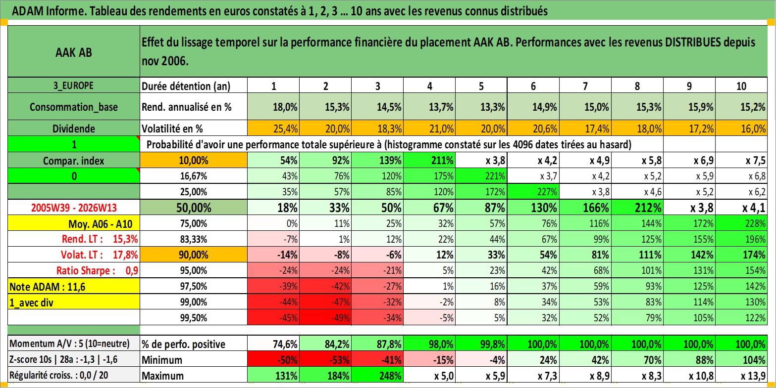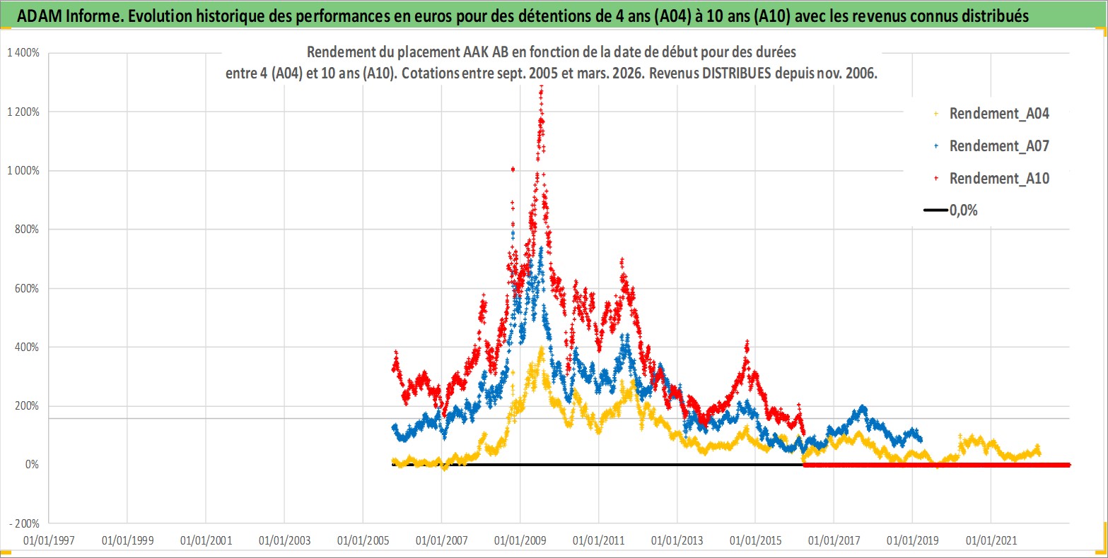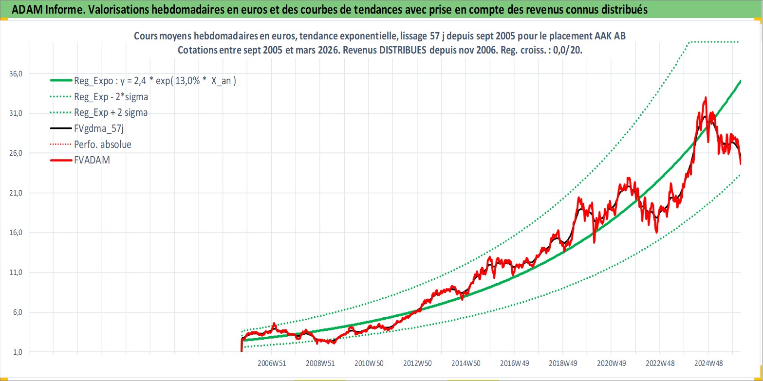 Site dédié aux investisseursPage dédiée sur site financeAnalyse des valorisations hebdomadaires de l'action AAK AB. Cet actif est cote en SEK. Les valorisations sont en contrevaleur EURO et couvrent les semaines 2005W39 a 2026W13. Les revenus de cet actif financier sont pris en compte depuis la semaine 2006W46. La note ESG de cet actif n'est pas connue.