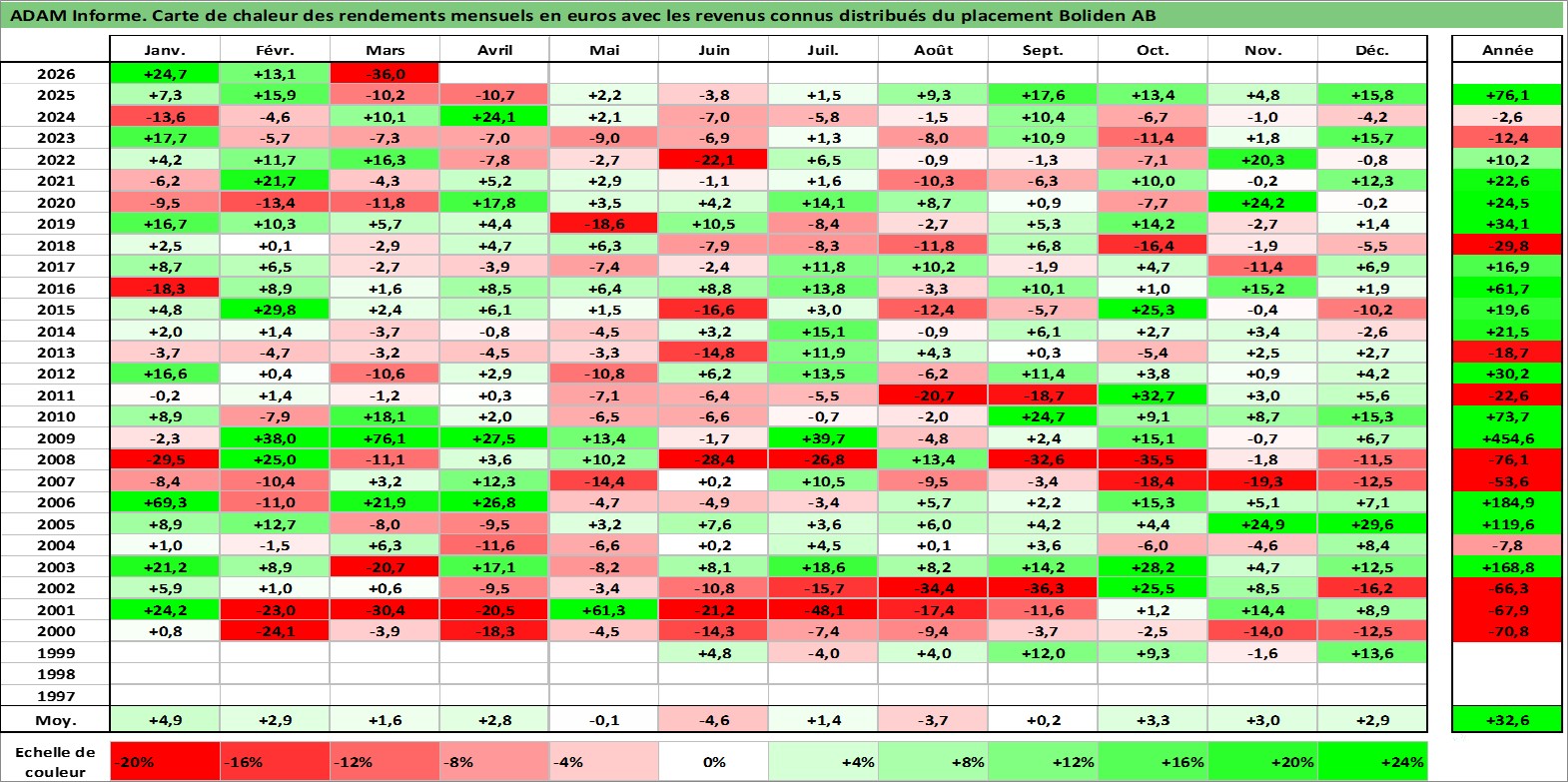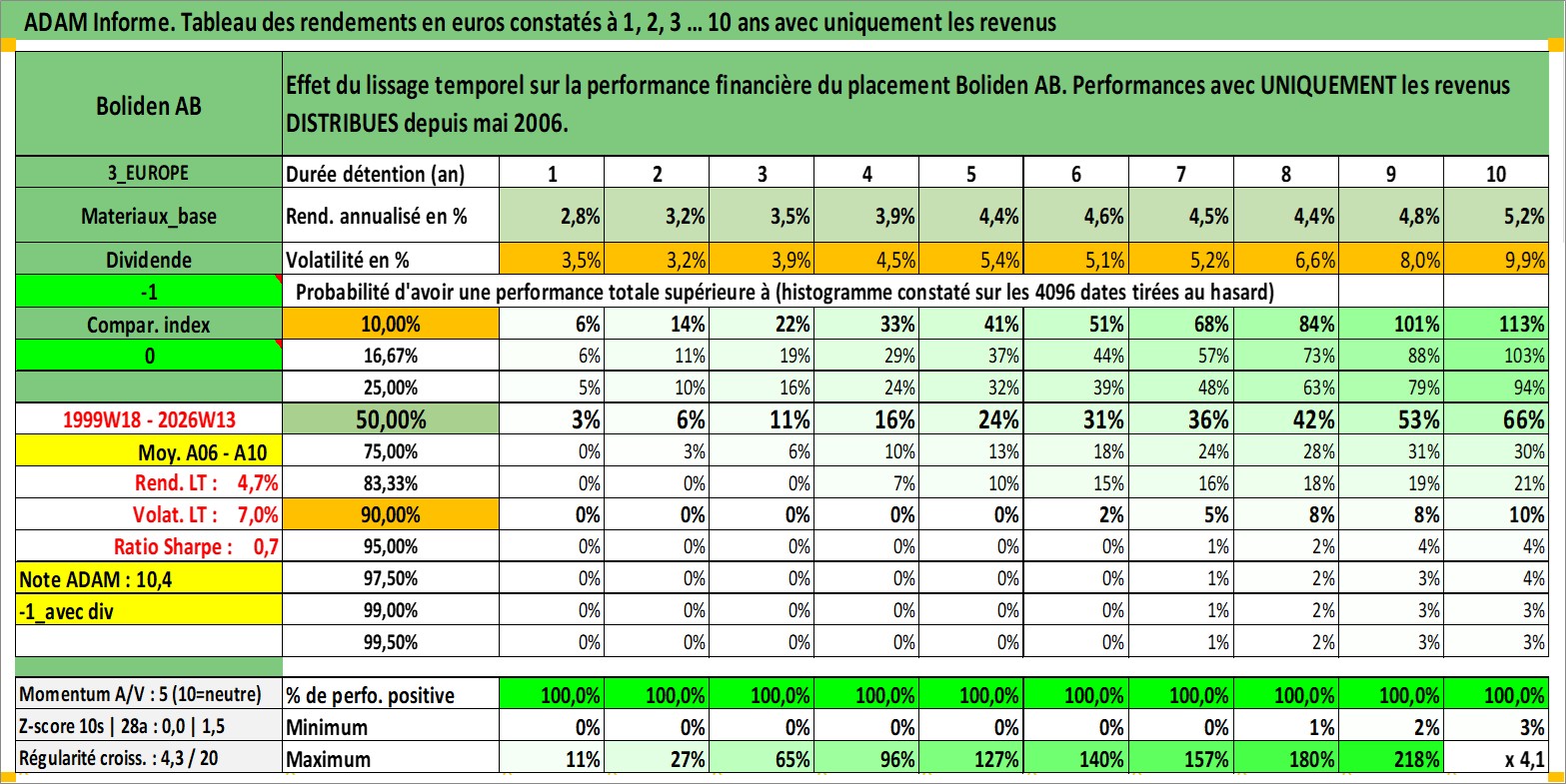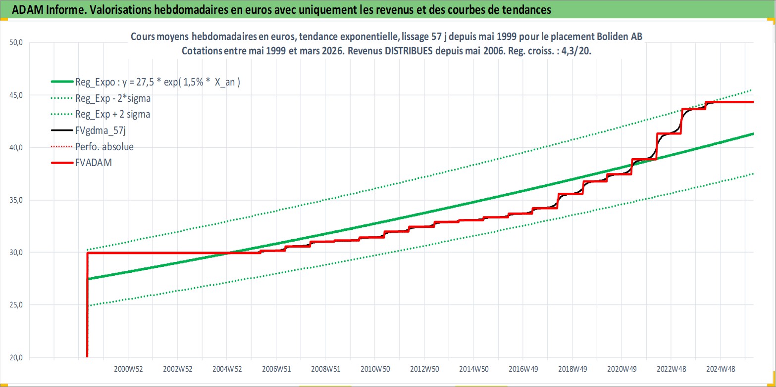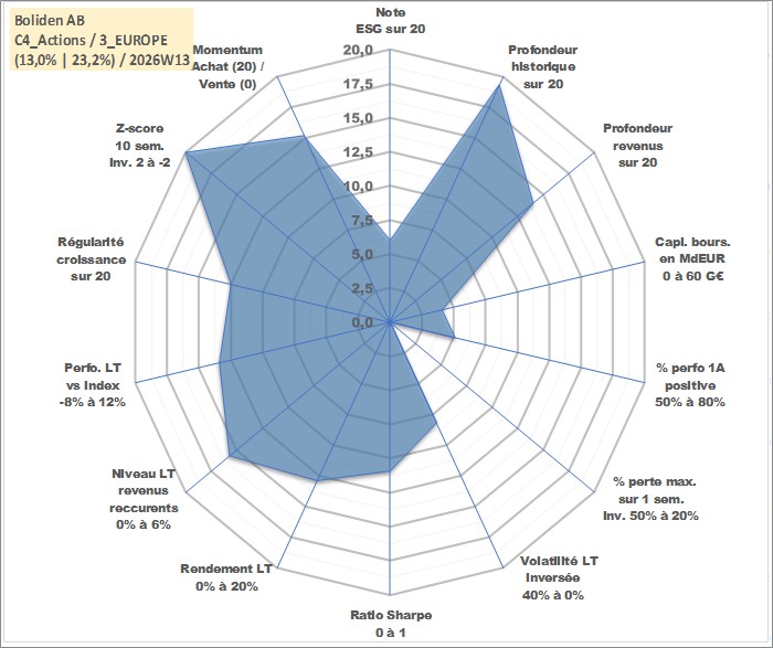Site dédié aux investisseursPage dédiée sur site financeAnalyse des valorisations hebdomadaires de l'action Boliden AB. Cet actif est cote en SEK. Les valorisations sont en contrevaleur EURO et couvrent les semaines 1999W18 a 2026W13. Les revenus de cet actif financier sont pris en compte depuis la semaine 2006W18. La note globale ESG de cet actif est estimee a 6.0 (apres rebasage entre 0 et 20).