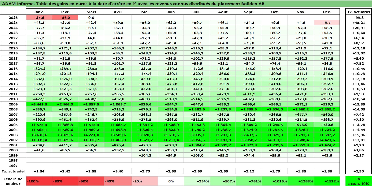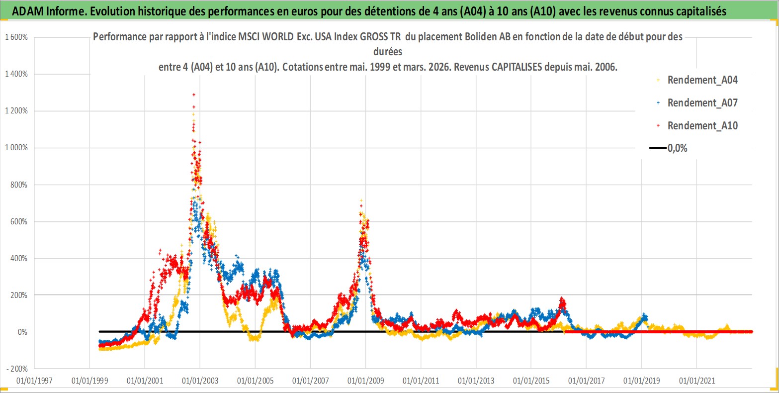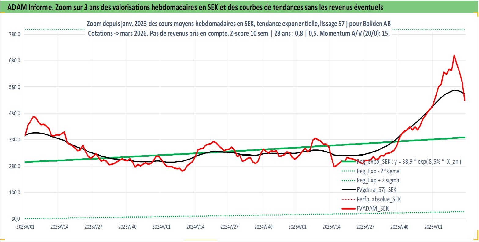 Site dédié aux investisseursPage dédiée sur site financeAnalyse des valorisations hebdomadaires de l'action Boliden AB. Cet actif est cote en SEK. Les valorisations sont en contrevaleur EURO et couvrent les semaines 1999W18 a 2026W13. Les revenus de cet actif financier sont pris en compte depuis la semaine 2006W18. La note globale ESG de cet actif est estimee a 6.0 (apres rebasage entre 0 et 20).
