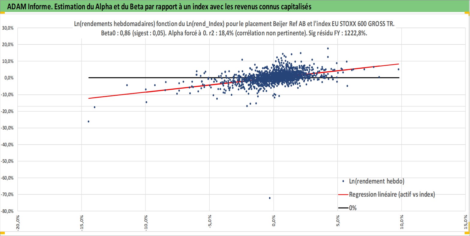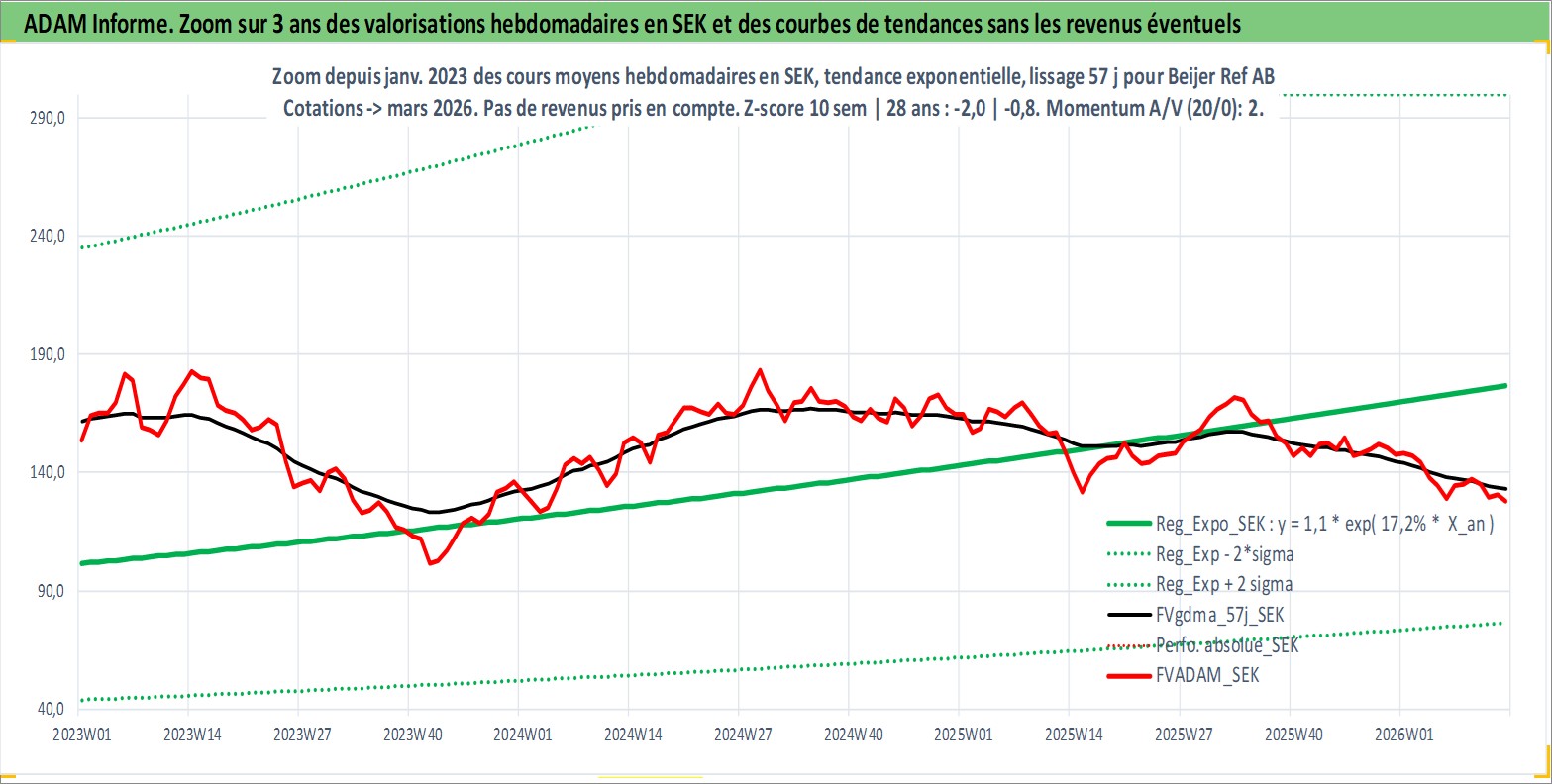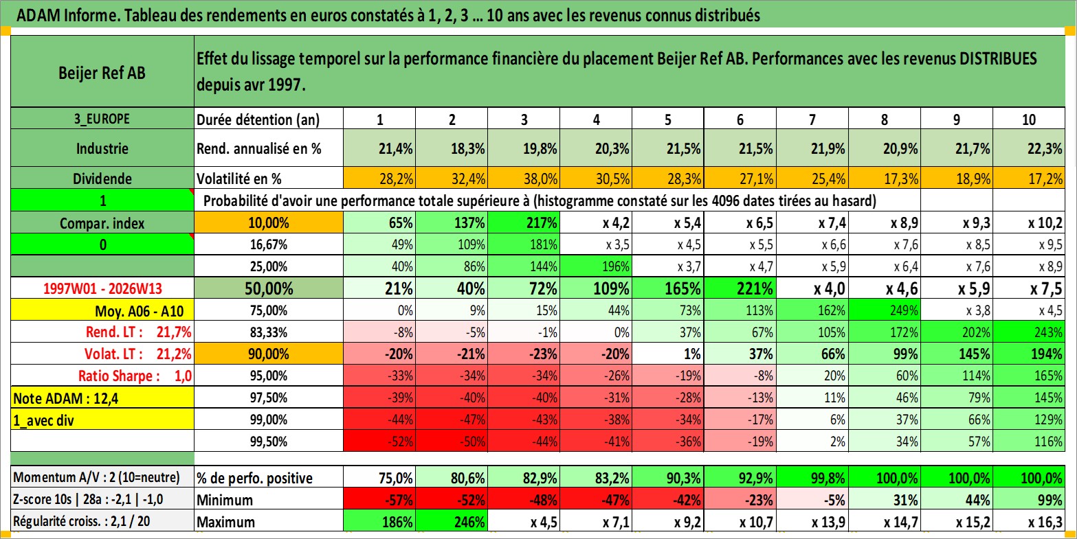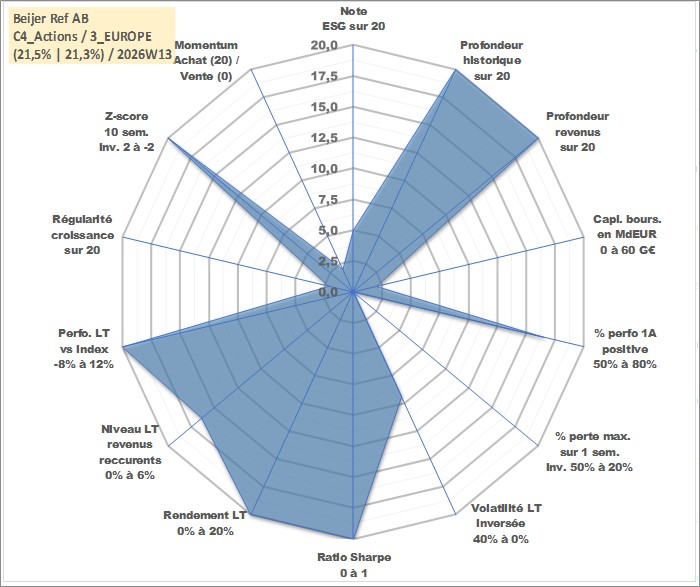 Site dédié aux investisseursPage dédiée sur site financeAnalyse des valorisations hebdomadaires de l'action Beijer Ref AB. Cet actif est cote en SEK. Les valorisations sont en contrevaleur EURO et couvrent les semaines 1997W01 a 2026W13. Les revenus de cet actif financier sont pris en compte depuis la semaine 1997W17. La note globale ESG de cet actif est estimee a 5.0 (apres rebasage entre 0 et 20).