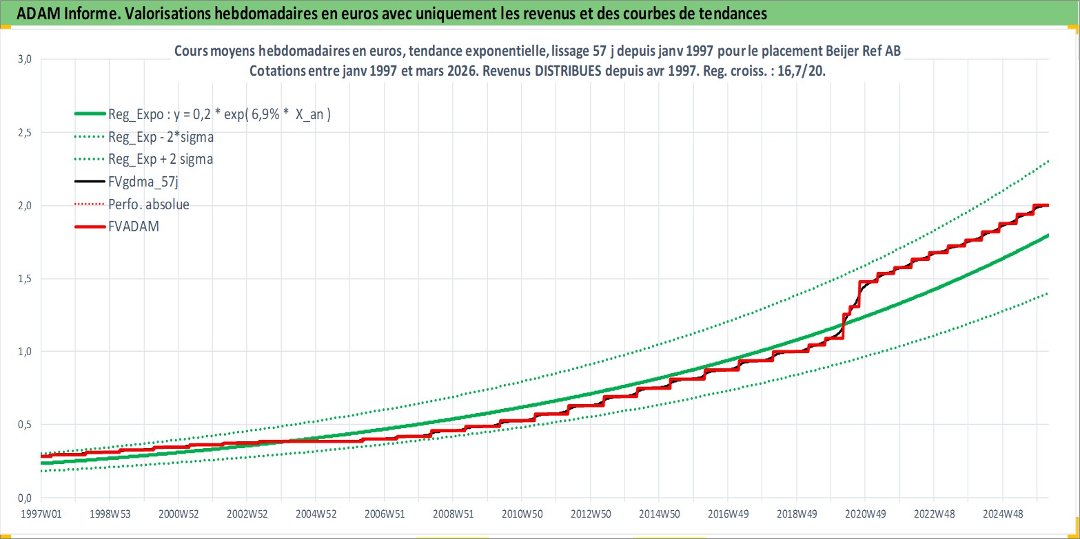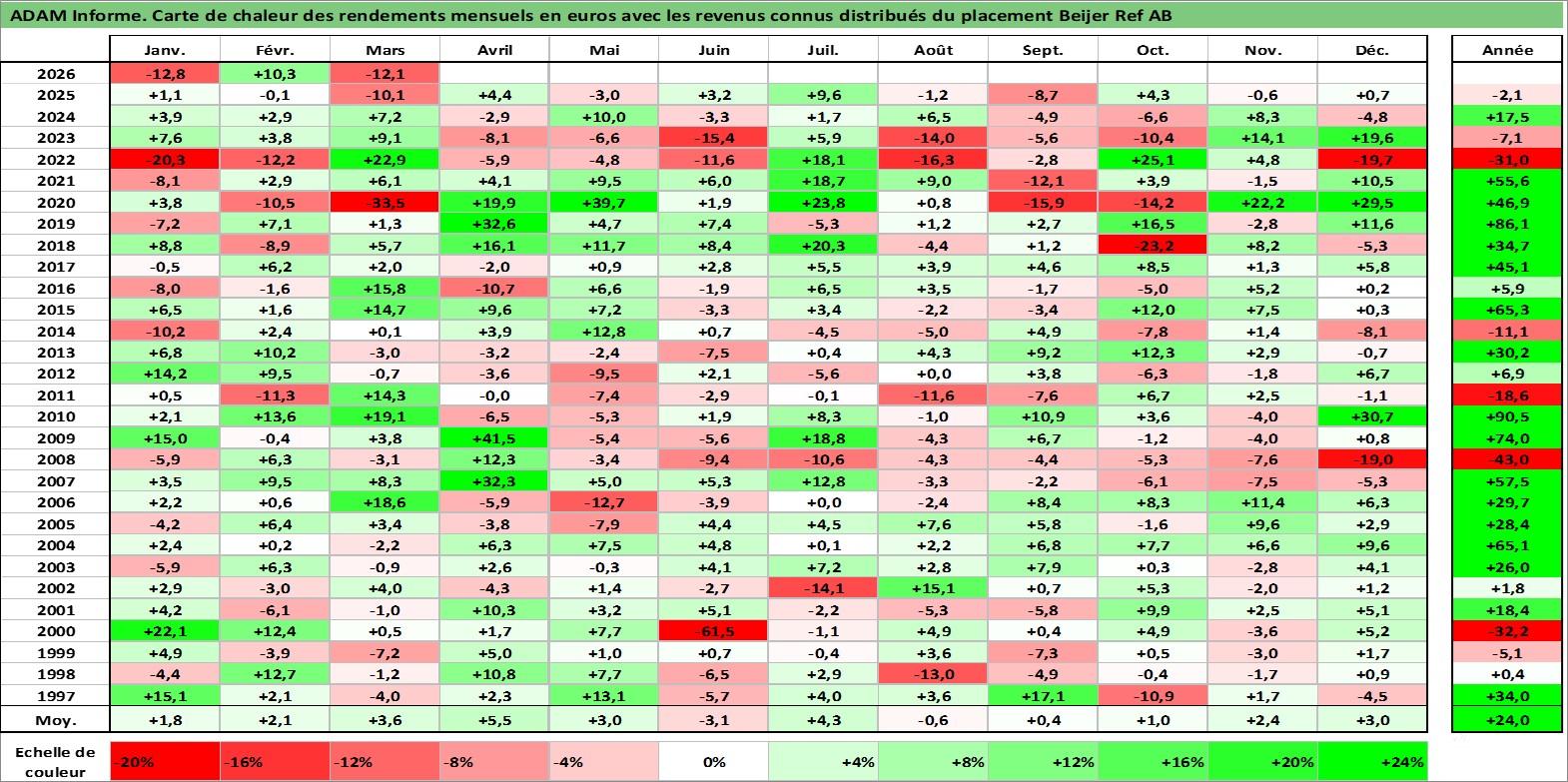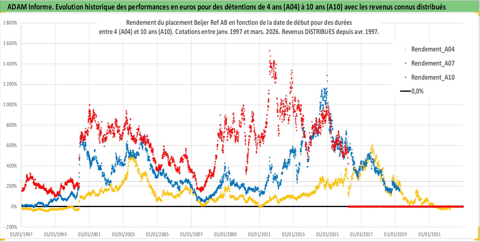 Site dédié aux investisseursPage dédiée sur site financeAnalyse des valorisations hebdomadaires de l'action Beijer Ref AB. Cet actif est cote en SEK. Les valorisations sont en contrevaleur EURO et couvrent les semaines 1997W01 a 2026W13. Les revenus de cet actif financier sont pris en compte depuis la semaine 1997W17. La note globale ESG de cet actif est estimee a 5.0 (apres rebasage entre 0 et 20).