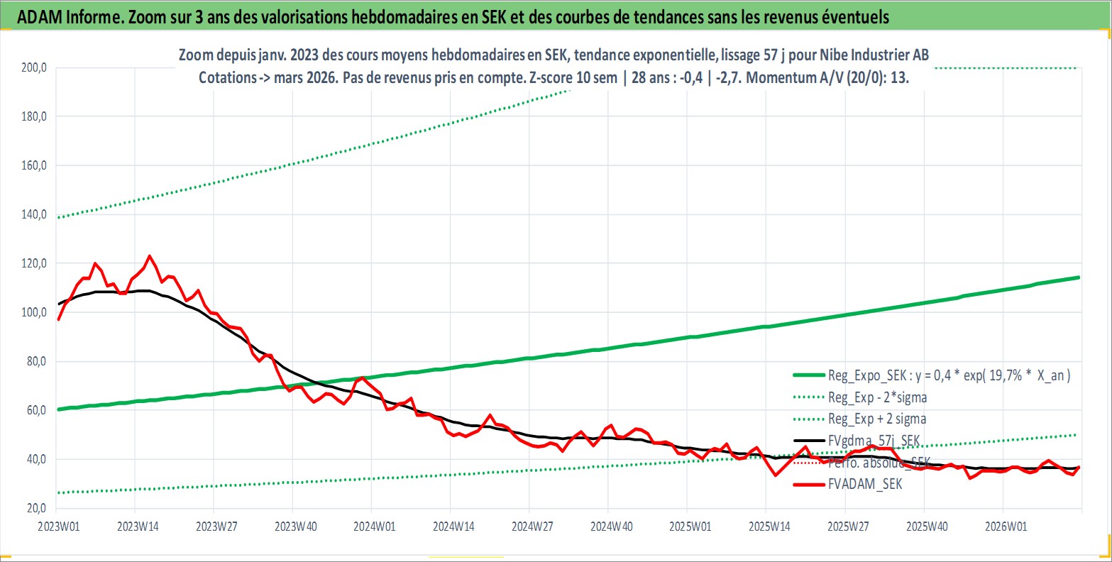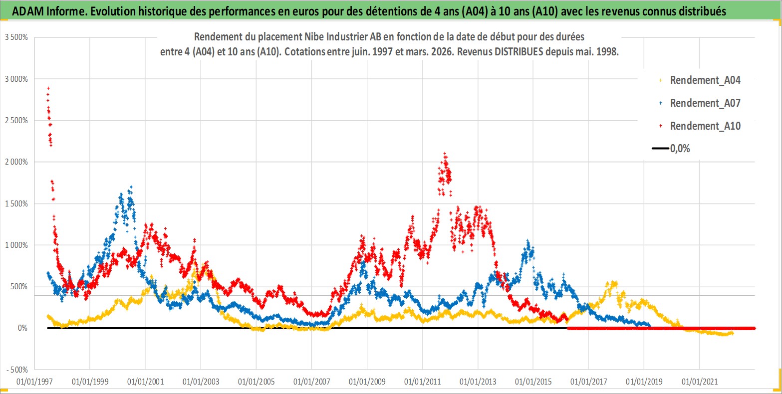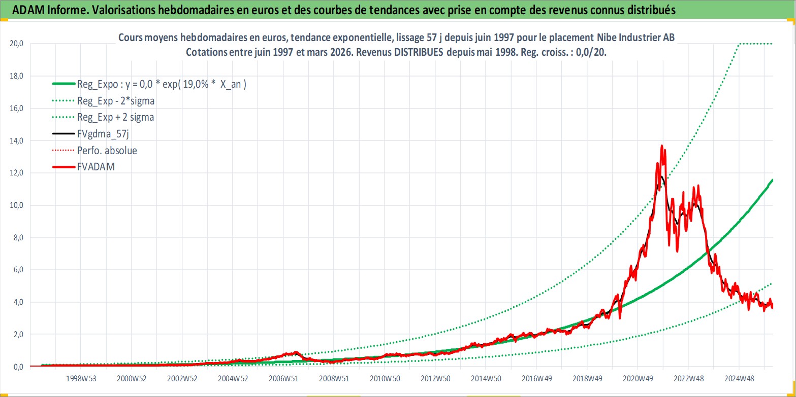 Site dédié aux investisseursPage dédiée sur site financeAnalyse des valorisations hebdomadaires de l'action Nibe Industrier AB. Cet actif est cote en SEK. Les valorisations sont en contrevaleur EURO et couvrent les semaines 1997W25 a 2026W13. Les revenus de cet actif financier sont pris en compte depuis la semaine 1998W19. La note ESG de cet actif n'est pas connue.