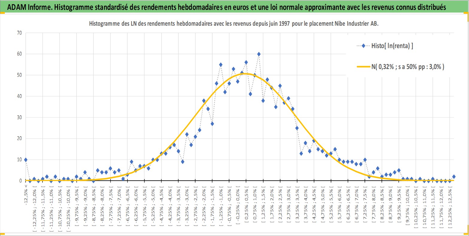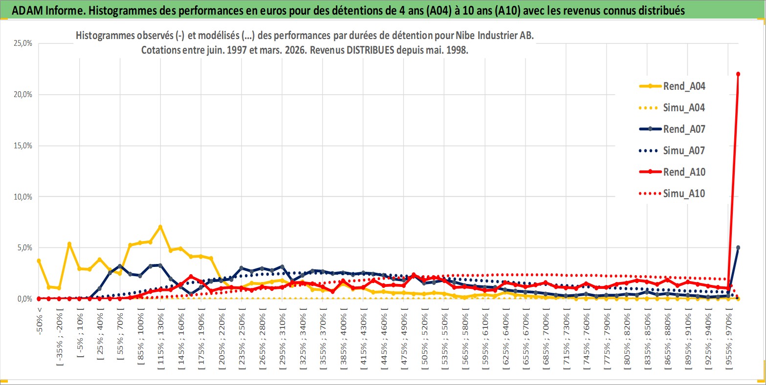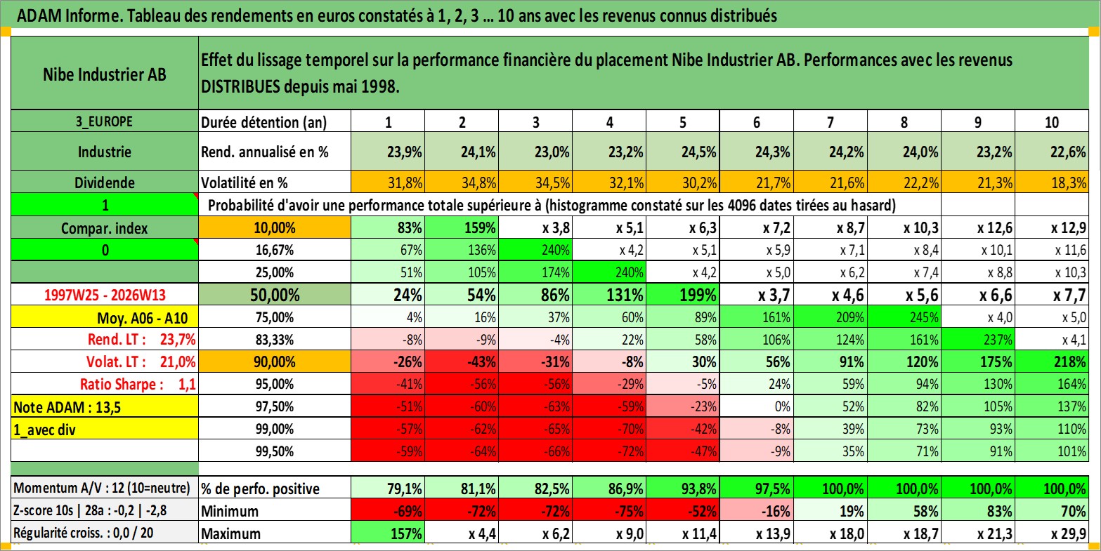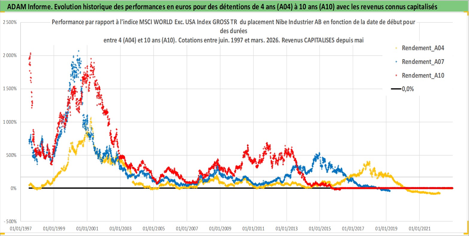 Site dédié aux investisseursPage dédiée sur site financeAnalyse des valorisations hebdomadaires de l'action Nibe Industrier AB. Cet actif est cote en SEK. Les valorisations sont en contrevaleur EURO et couvrent les semaines 1997W25 a 2026W13. Les revenus de cet actif financier sont pris en compte depuis la semaine 1998W19. La note ESG de cet actif n'est pas connue.