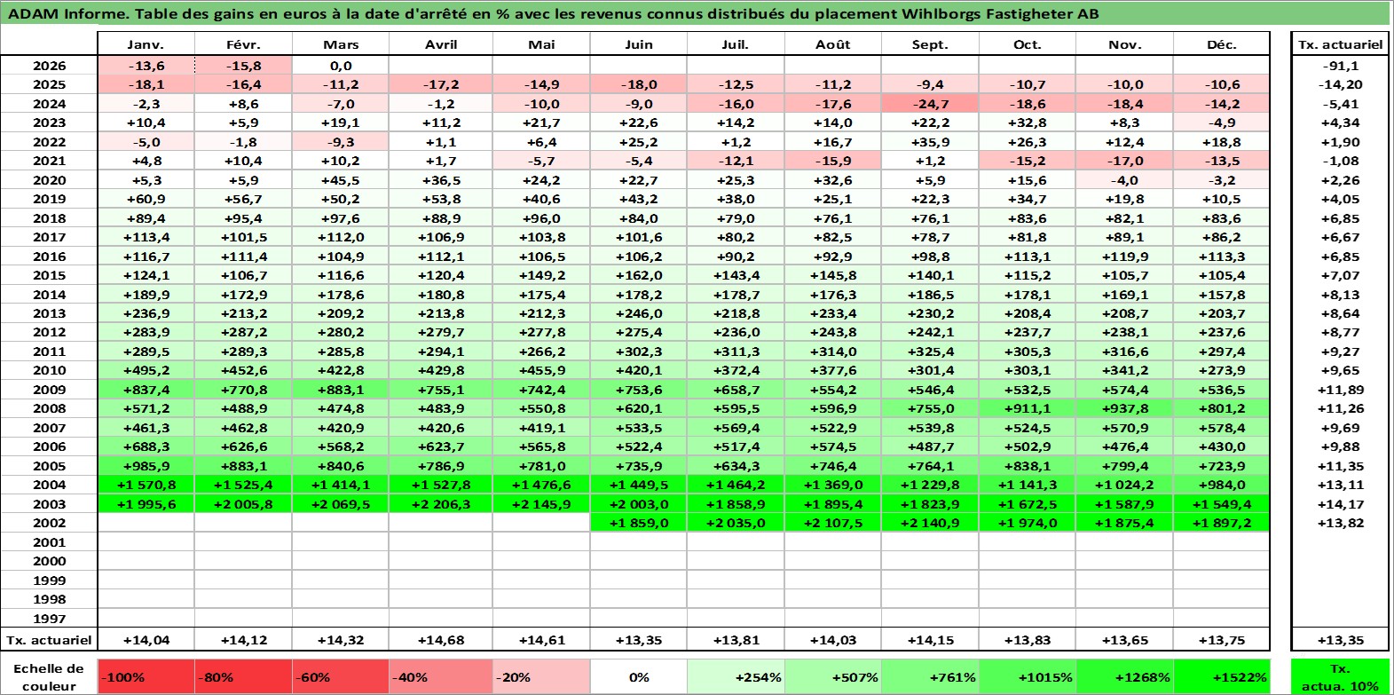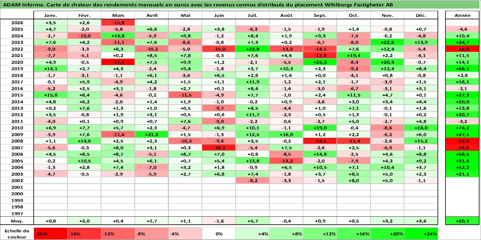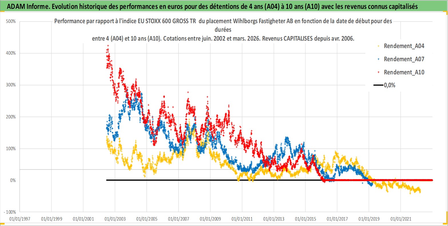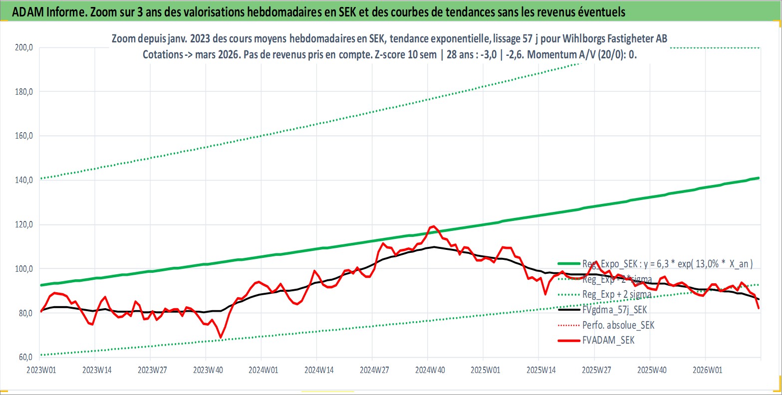 Site dédié aux investisseursPage dédiée sur site financeAnalyse des valorisations hebdomadaires de l'action Wihlborgs Fastigheter AB. Cet actif est cote en SEK. Les valorisations sont en contrevaleur EURO et couvrent les semaines 2002W24 a 2026W13. Les revenus de cet actif financier sont pris en compte depuis la semaine 2006W17. La note ESG de cet actif n'est pas connue.