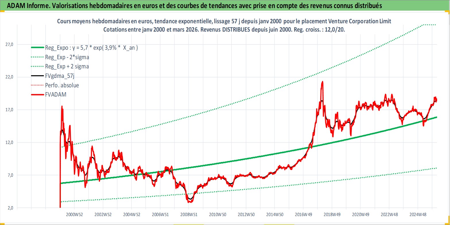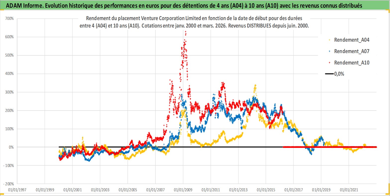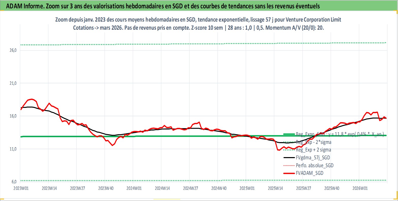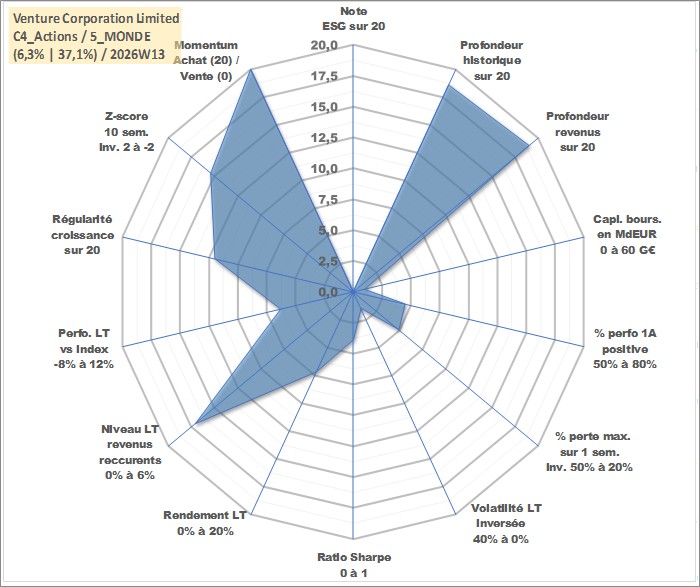 Site dédié aux investisseursPage dédiée sur site financeAnalyse des valorisations hebdomadaires de l'action Venture Corporation Limited. Cet actif est cote en SGD. Les valorisations sont en contrevaleur EURO et couvrent les semaines 2000W01 a 2026W13. Les revenus de cet actif financier sont pris en compte depuis la semaine 2000W26. La note ESG de cet actif n'est pas connue.