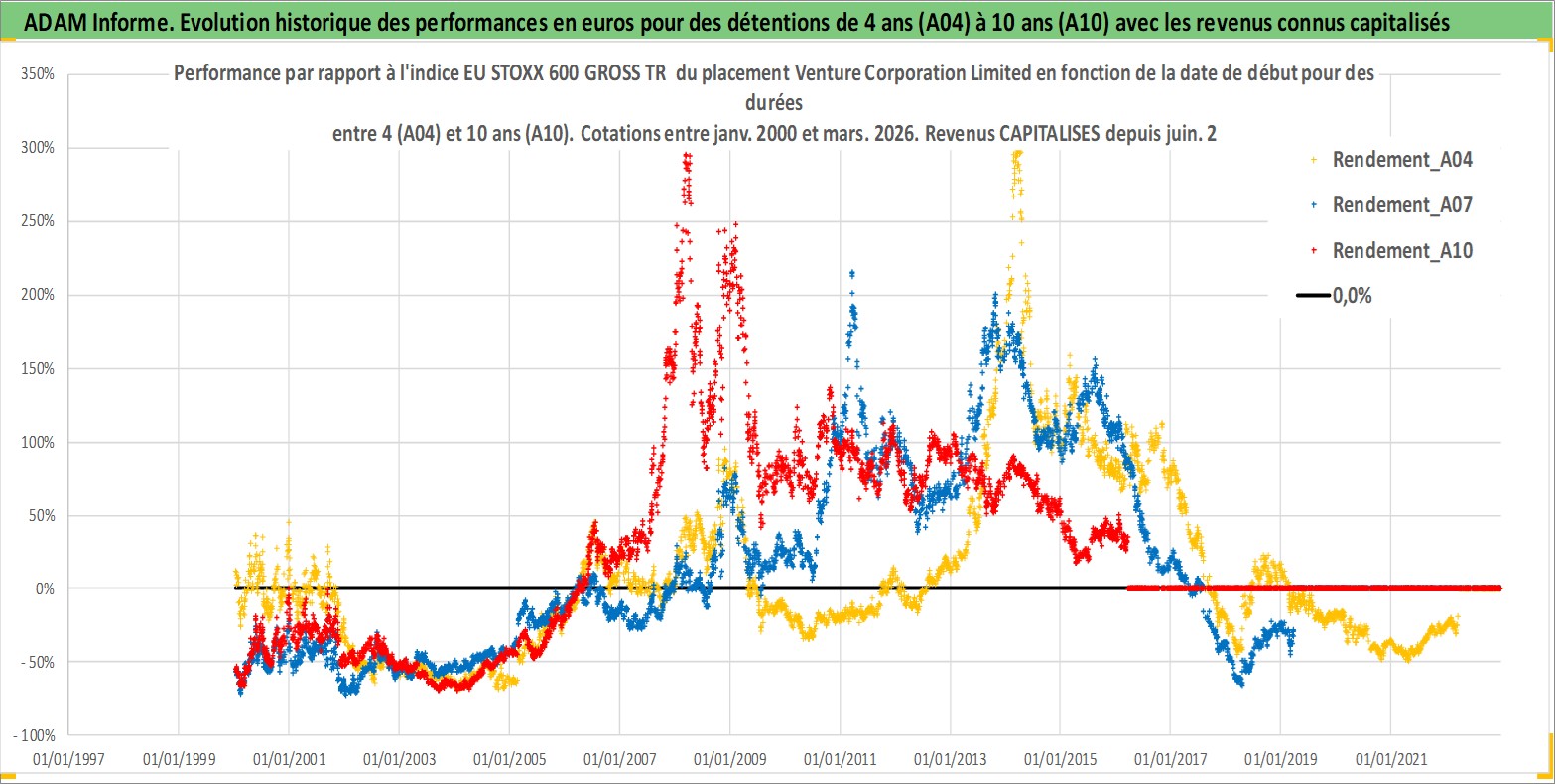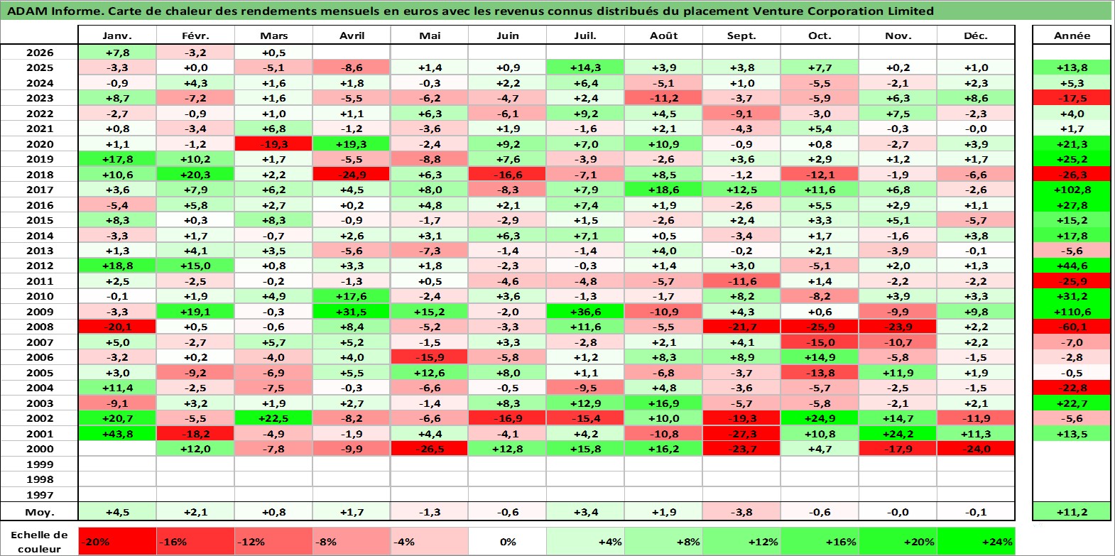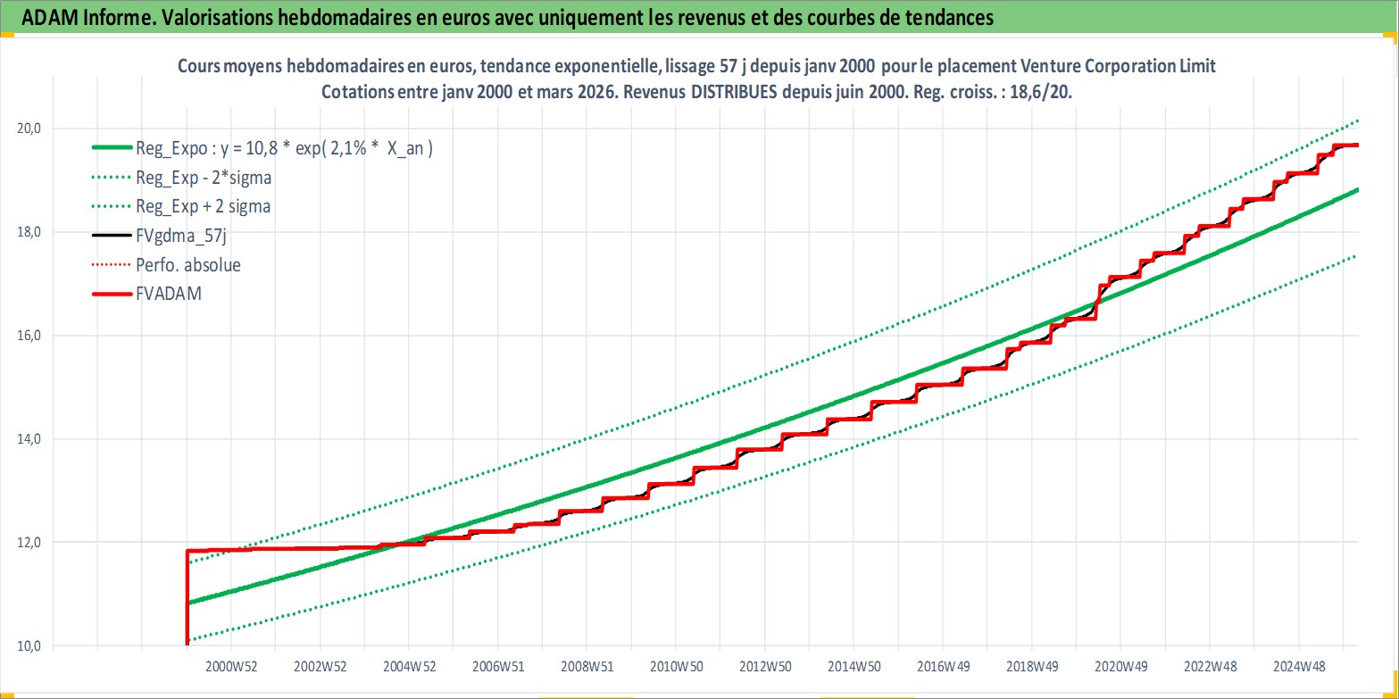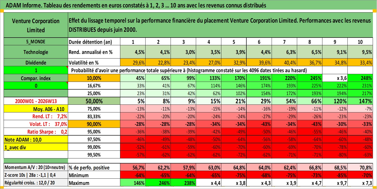 Site dédié aux investisseursPage dédiée sur site financeAnalyse des valorisations hebdomadaires de l'action Venture Corporation Limited. Cet actif est cote en SGD. Les valorisations sont en contrevaleur EURO et couvrent les semaines 2000W01 a 2026W13. Les revenus de cet actif financier sont pris en compte depuis la semaine 2000W26. La note ESG de cet actif n'est pas connue.