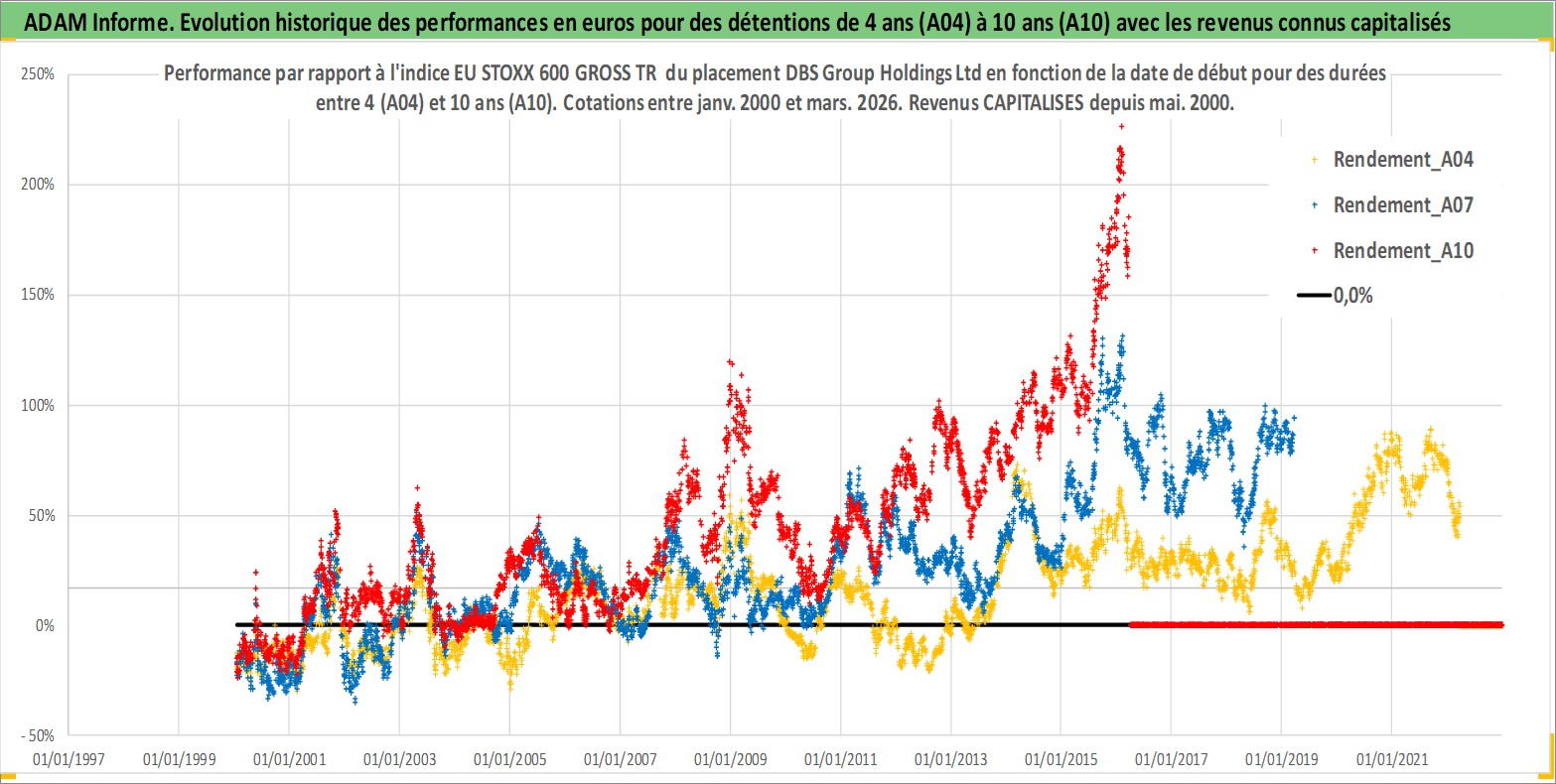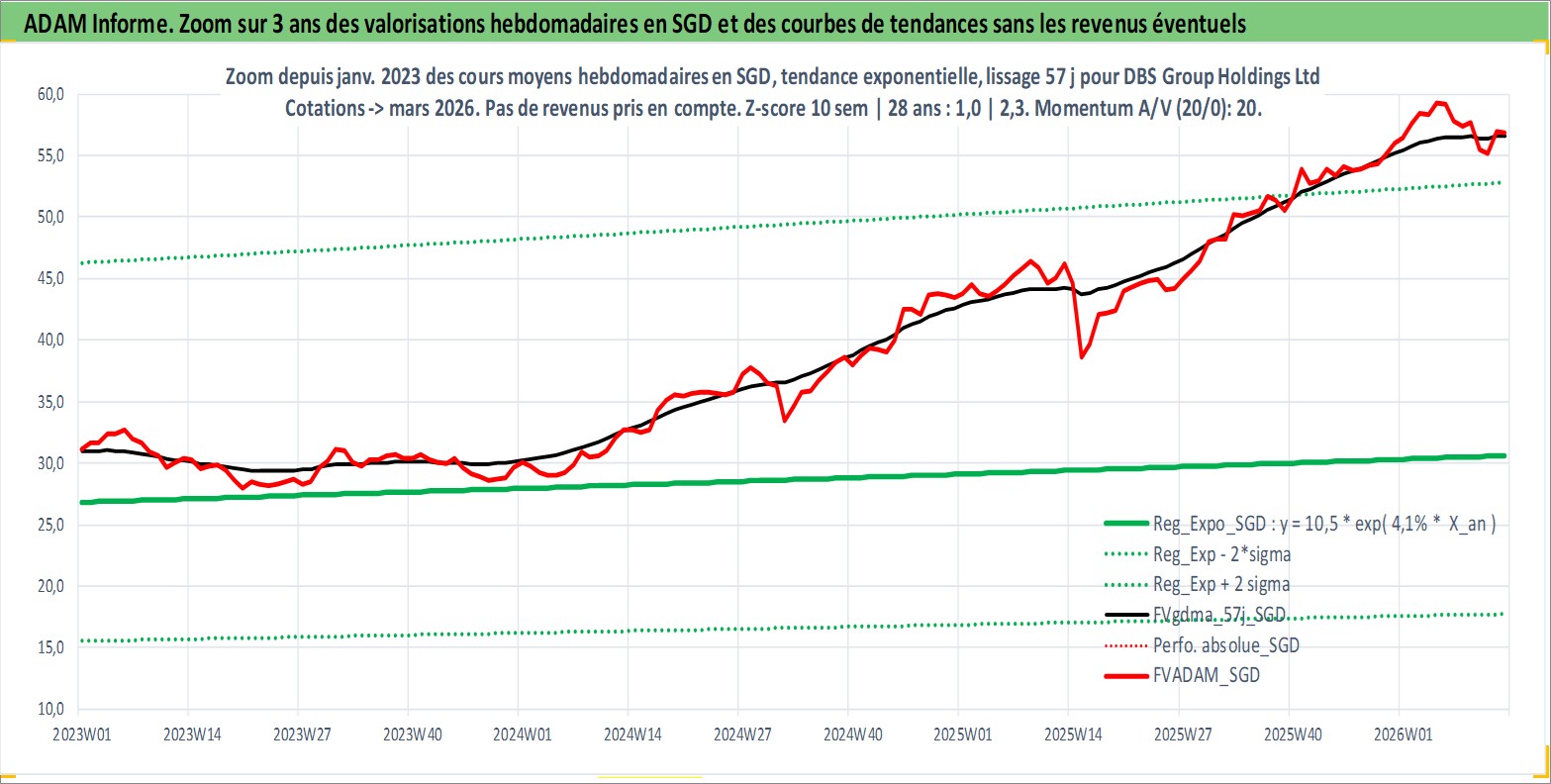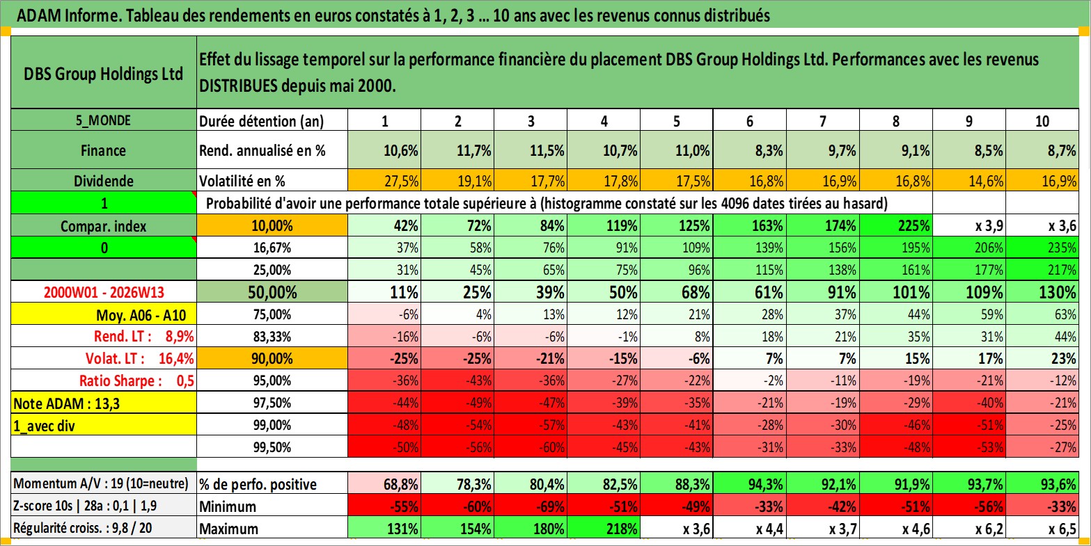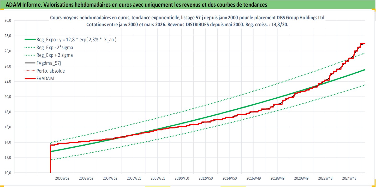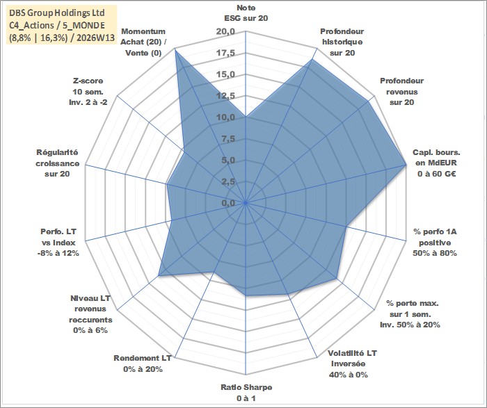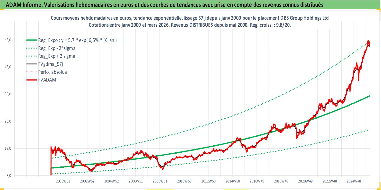 Site dédié aux investisseursPage dédiée sur site financeAnalyse des valorisations hebdomadaires de l'action DBS Group Holdings Ltd. Cet actif est cote en SGD. Les valorisations sont en contrevaleur EURO et couvrent les semaines 2000W01 a 2026W13. Les revenus de cet actif financier sont pris en compte depuis la semaine 2000W20. La note globale ESG de cet actif est estimee a 10.0 (apres rebasage entre 0 et 20).