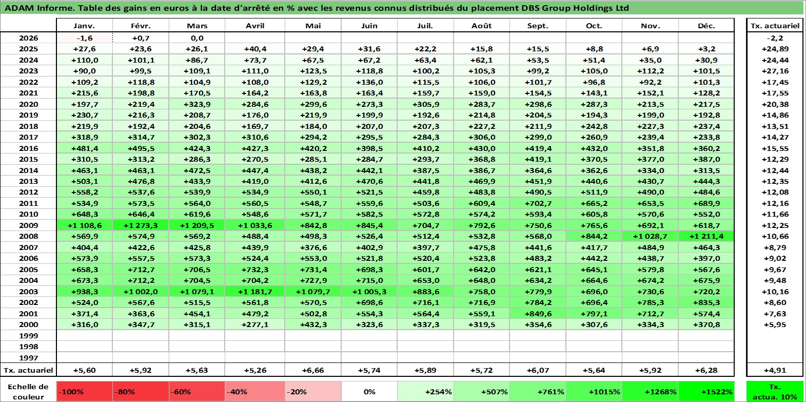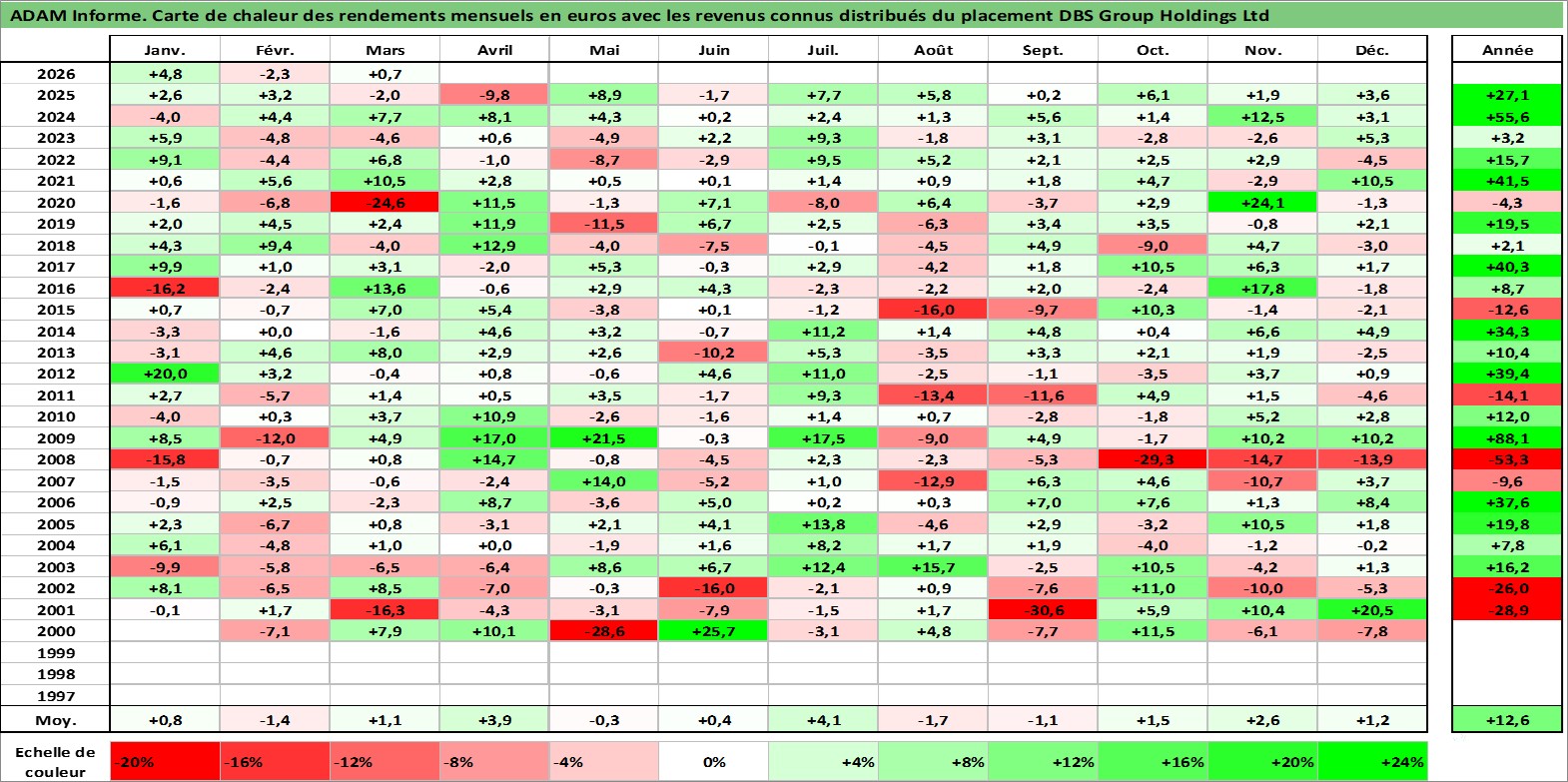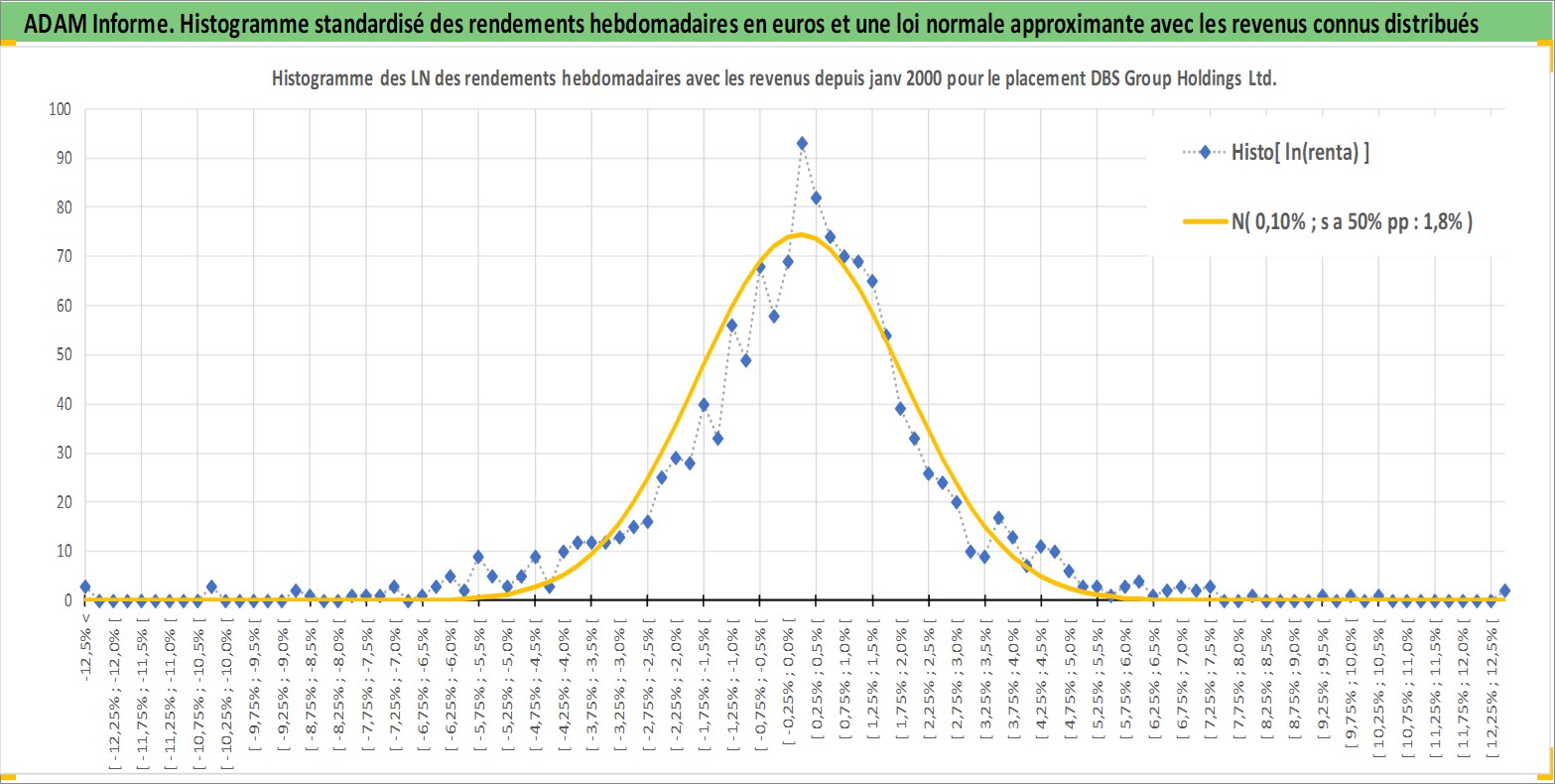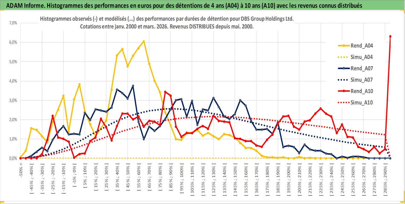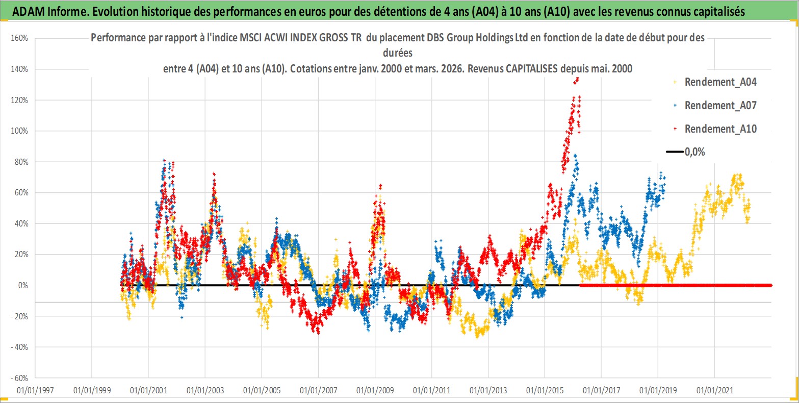 Site dédié aux investisseursPage dédiée sur site financeAnalyse des valorisations hebdomadaires de l'action DBS Group Holdings Ltd. Cet actif est cote en SGD. Les valorisations sont en contrevaleur EURO et couvrent les semaines 2000W01 a 2026W13. Les revenus de cet actif financier sont pris en compte depuis la semaine 2000W20. La note globale ESG de cet actif est estimee a 10.0 (apres rebasage entre 0 et 20).