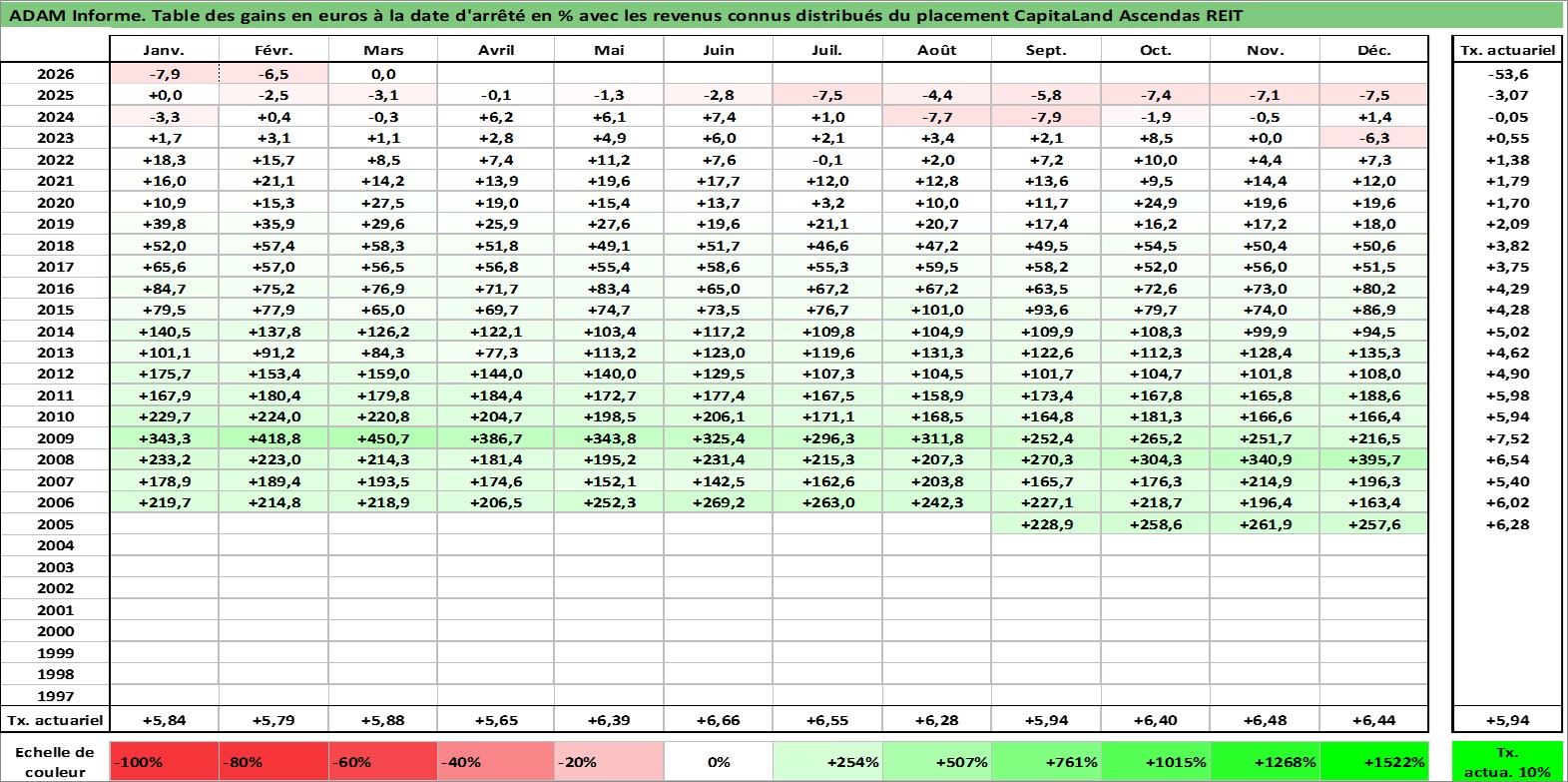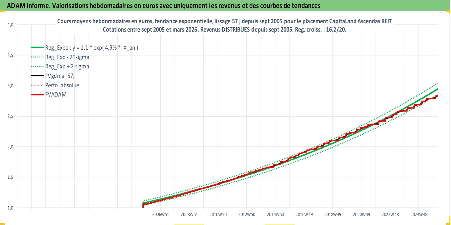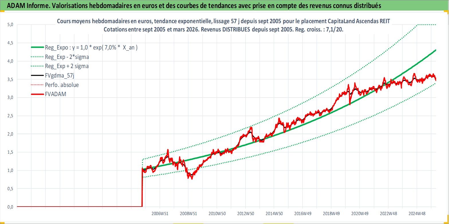 Site dédié aux investisseursPage dédiée sur site financeAnalyse des valorisations hebdomadaires de l'action CapitaLand Ascendas REIT. Cet actif est cote en SGD. Les valorisations sont en contrevaleur EURO et couvrent les semaines 2005W39 a 2026W13. Les revenus de cet actif financier sont pris en compte depuis la semaine 2005W39. La note ESG de cet actif n'est pas connue.