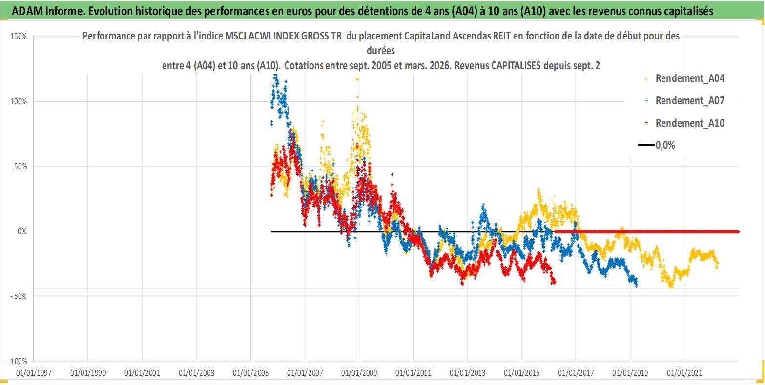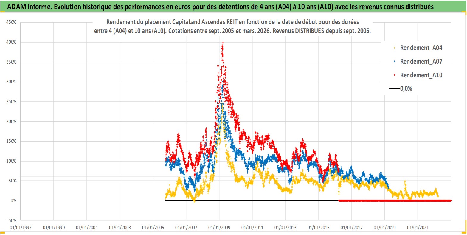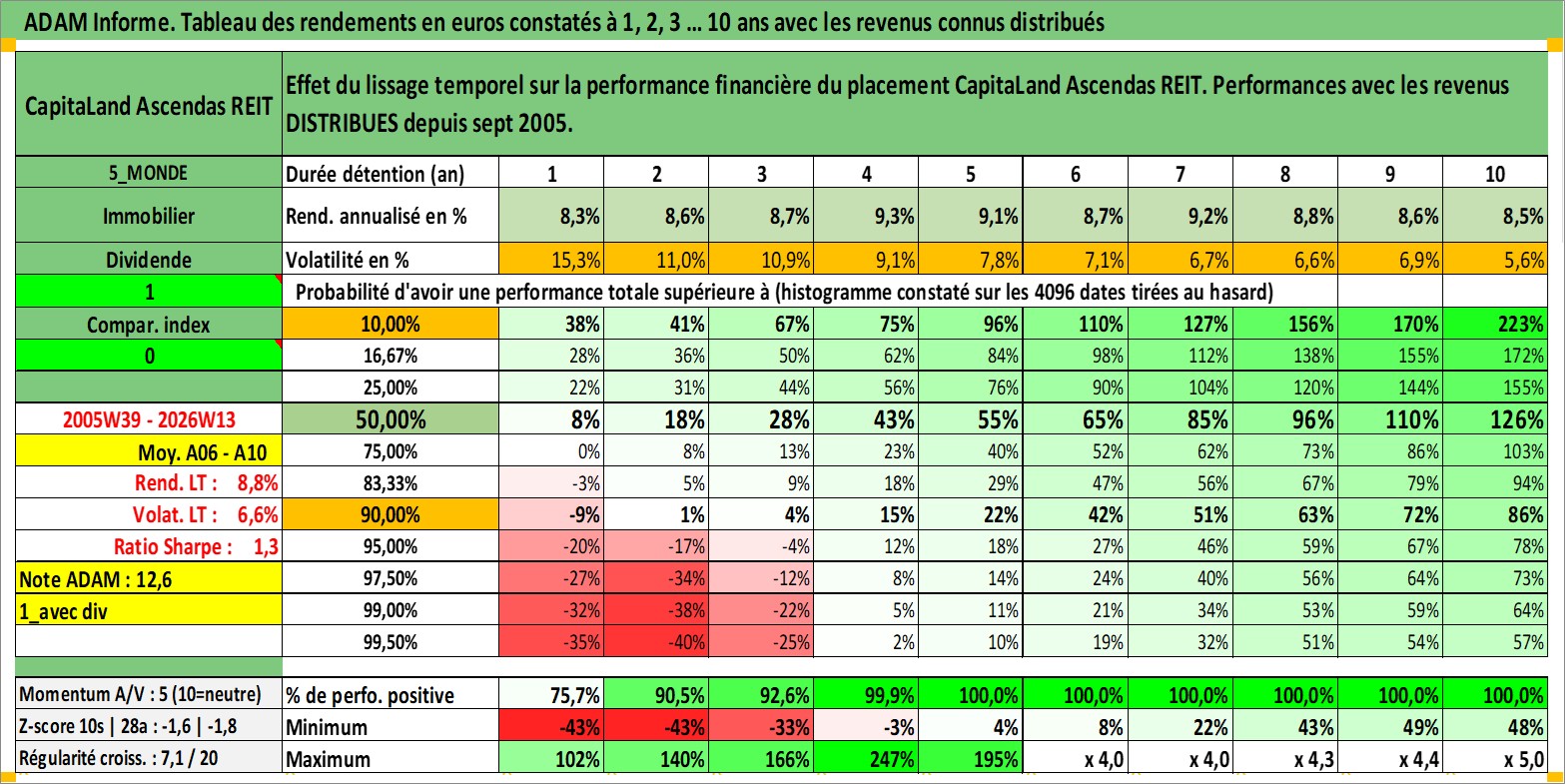 Site dédié aux investisseursPage dédiée sur site financeAnalyse des valorisations hebdomadaires de l'action CapitaLand Ascendas REIT. Cet actif est cote en SGD. Les valorisations sont en contrevaleur EURO et couvrent les semaines 2005W39 a 2026W13. Les revenus de cet actif financier sont pris en compte depuis la semaine 2005W39. La note ESG de cet actif n'est pas connue.