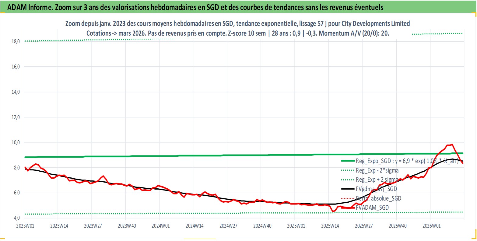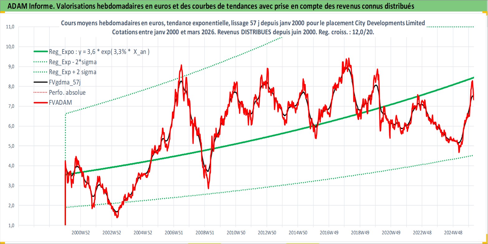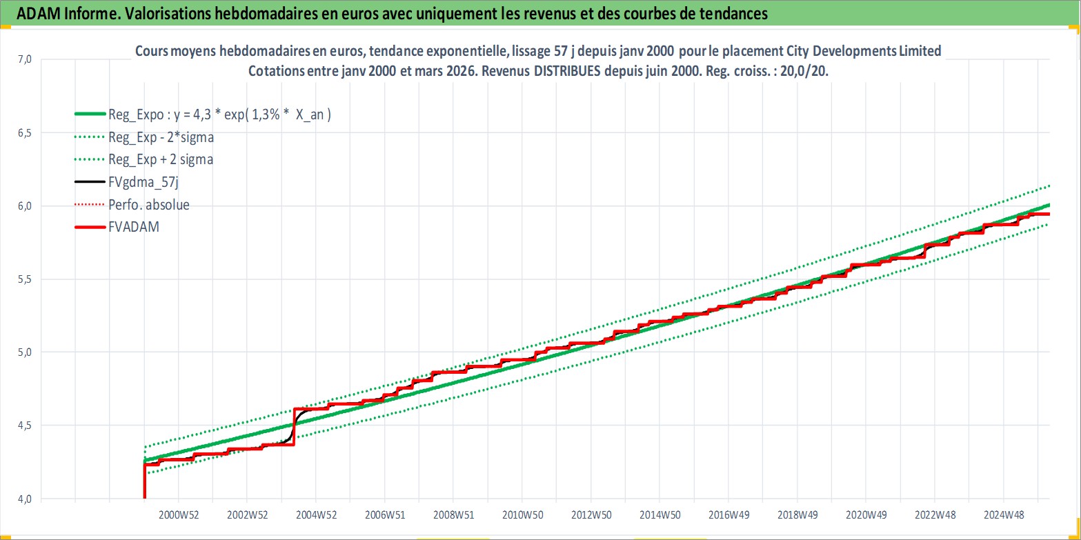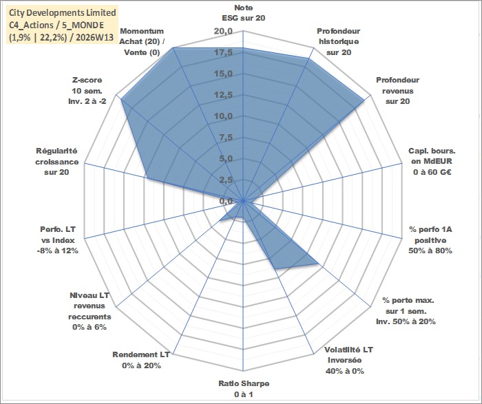 Site dédié aux investisseursPage dédiée sur site financeAnalyse des valorisations hebdomadaires de l'action City Developments Limited. Cet actif est cote en SGD. Les valorisations sont en contrevaleur EURO et couvrent les semaines 2000W01 a 2026W13. Les revenus de cet actif financier sont pris en compte depuis la semaine 2000W23. La note globale ESG de cet actif est estimee a 18.0 (apres rebasage entre 0 et 20).
