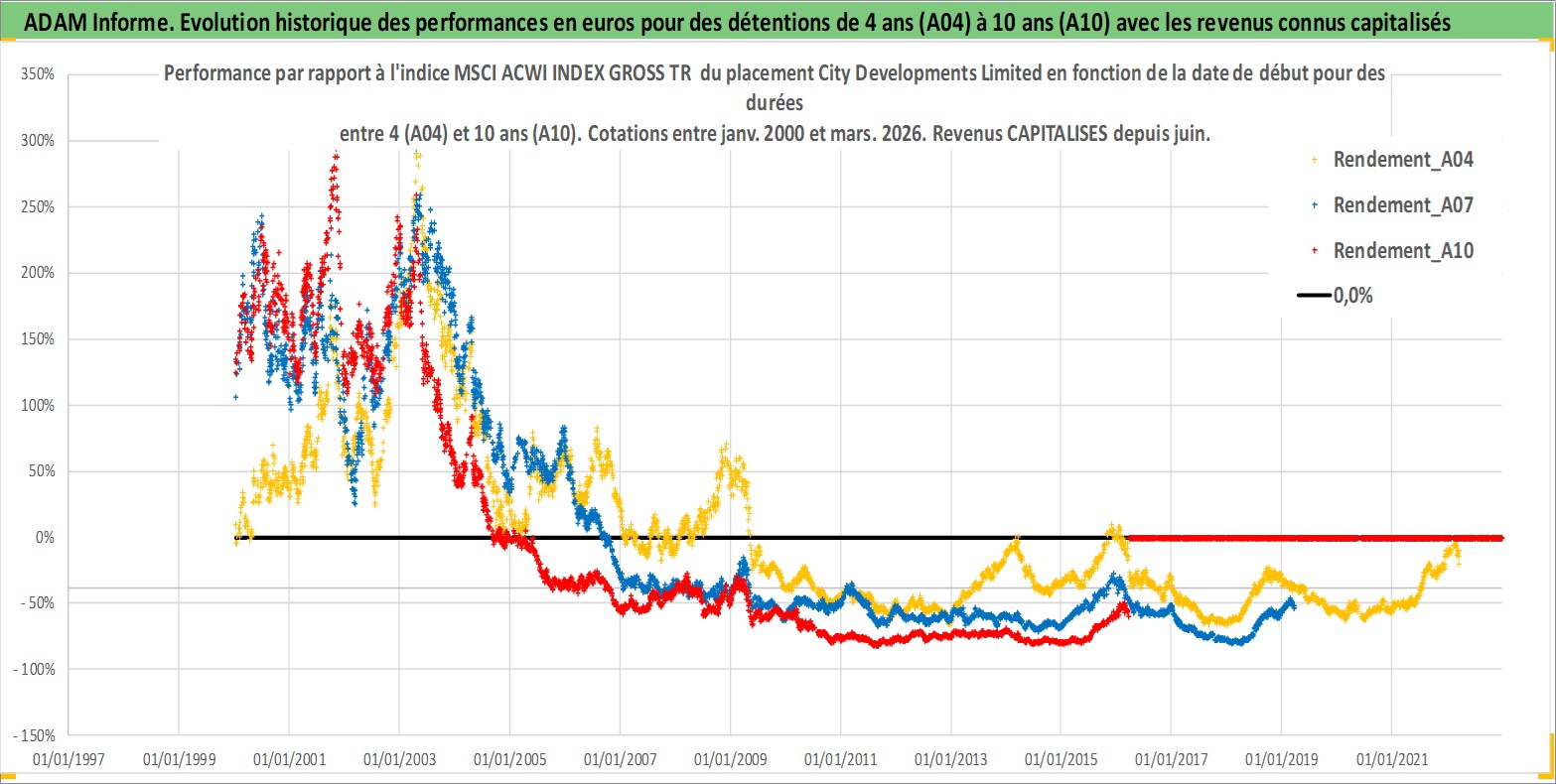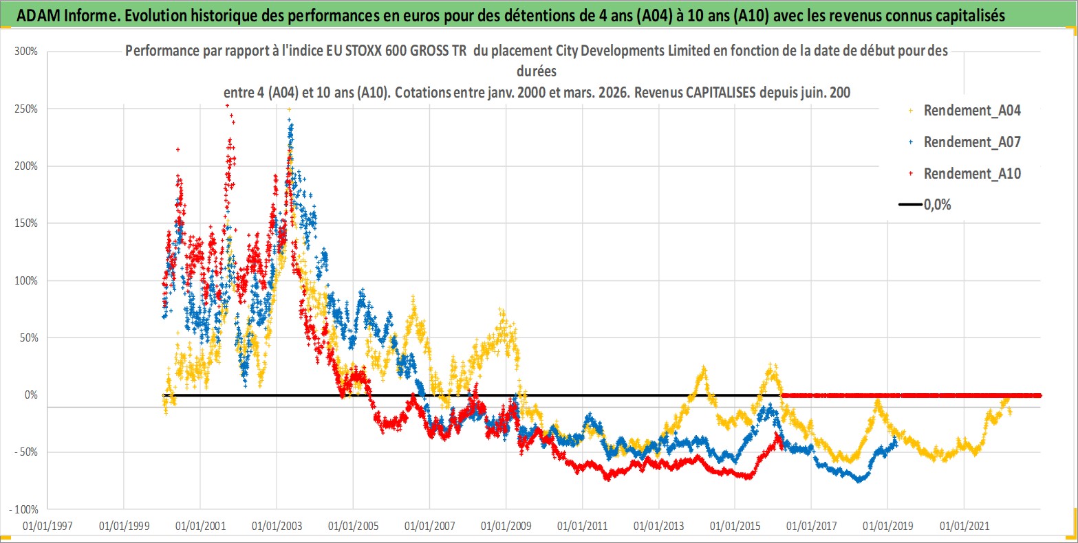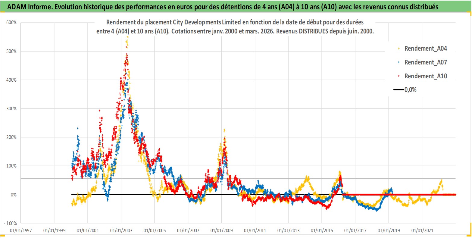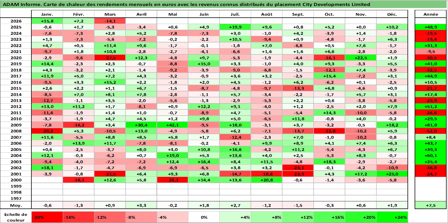 Site dédié aux investisseursPage dédiée sur site financeAnalyse des valorisations hebdomadaires de l'action City Developments Limited. Cet actif est cote en SGD. Les valorisations sont en contrevaleur EURO et couvrent les semaines 2000W01 a 2026W13. Les revenus de cet actif financier sont pris en compte depuis la semaine 2000W23. La note globale ESG de cet actif est estimee a 18.0 (apres rebasage entre 0 et 20).