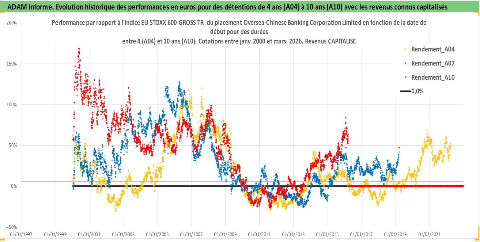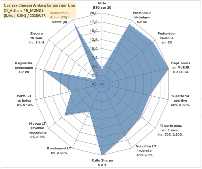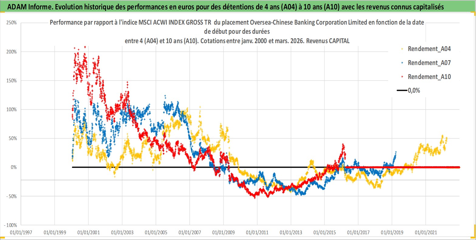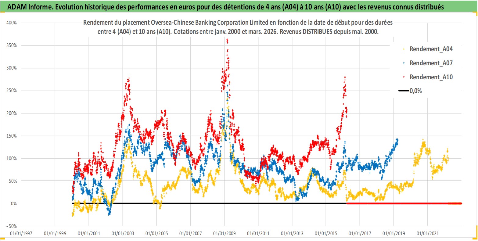 Site dédié aux investisseursPage dédiée sur site financeAnalyse des valorisations hebdomadaires de l'action Oversea-Chinese Banking Corporation Limited. Cet actif est cote en SGD. Les valorisations sont en contrevaleur EURO et couvrent les semaines 2000W01 a 2026W13. Les revenus de cet actif financier sont pris en compte depuis la semaine 2000W18. La note globale ESG de cet actif est estimee a 4.0 (apres rebasage entre 0 et 20).