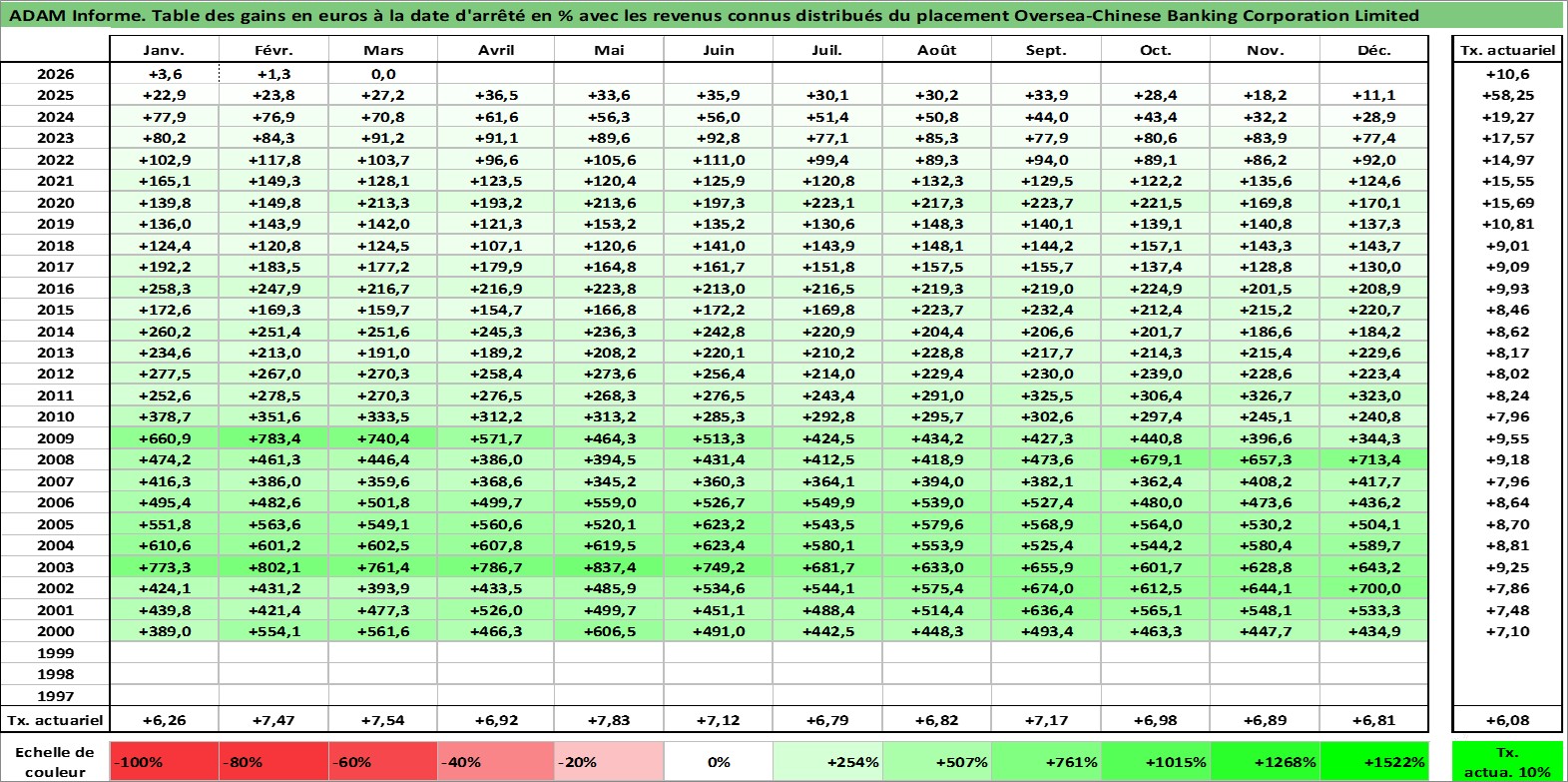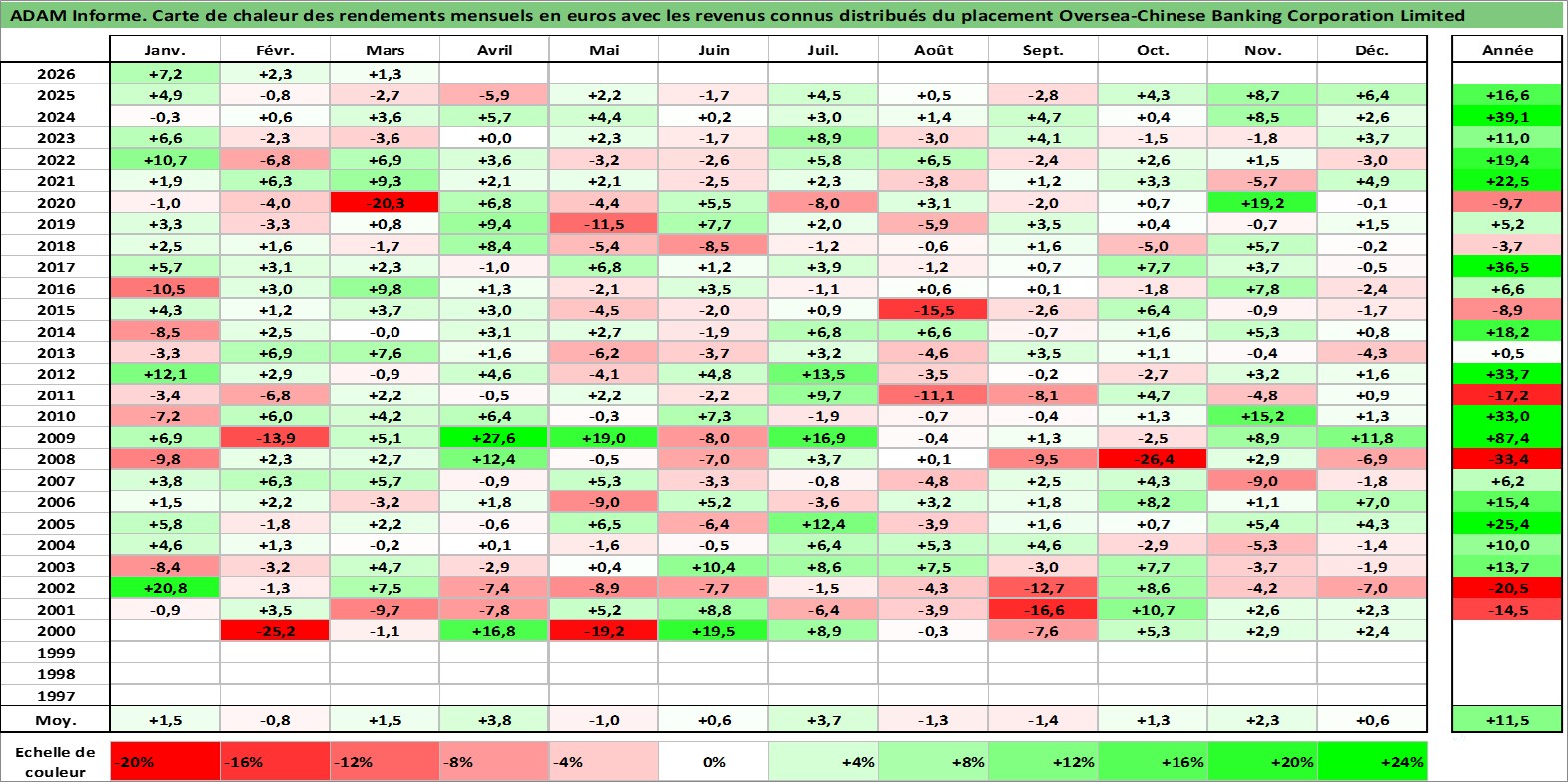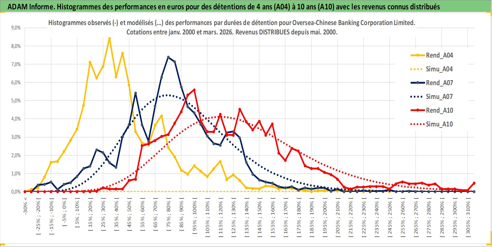 Site dédié aux investisseursPage dédiée sur site financeAnalyse des valorisations hebdomadaires de l'action Oversea-Chinese Banking Corporation Limited. Cet actif est cote en SGD. Les valorisations sont en contrevaleur EURO et couvrent les semaines 2000W01 a 2026W13. Les revenus de cet actif financier sont pris en compte depuis la semaine 2000W18. La note globale ESG de cet actif est estimee a 4.0 (apres rebasage entre 0 et 20).