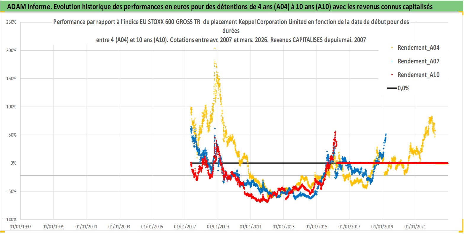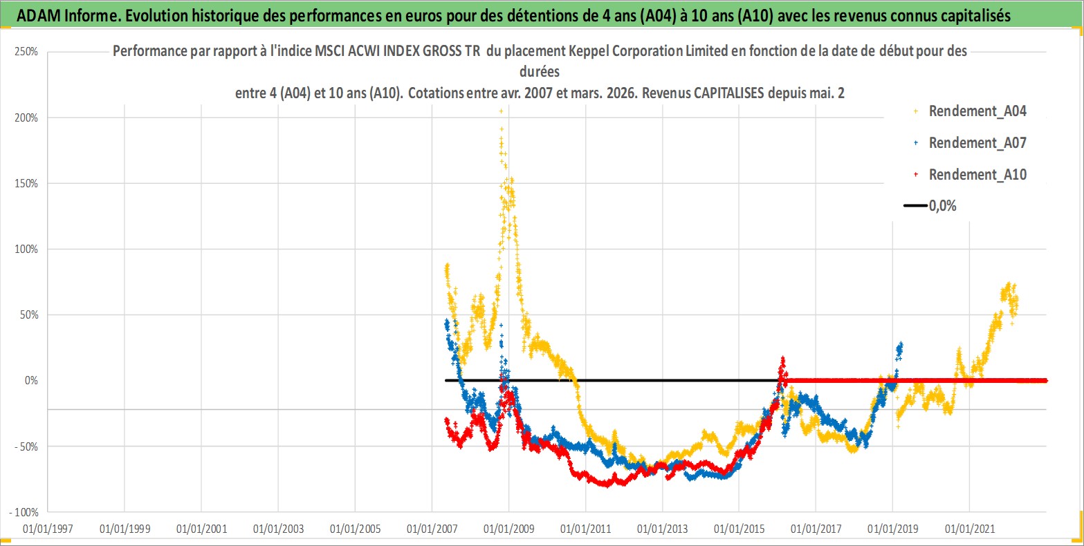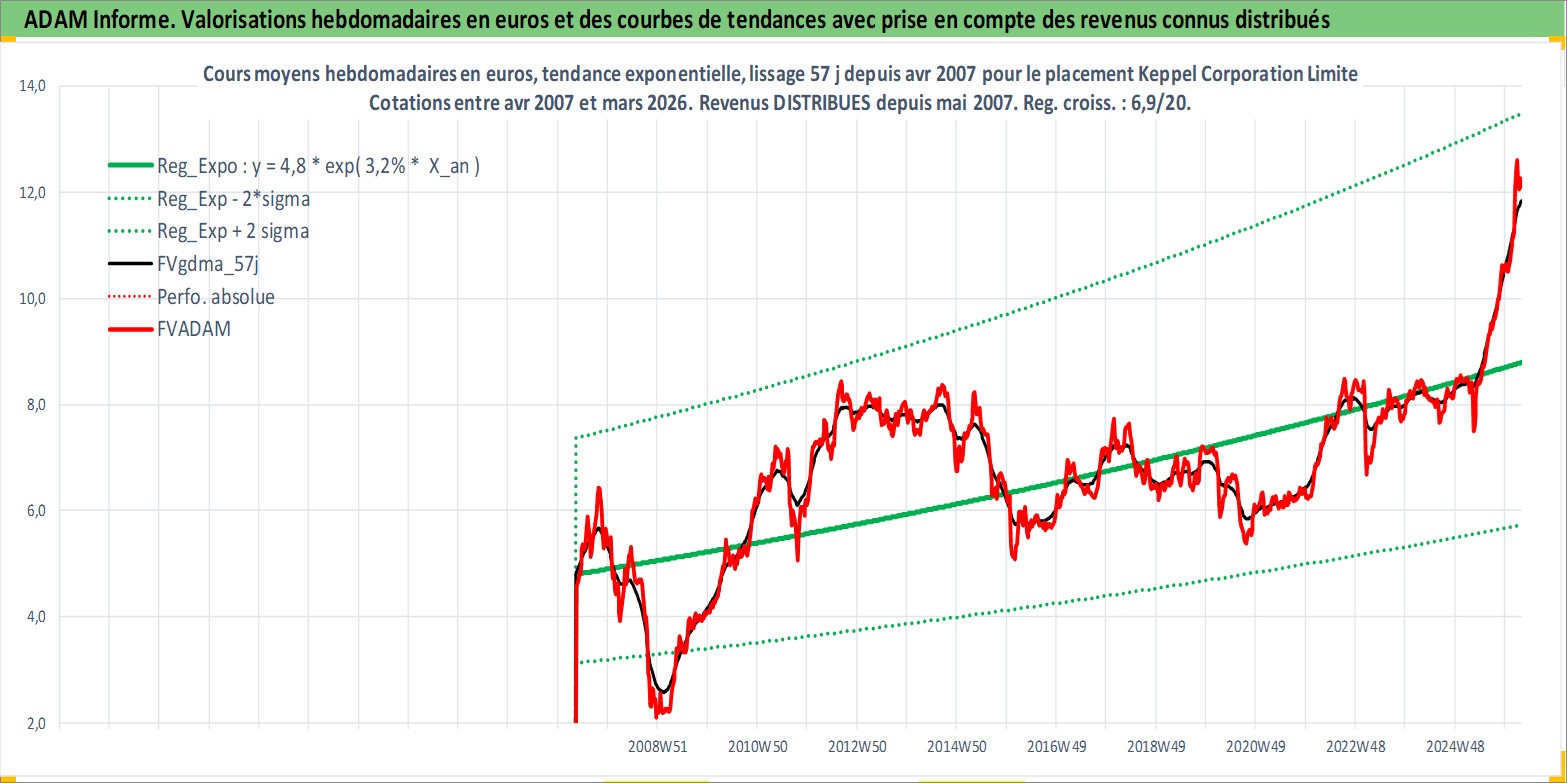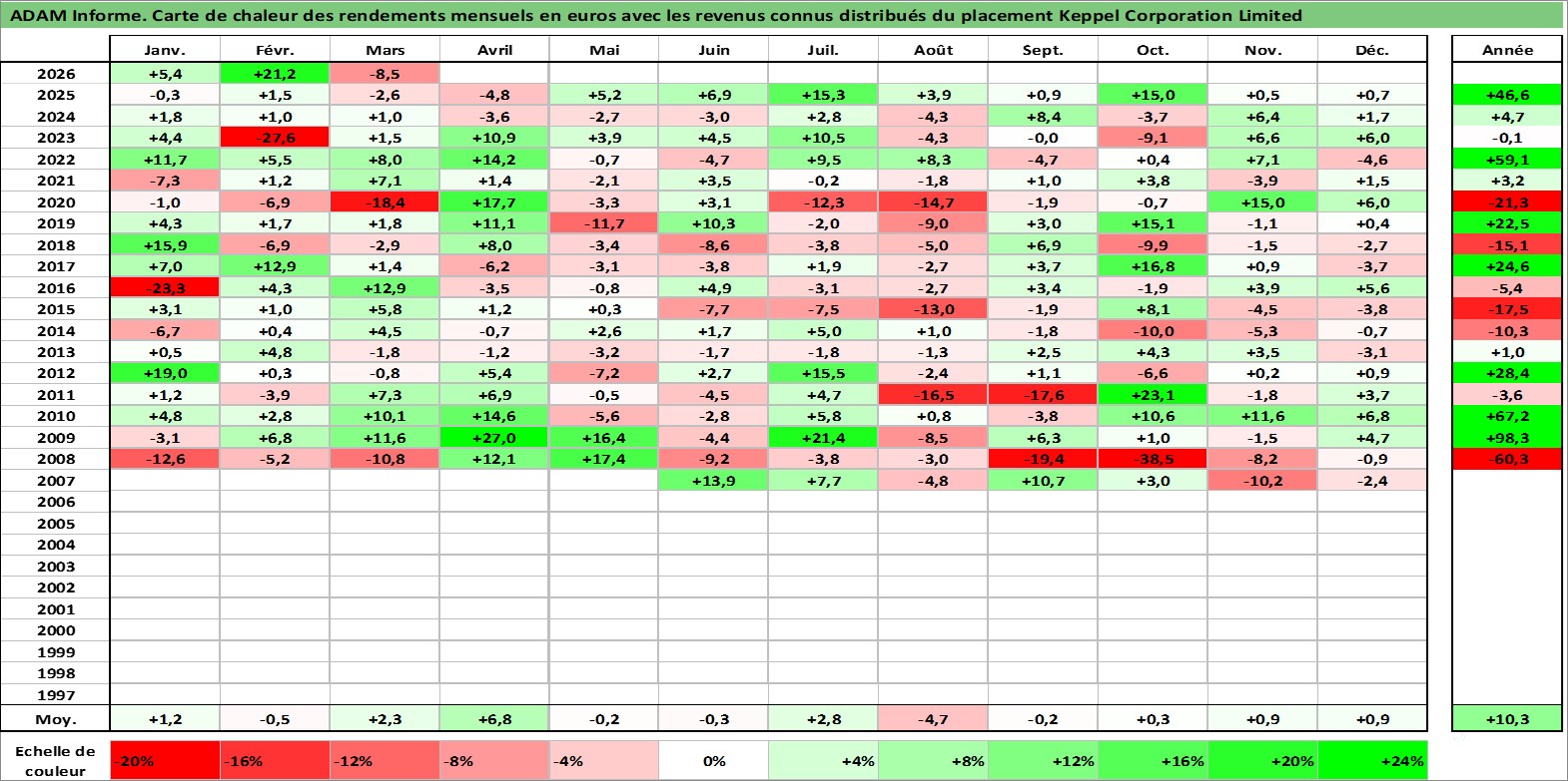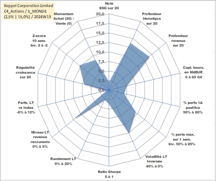 Site dédié aux investisseursPage dédiée sur site financeAnalyse des valorisations hebdomadaires de l'action Keppel Corporation Limited. Cet actif est cote en SGD. Les valorisations sont en contrevaleur EURO et couvrent les semaines 2007W18 a 2026W13. Les revenus de cet actif financier sont pris en compte depuis la semaine 2007W18. La note globale ESG de cet actif est estimee a 2.0 (apres rebasage entre 0 et 20).