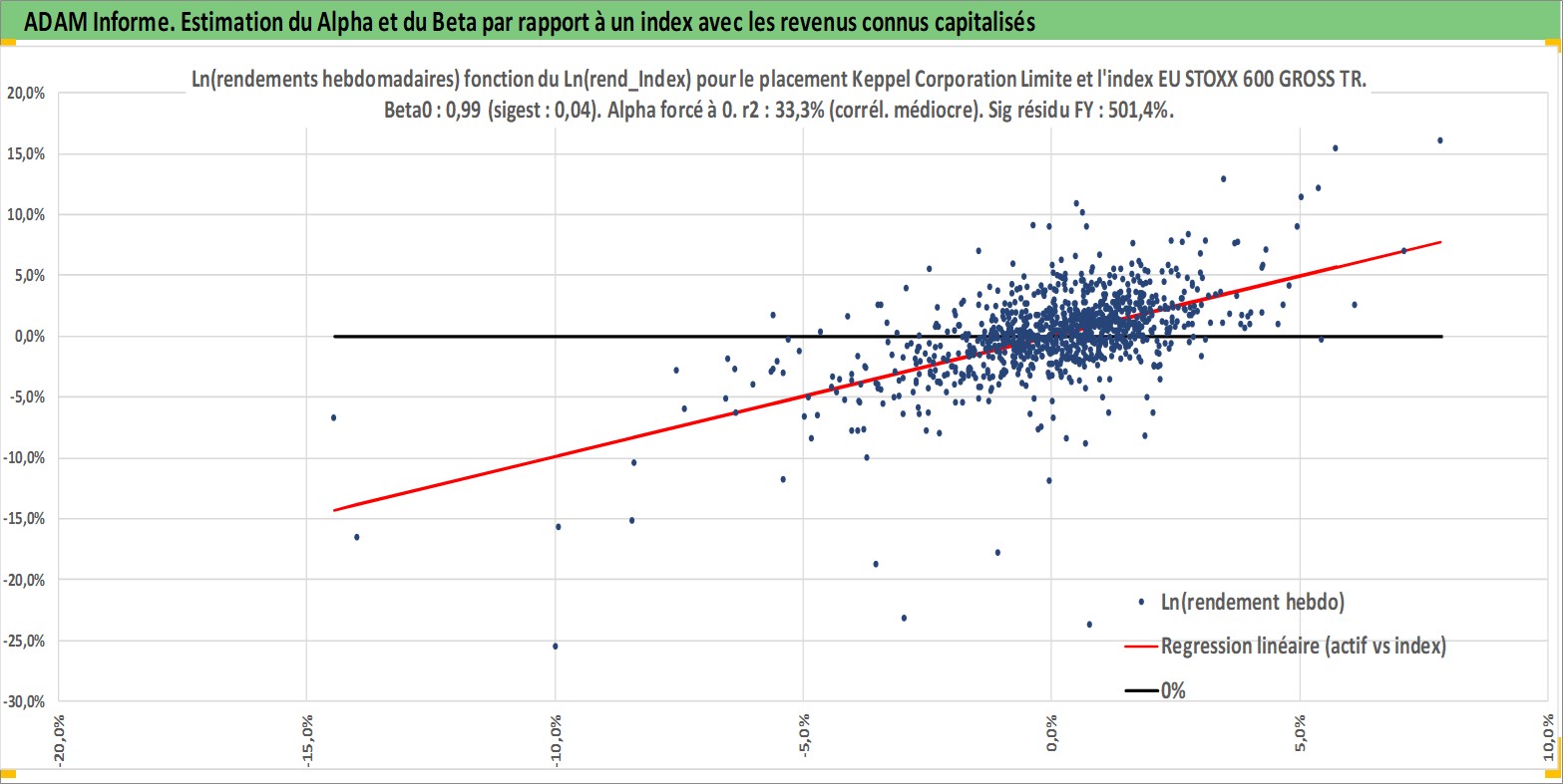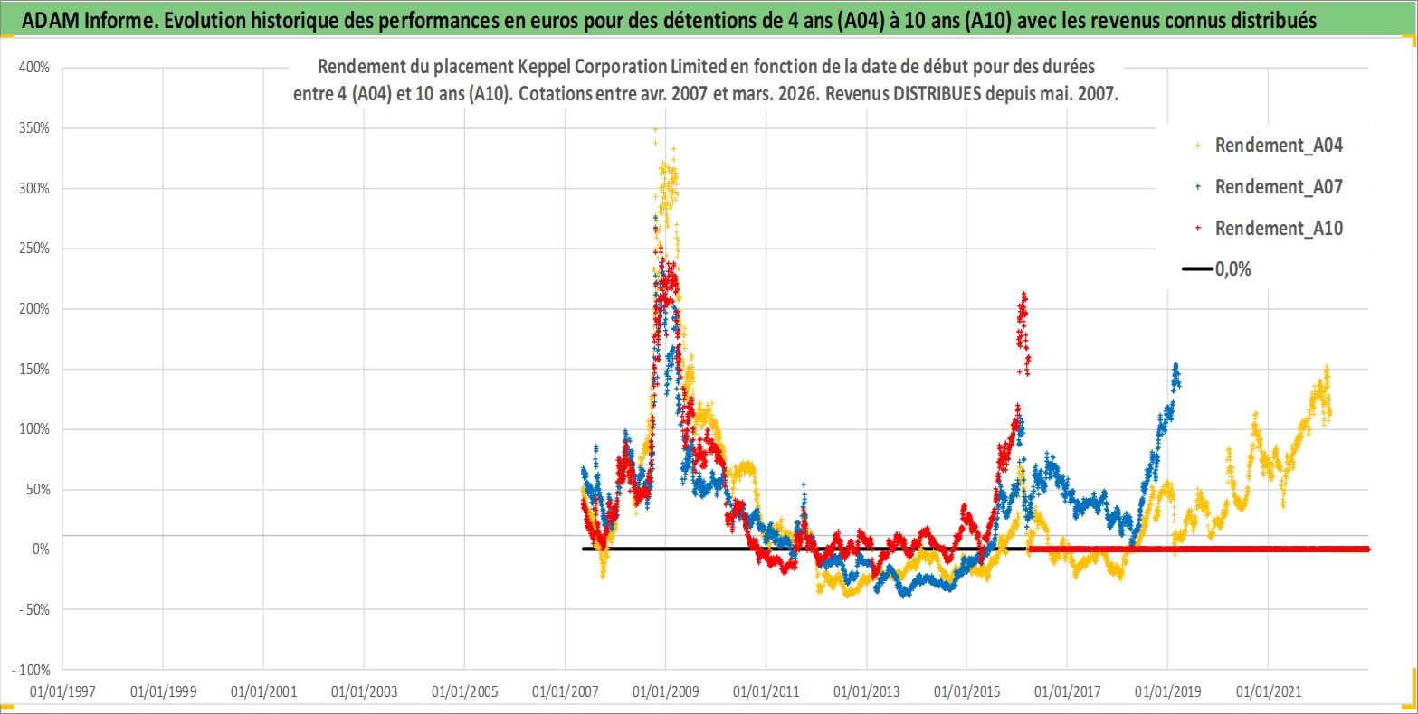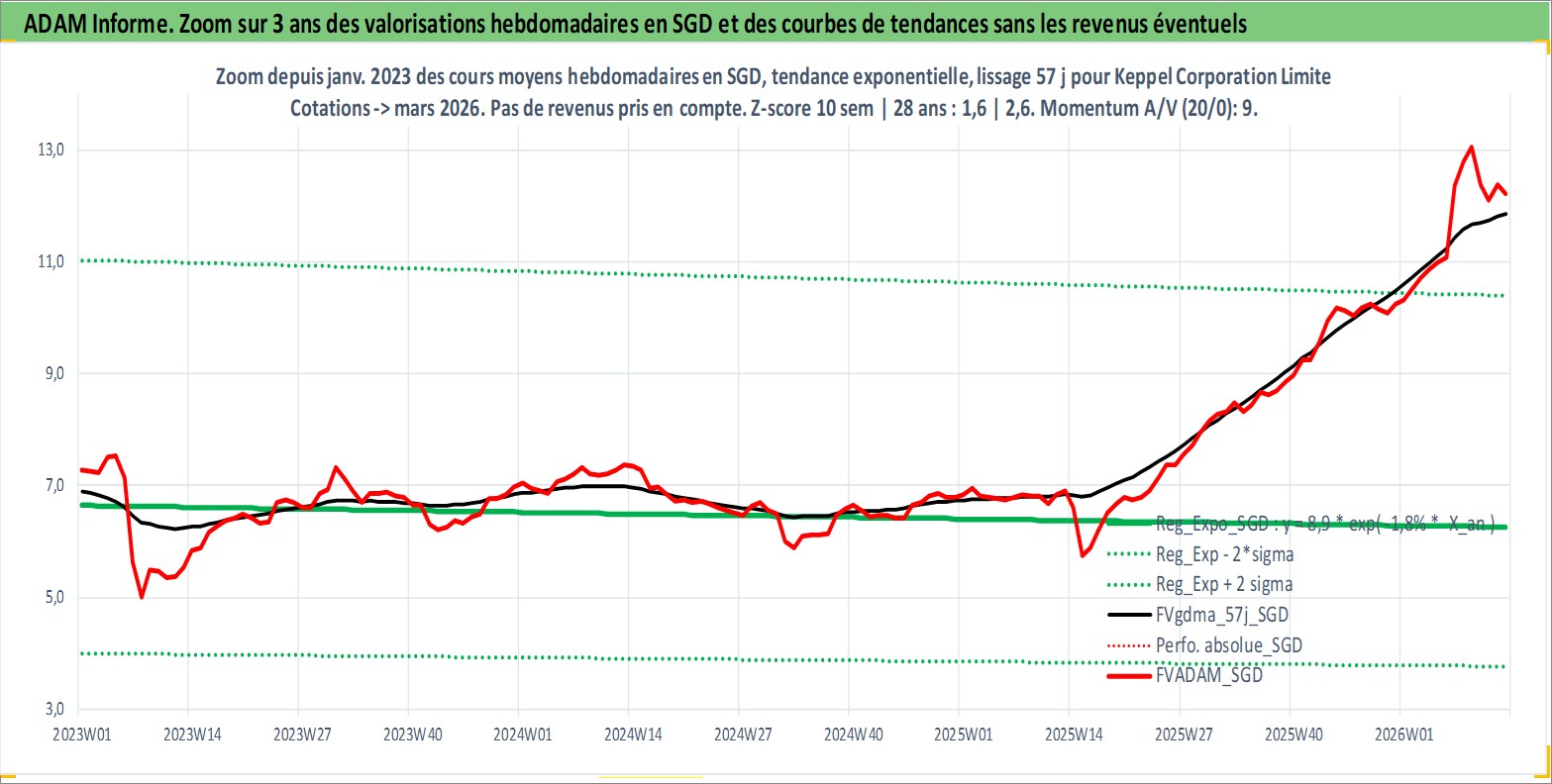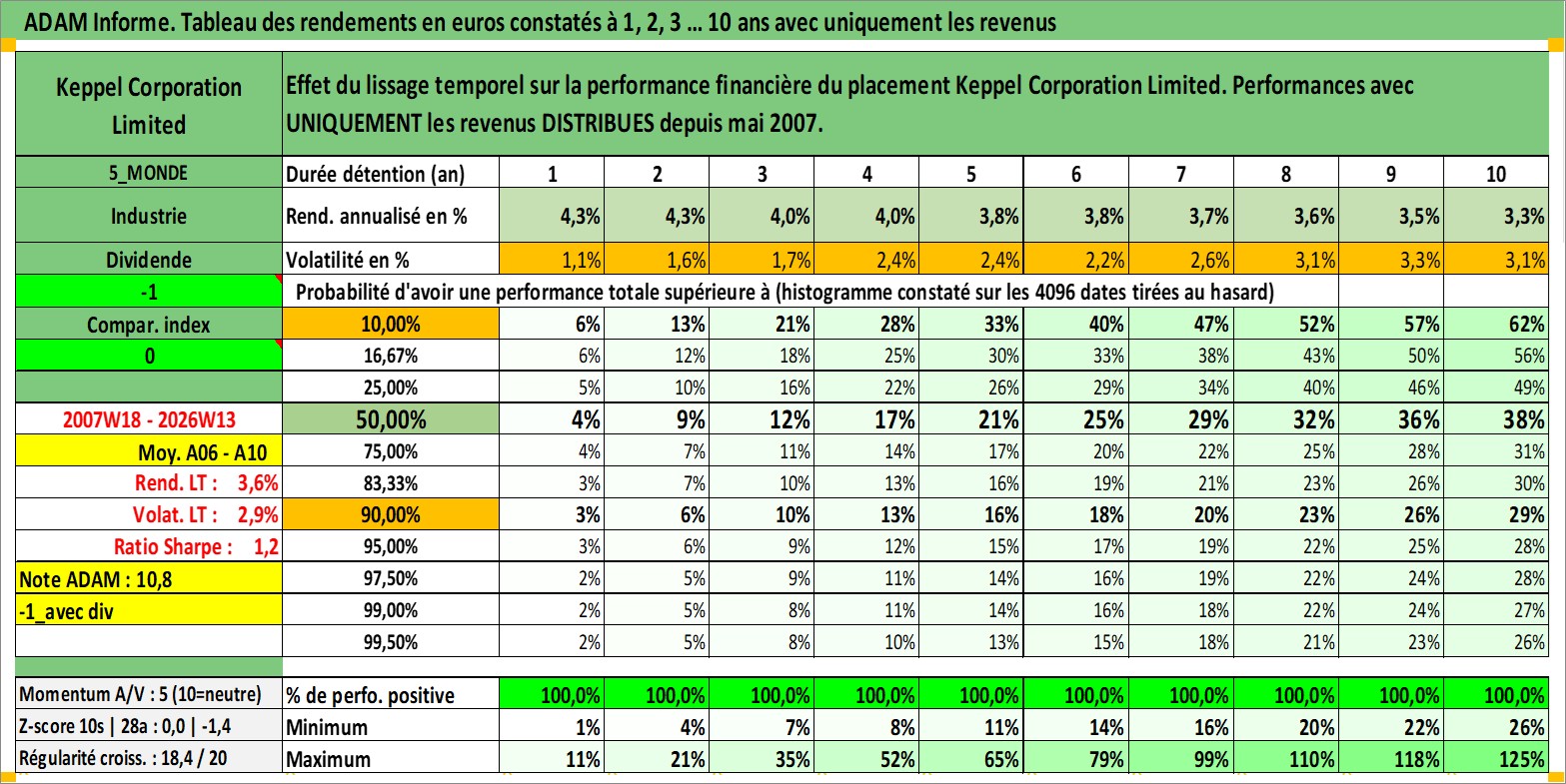 Site dédié aux investisseursPage dédiée sur site financeAnalyse des valorisations hebdomadaires de l'action Keppel Corporation Limited. Cet actif est cote en SGD. Les valorisations sont en contrevaleur EURO et couvrent les semaines 2007W18 a 2026W13. Les revenus de cet actif financier sont pris en compte depuis la semaine 2007W18. La note globale ESG de cet actif est estimee a 2.0 (apres rebasage entre 0 et 20).