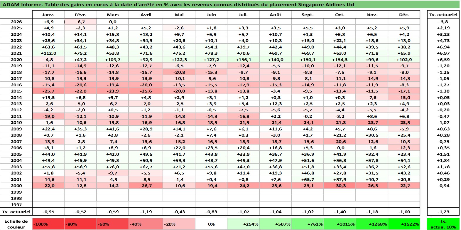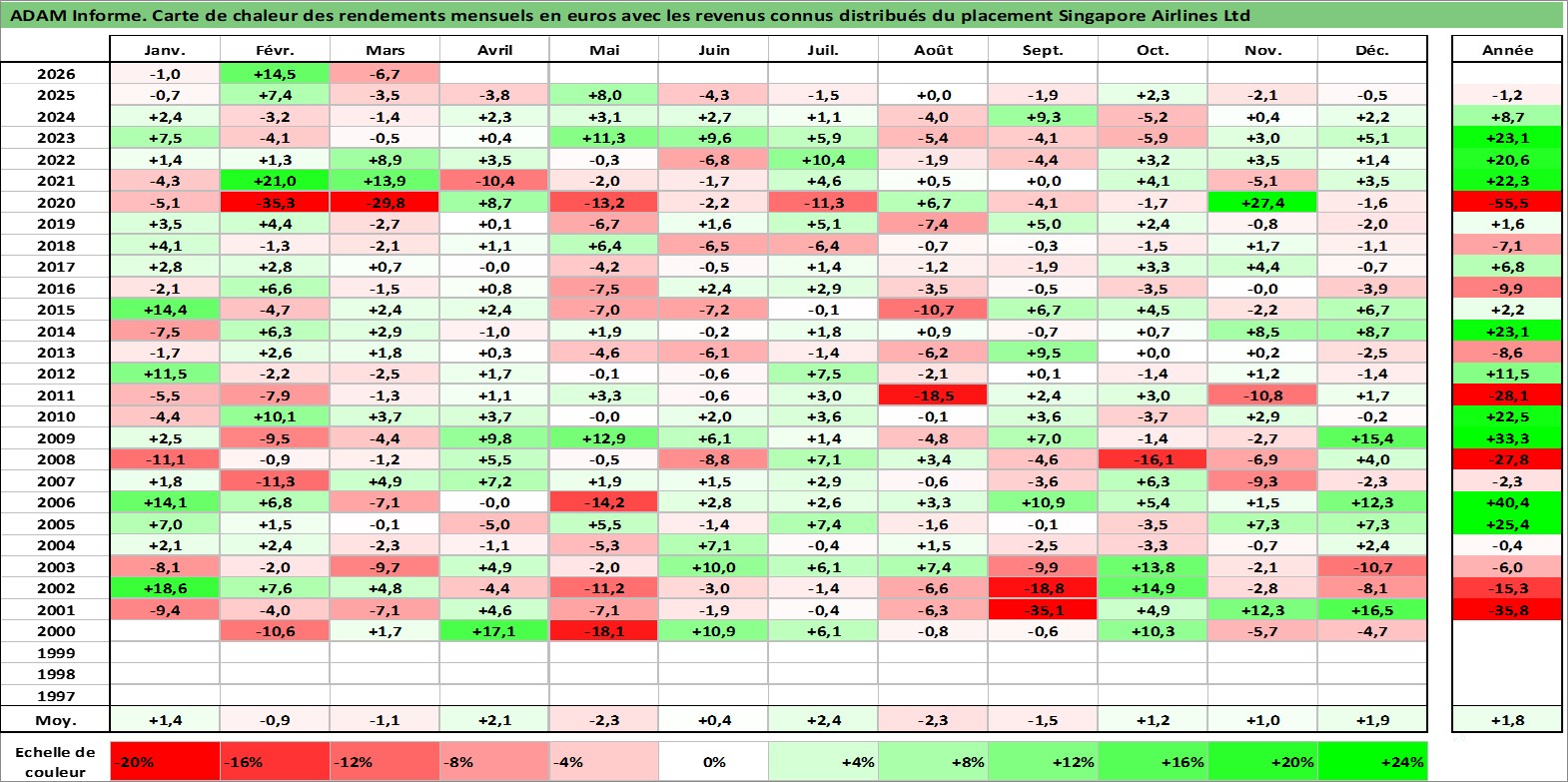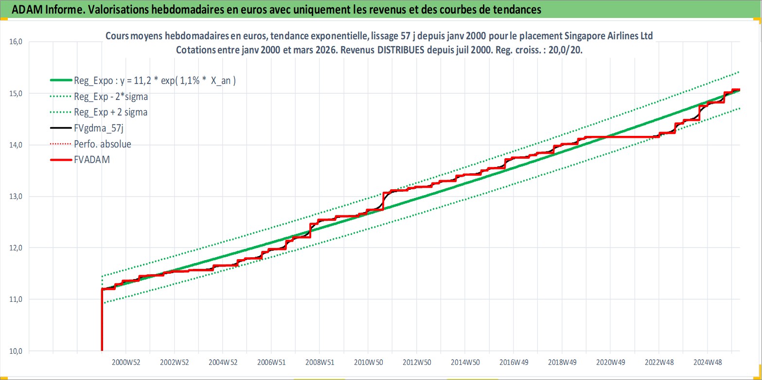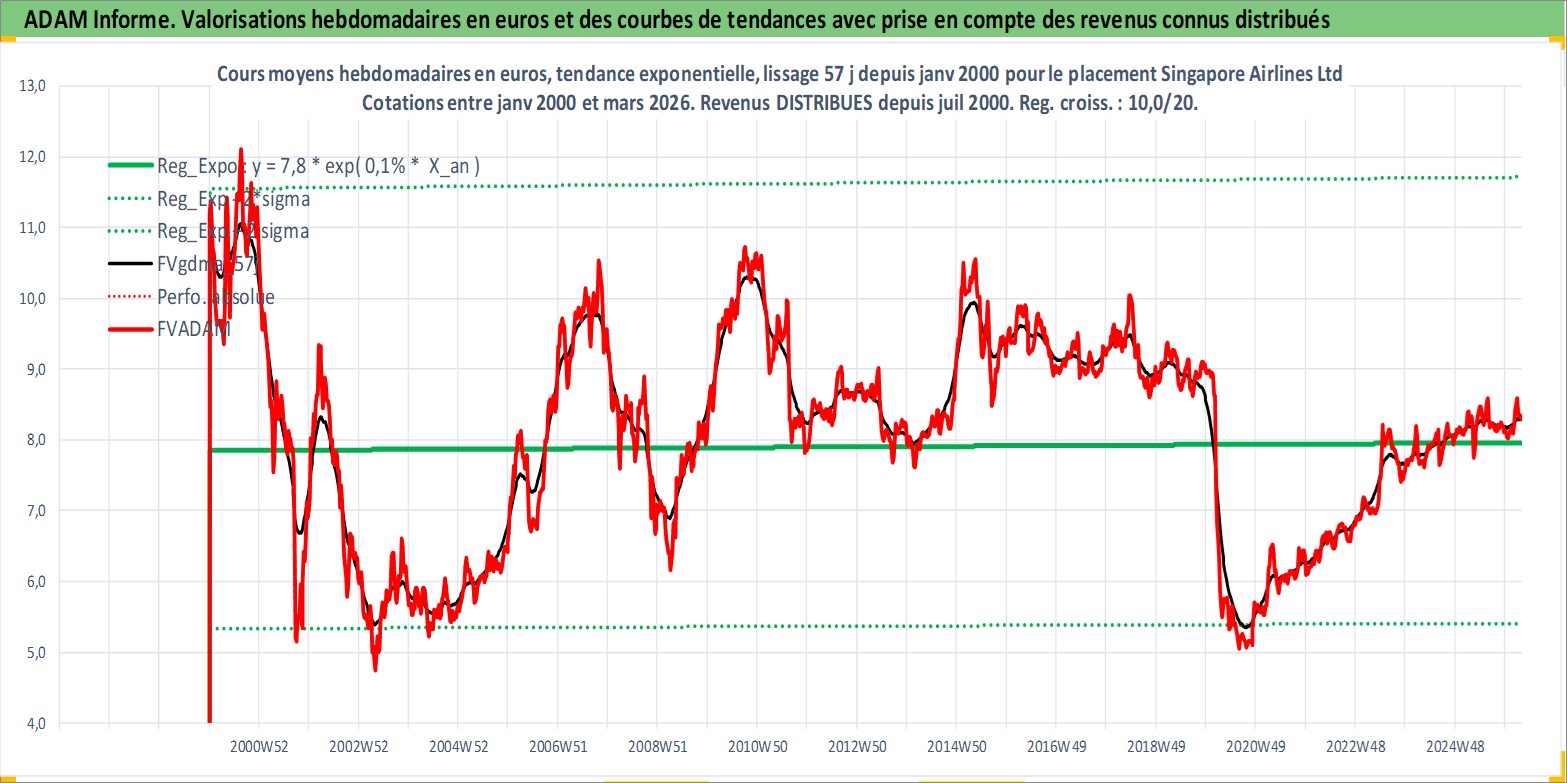 Site dédié aux investisseursPage dédiée sur site financeAnalyse des valorisations hebdomadaires de l'action Singapore Airlines Ltd. Cet actif est cote en SGD. Les valorisations sont en contrevaleur EURO et couvrent les semaines 2000W01 a 2026W13. Les revenus de cet actif financier sont pris en compte depuis la semaine 2000W29. La note globale ESG de cet actif est estimee a 7.0 (apres rebasage entre 0 et 20).
