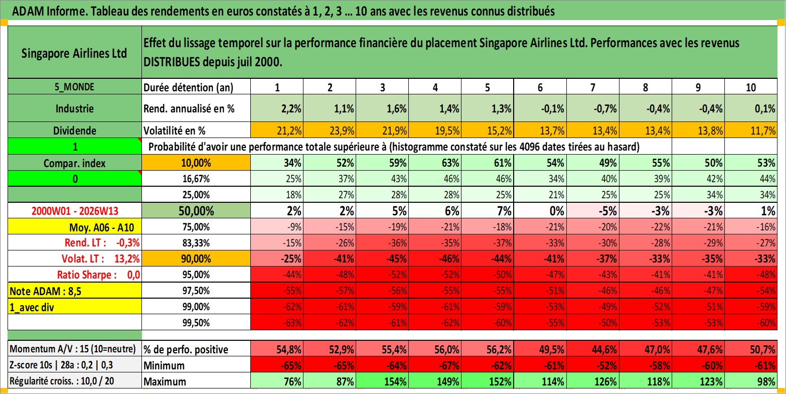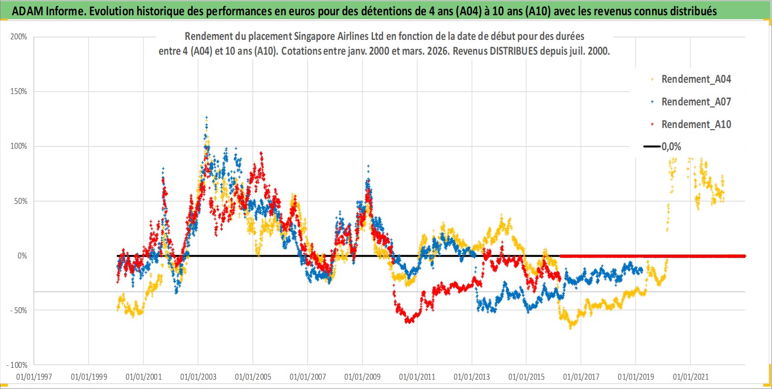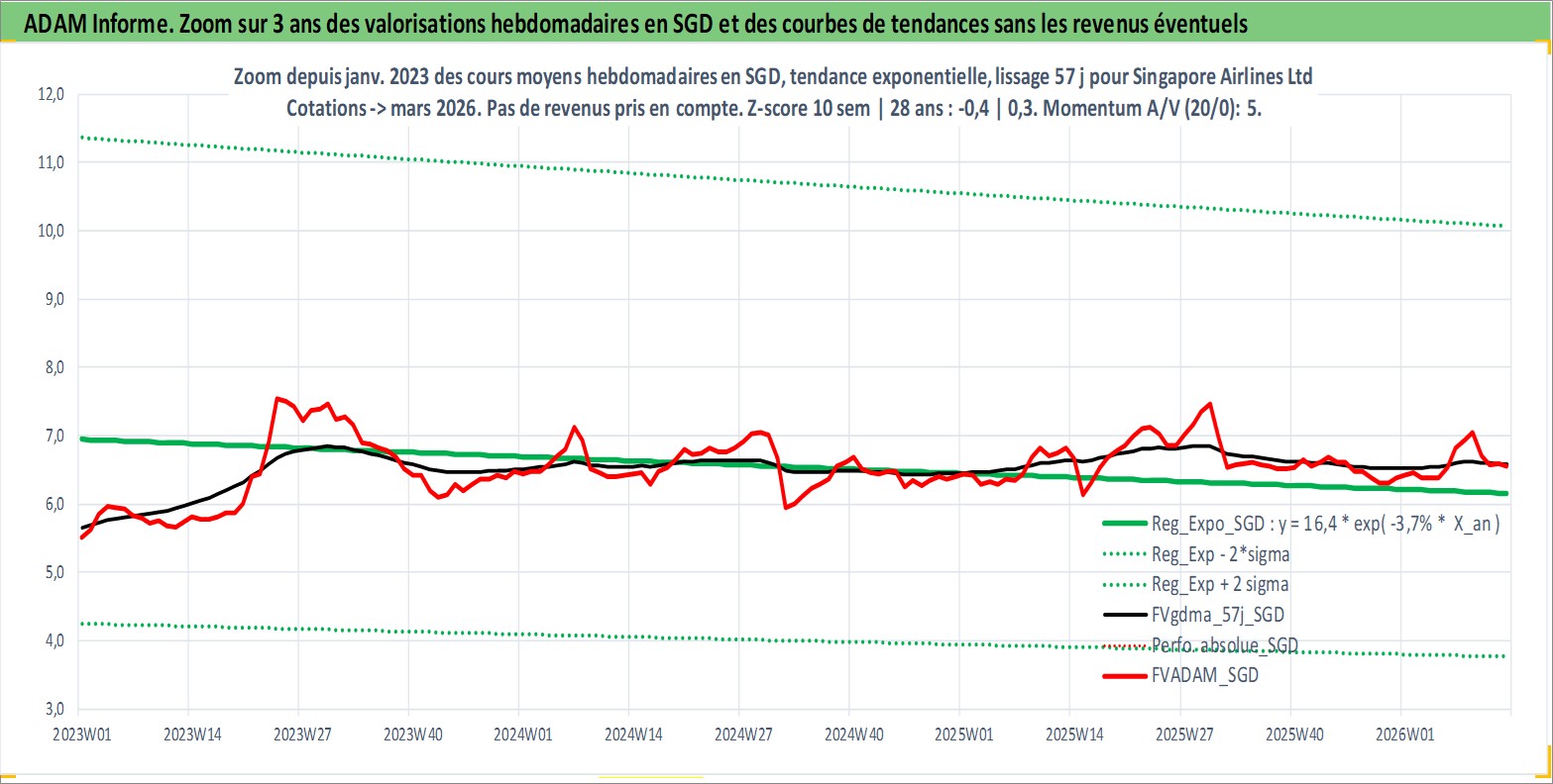 Site dédié aux investisseursPage dédiée sur site financeAnalyse des valorisations hebdomadaires de l'action Singapore Airlines Ltd. Cet actif est cote en SGD. Les valorisations sont en contrevaleur EURO et couvrent les semaines 2000W01 a 2026W13. Les revenus de cet actif financier sont pris en compte depuis la semaine 2000W29. La note globale ESG de cet actif est estimee a 7.0 (apres rebasage entre 0 et 20).
