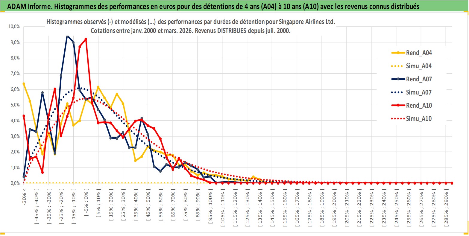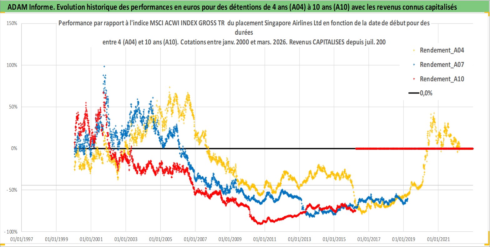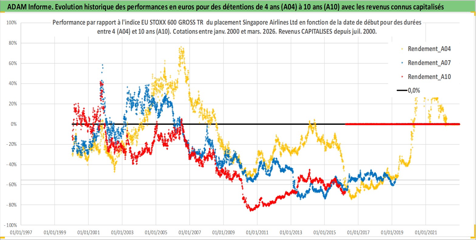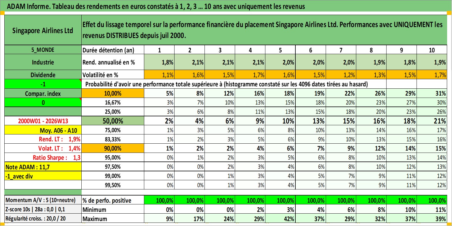 Site dédié aux investisseursPage dédiée sur site financeAnalyse des valorisations hebdomadaires de l'action Singapore Airlines Ltd. Cet actif est cote en SGD. Les valorisations sont en contrevaleur EURO et couvrent les semaines 2000W01 a 2026W13. Les revenus de cet actif financier sont pris en compte depuis la semaine 2000W29. La note globale ESG de cet actif est estimee a 7.0 (apres rebasage entre 0 et 20).