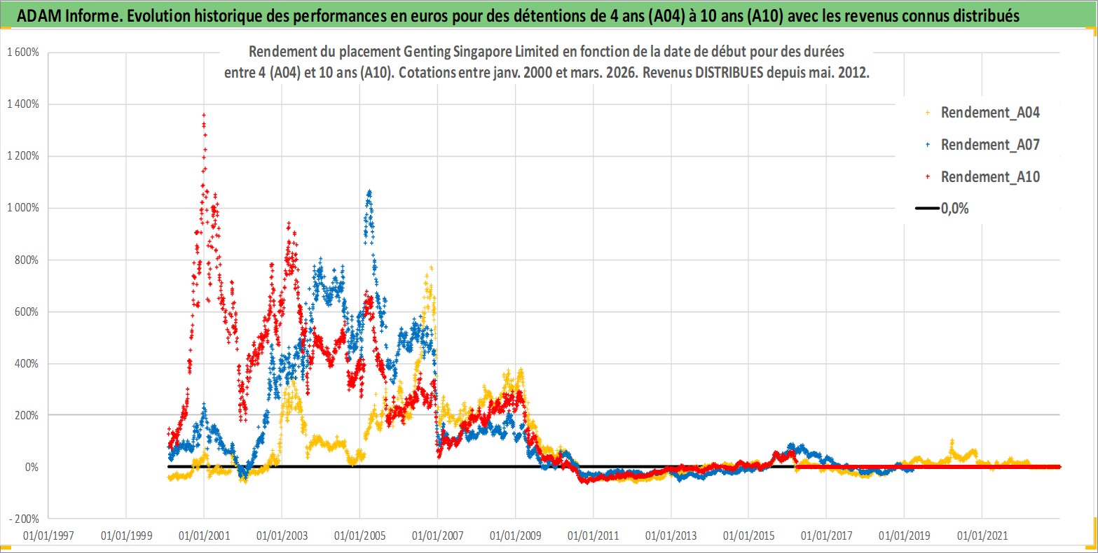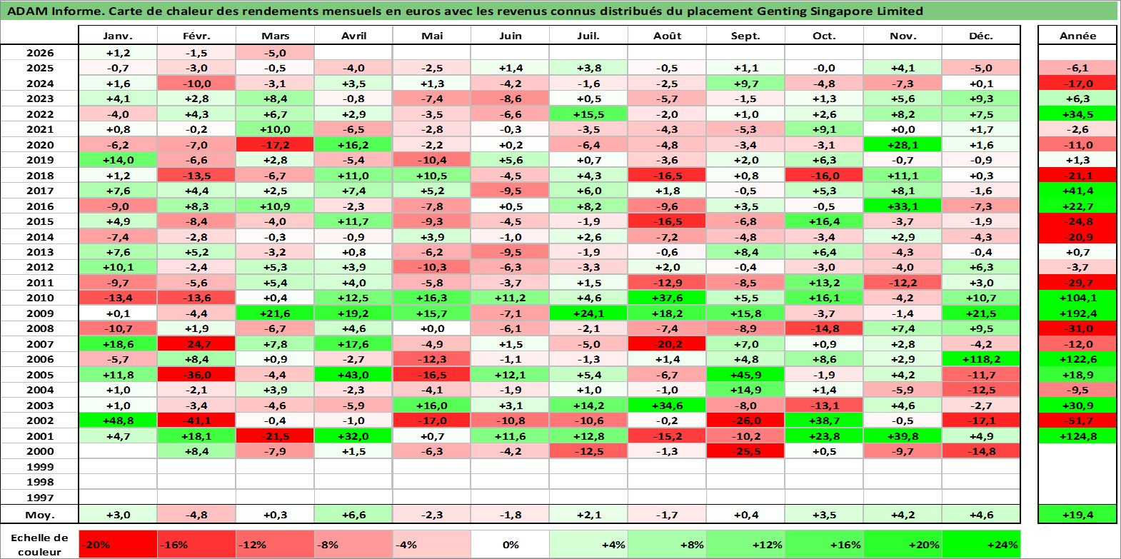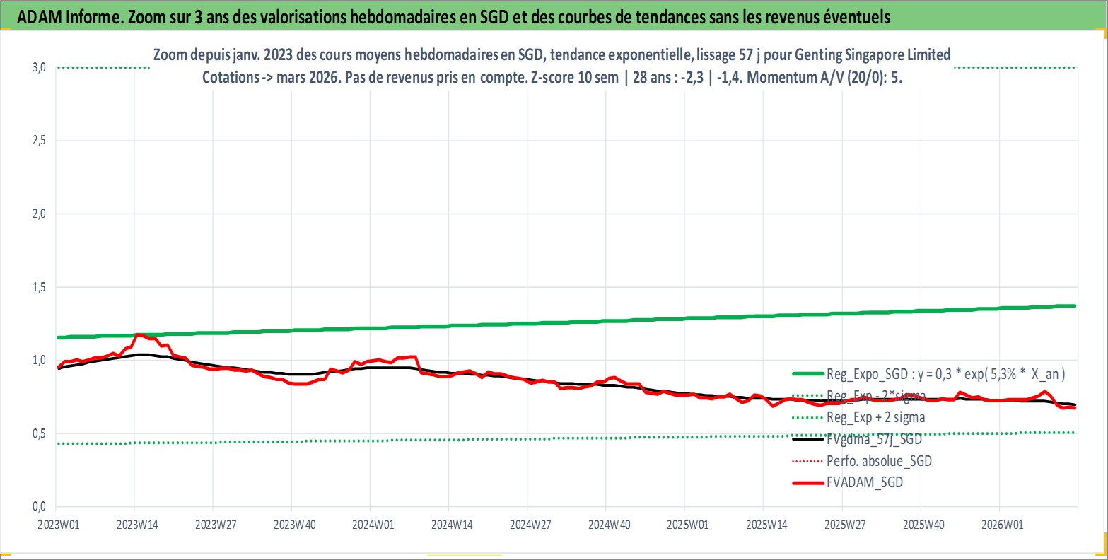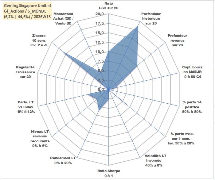 Site dédié aux investisseursPage dédiée sur site financeAnalyse des valorisations hebdomadaires de l'action Genting Singapore Limited. Cet actif est cote en SGD. Les valorisations sont en contrevaleur EURO et couvrent les semaines 2000W03 a 2026W13. Les revenus de cet actif financier sont pris en compte depuis la semaine 2012W19. La note globale ESG de cet actif est estimee a 10.0 (apres rebasage entre 0 et 20).