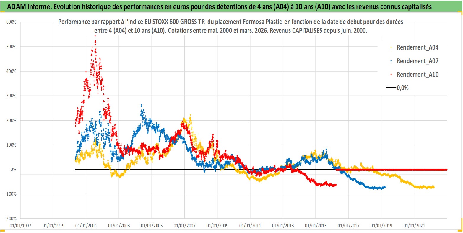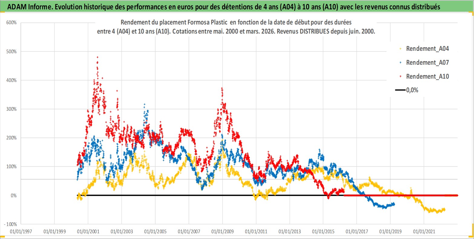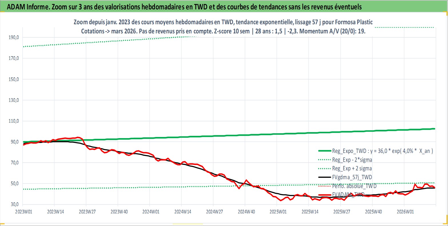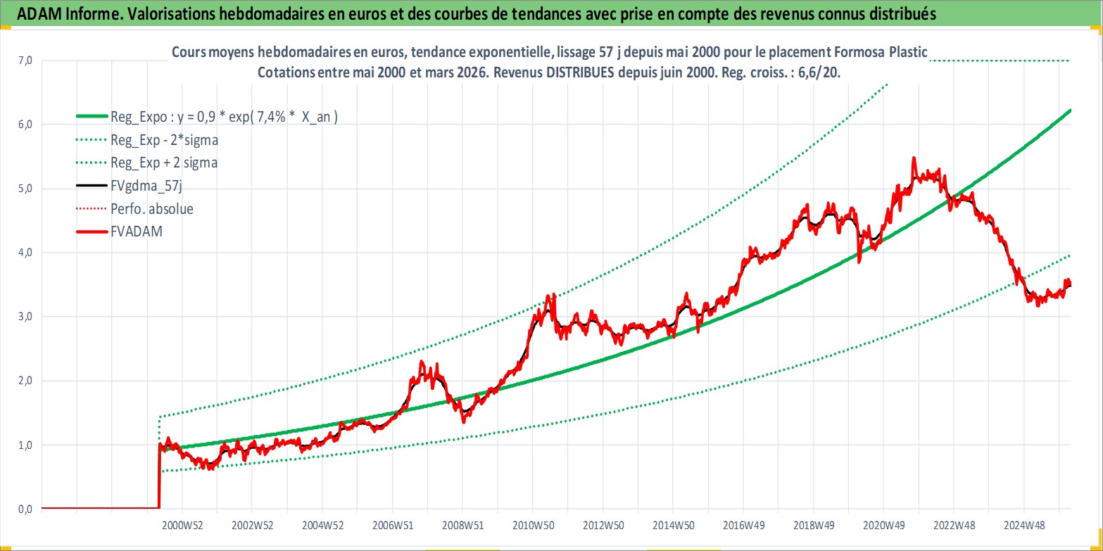 Site dédié aux investisseursPage dédiée sur site financeAnalyse des valorisations hebdomadaires de l'action Formosa Plastic . Cet actif est cote en TWD. Les valorisations sont en contrevaleur EURO et couvrent les semaines 2000W18 a 2026W13. Les revenus de cet actif financier sont pris en compte depuis la semaine 2000W23. La note globale ESG de cet actif est estimee a 9.0 (apres rebasage entre 0 et 20).
