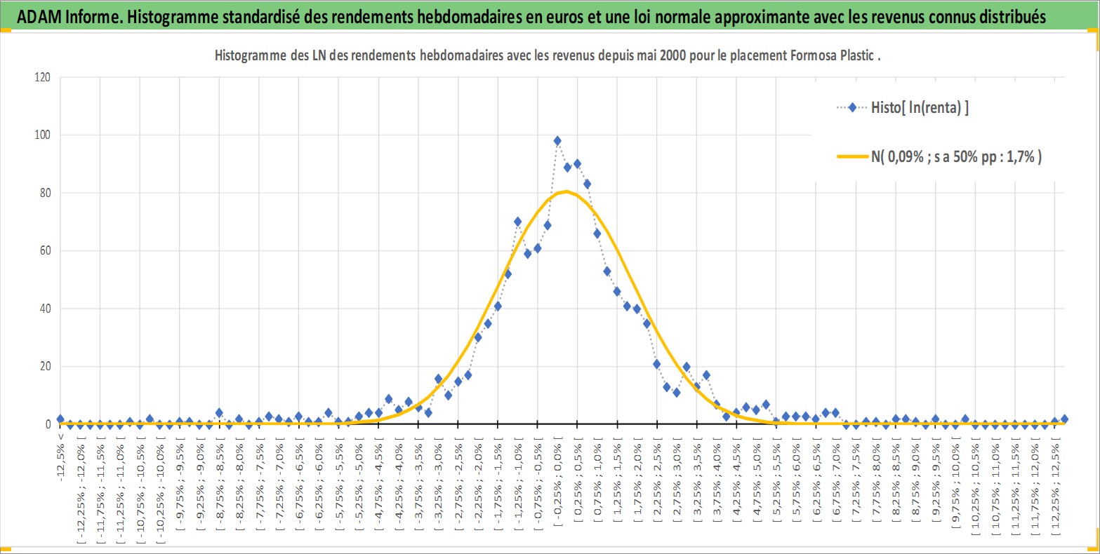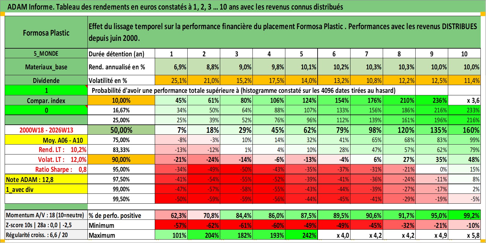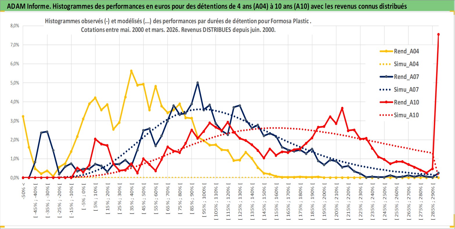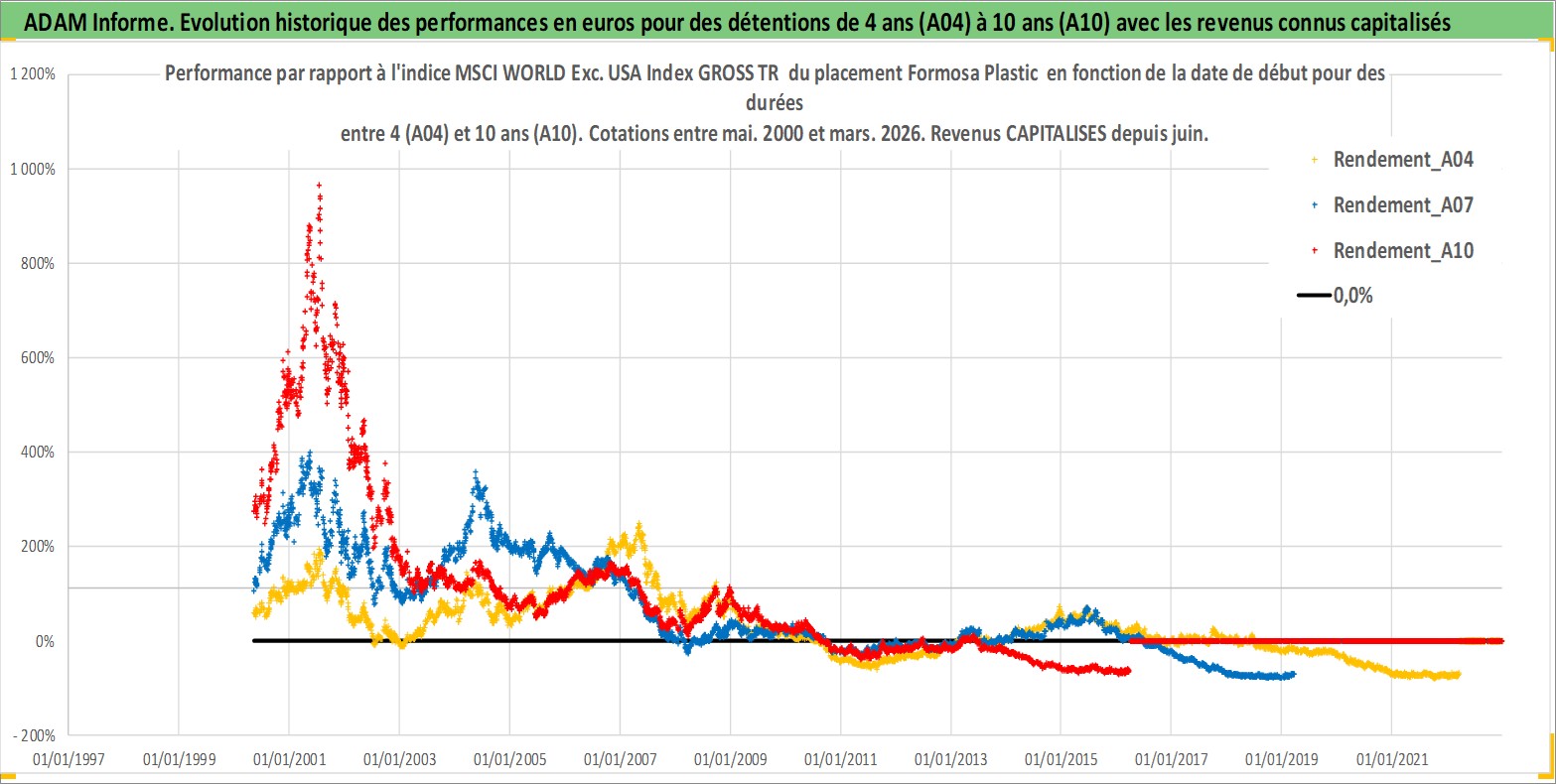 Site dédié aux investisseursPage dédiée sur site financeAnalyse des valorisations hebdomadaires de l'action Formosa Plastic . Cet actif est cote en TWD. Les valorisations sont en contrevaleur EURO et couvrent les semaines 2000W18 a 2026W13. Les revenus de cet actif financier sont pris en compte depuis la semaine 2000W23. La note globale ESG de cet actif est estimee a 9.0 (apres rebasage entre 0 et 20).