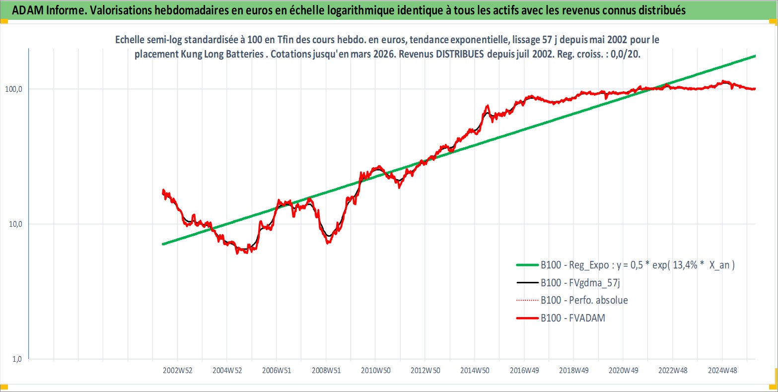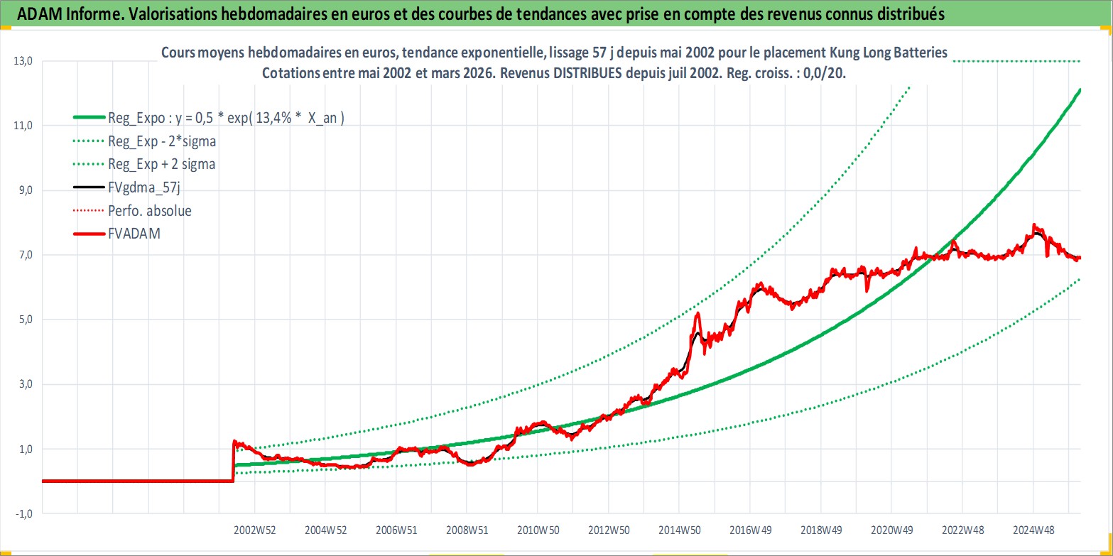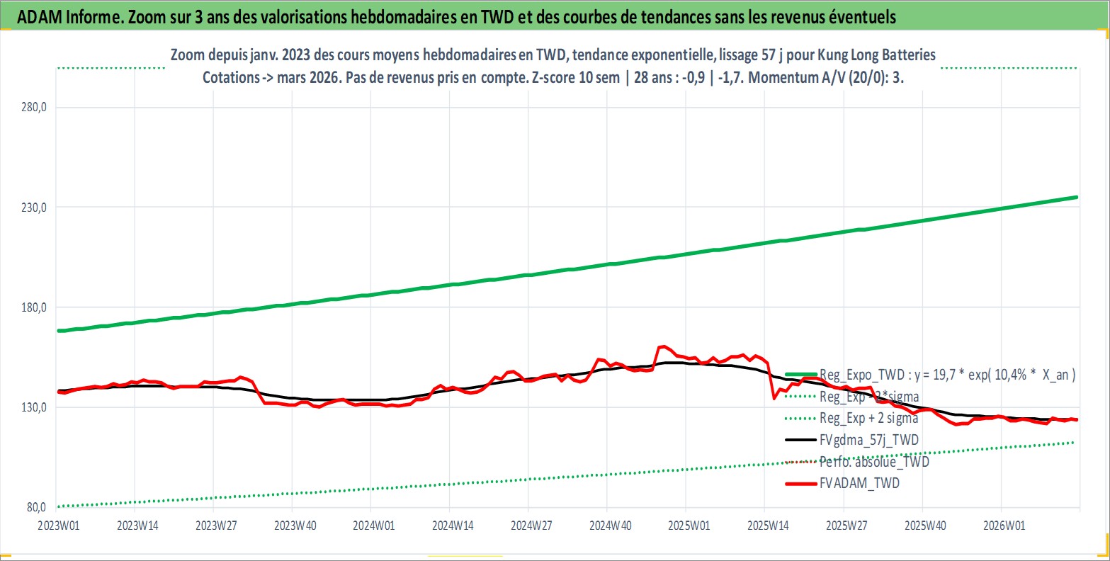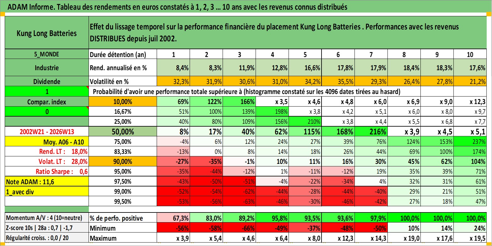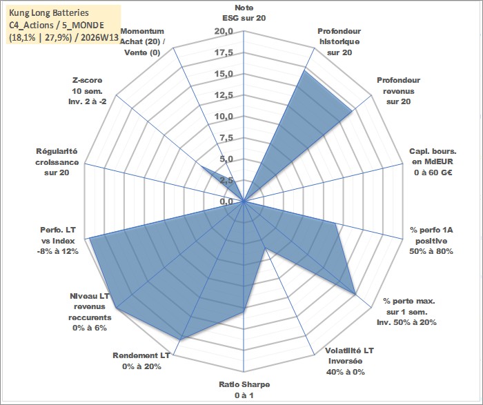 Site dédié aux investisseursPage dédiée sur site financeAnalyse des valorisations hebdomadaires de l'action Kung Long Batteries . Cet actif est cote en TWD. Les valorisations sont en contrevaleur EURO et couvrent les semaines 2002W21 a 2026W13. Les revenus de cet actif financier sont pris en compte depuis la semaine 2002W28. La note ESG de cet actif n'est pas connue.