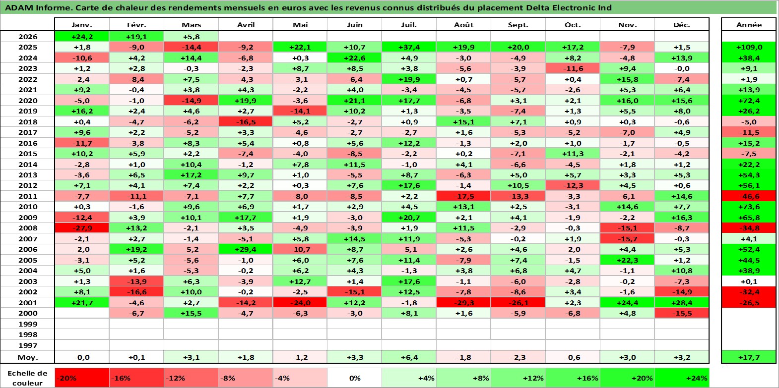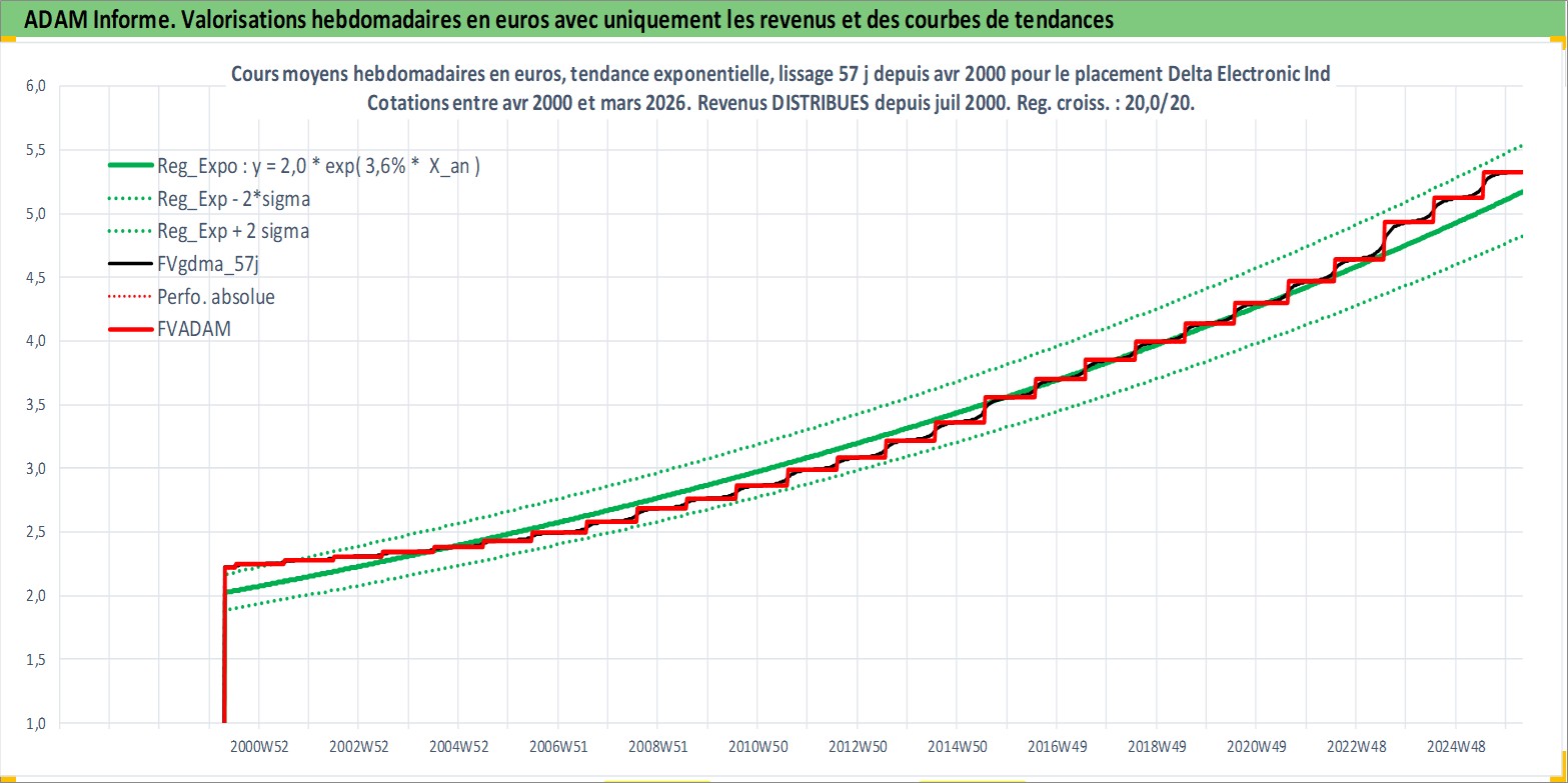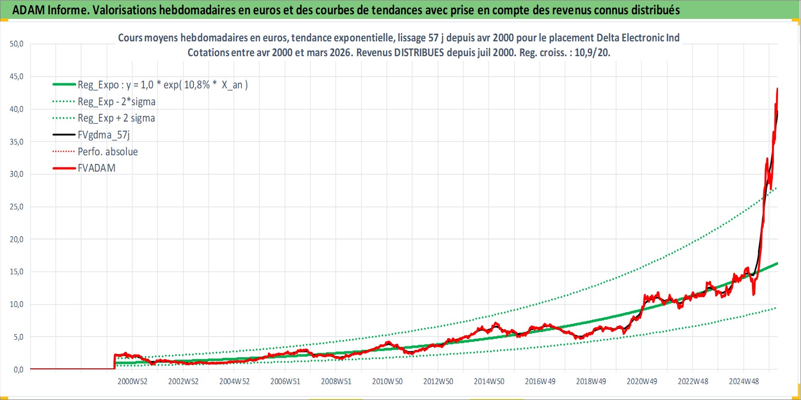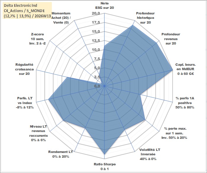 Site dédié aux investisseursPage dédiée sur site financeAnalyse des valorisations hebdomadaires de l'action Delta Electronic Ind . Cet actif est cote en TWD. Les valorisations sont en contrevaleur EURO et couvrent les semaines 2000W16 a 2026W13. Les revenus de cet actif financier sont pris en compte depuis la semaine 2000W28. La note globale ESG de cet actif est estimee a 11.0 (apres rebasage entre 0 et 20).