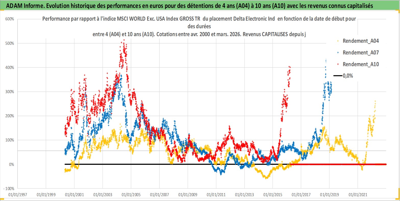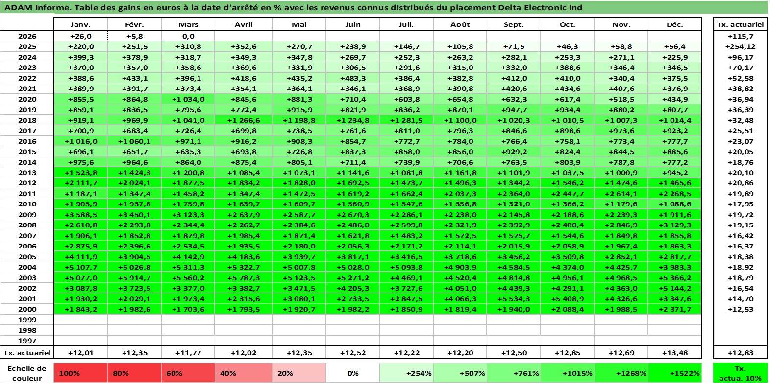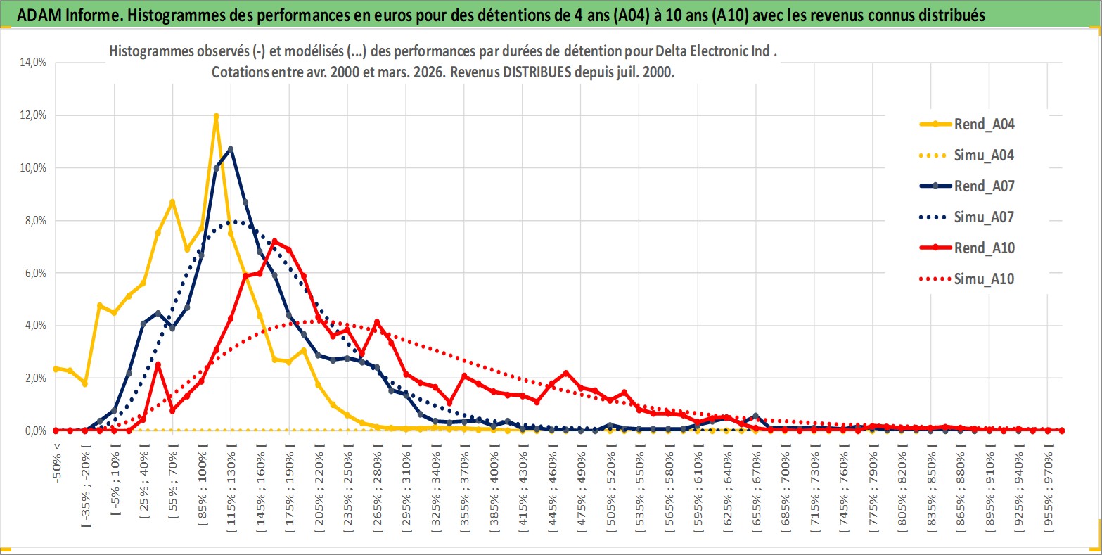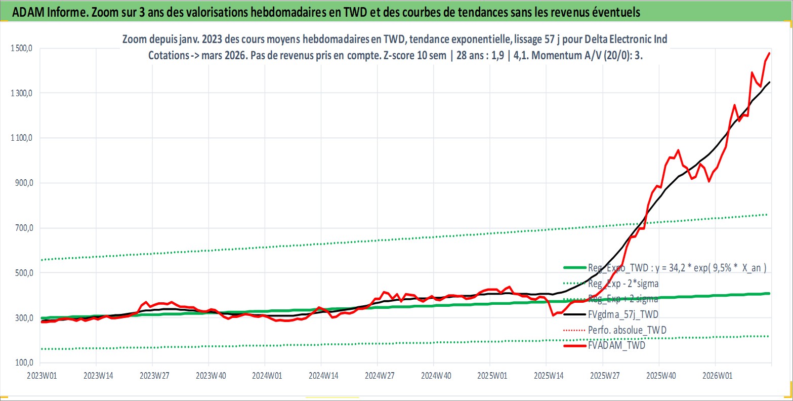Site dédié aux investisseursPage dédiée sur site financeAnalyse des valorisations hebdomadaires de l'action Delta Electronic Ind . Cet actif est cote en TWD. Les valorisations sont en contrevaleur EURO et couvrent les semaines 2000W16 a 2026W13. Les revenus de cet actif financier sont pris en compte depuis la semaine 2000W28. La note globale ESG de cet actif est estimee a 11.0 (apres rebasage entre 0 et 20).