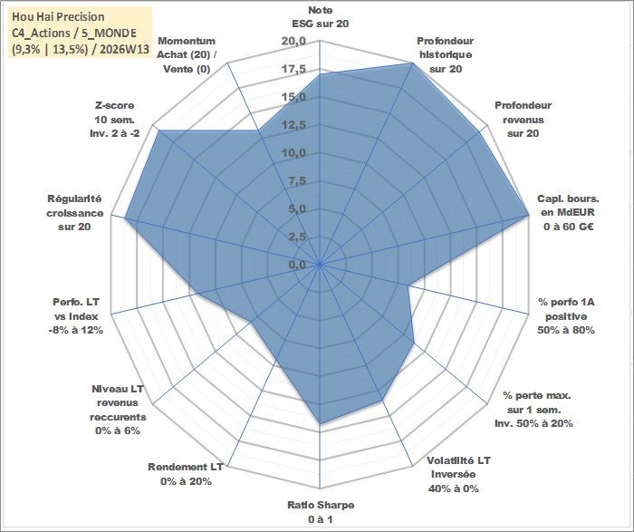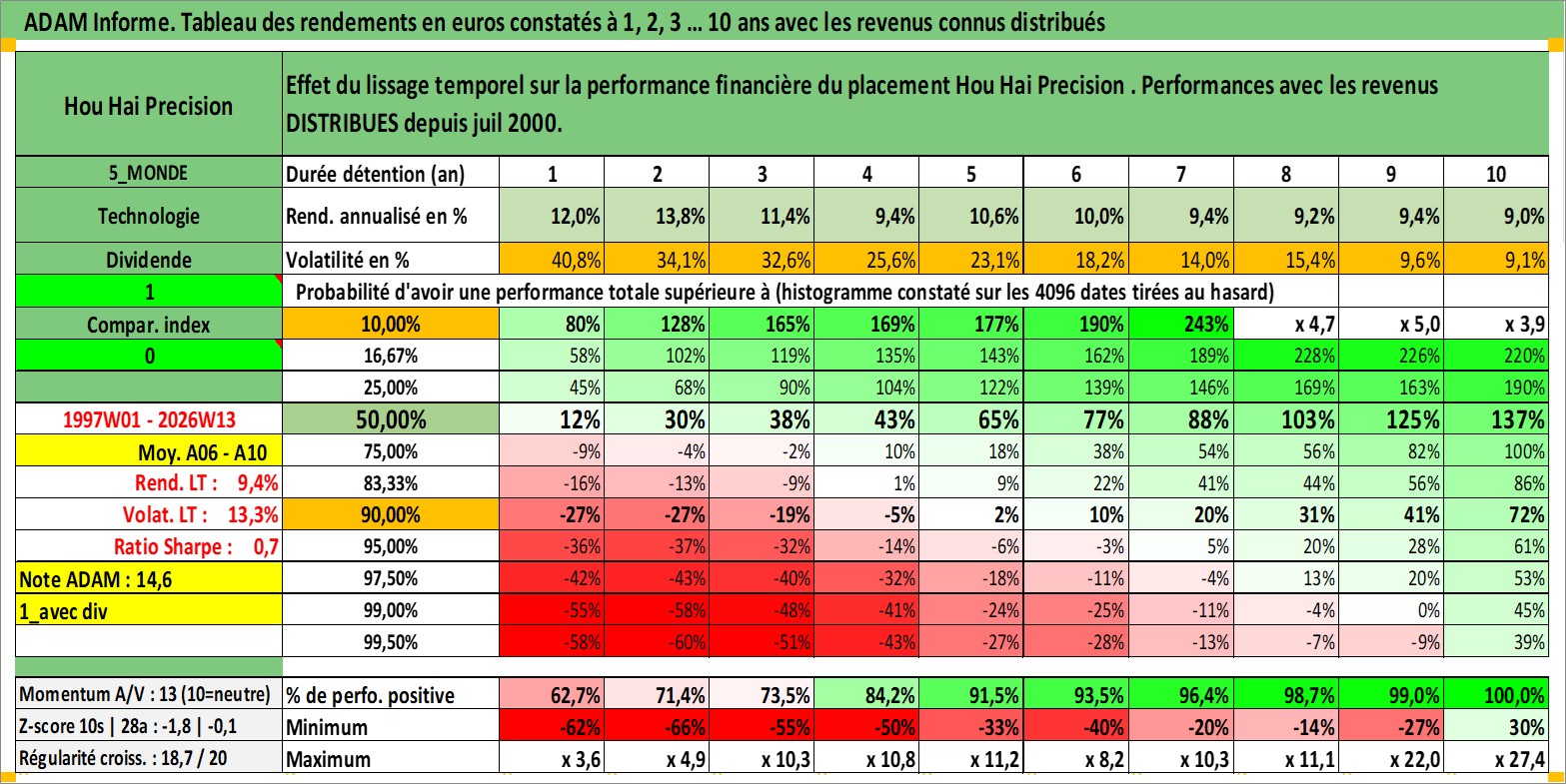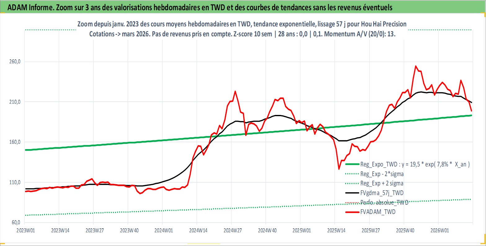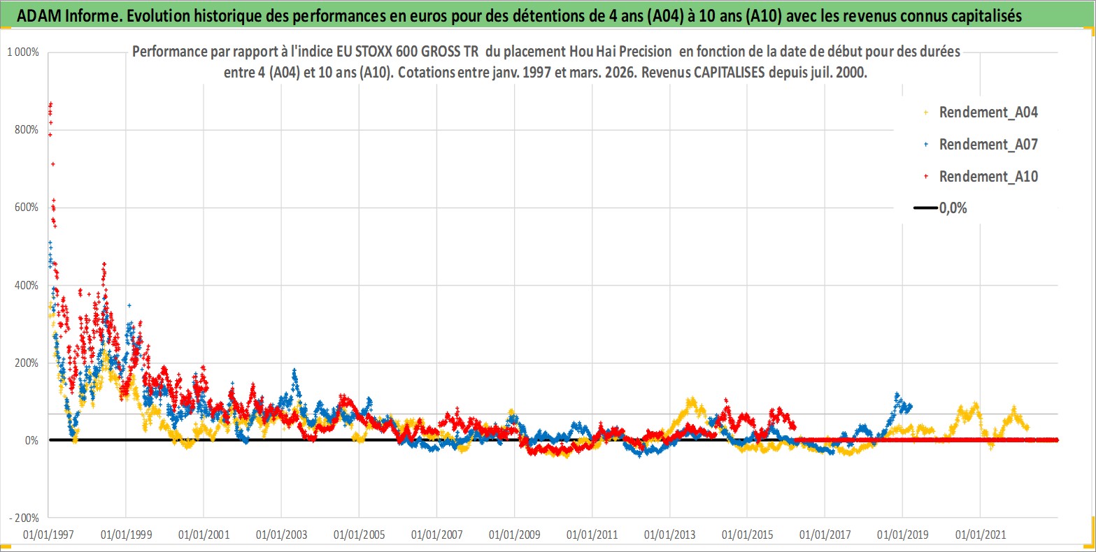 Site dédié aux investisseursPage dédiée sur site financeAnalyse des valorisations hebdomadaires de l'action Hou Hai Precision . Cet actif est cote en TWD. Les valorisations sont en contrevaleur EURO et couvrent les semaines 1997W01 a 2026W13. Les revenus de cet actif financier sont pris en compte depuis la semaine 2000W28. La note globale ESG de cet actif est estimee a 17.0 (apres rebasage entre 0 et 20).