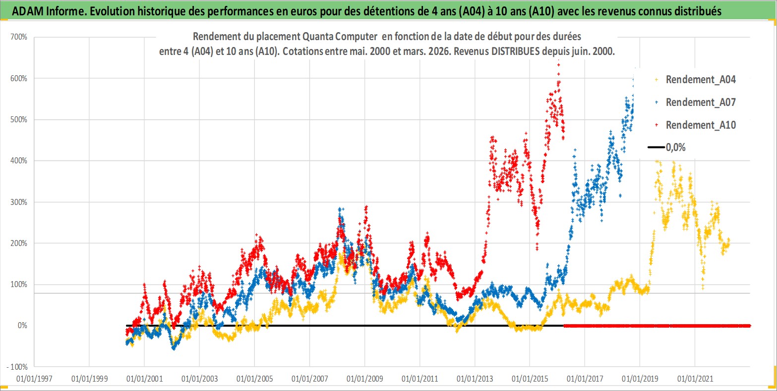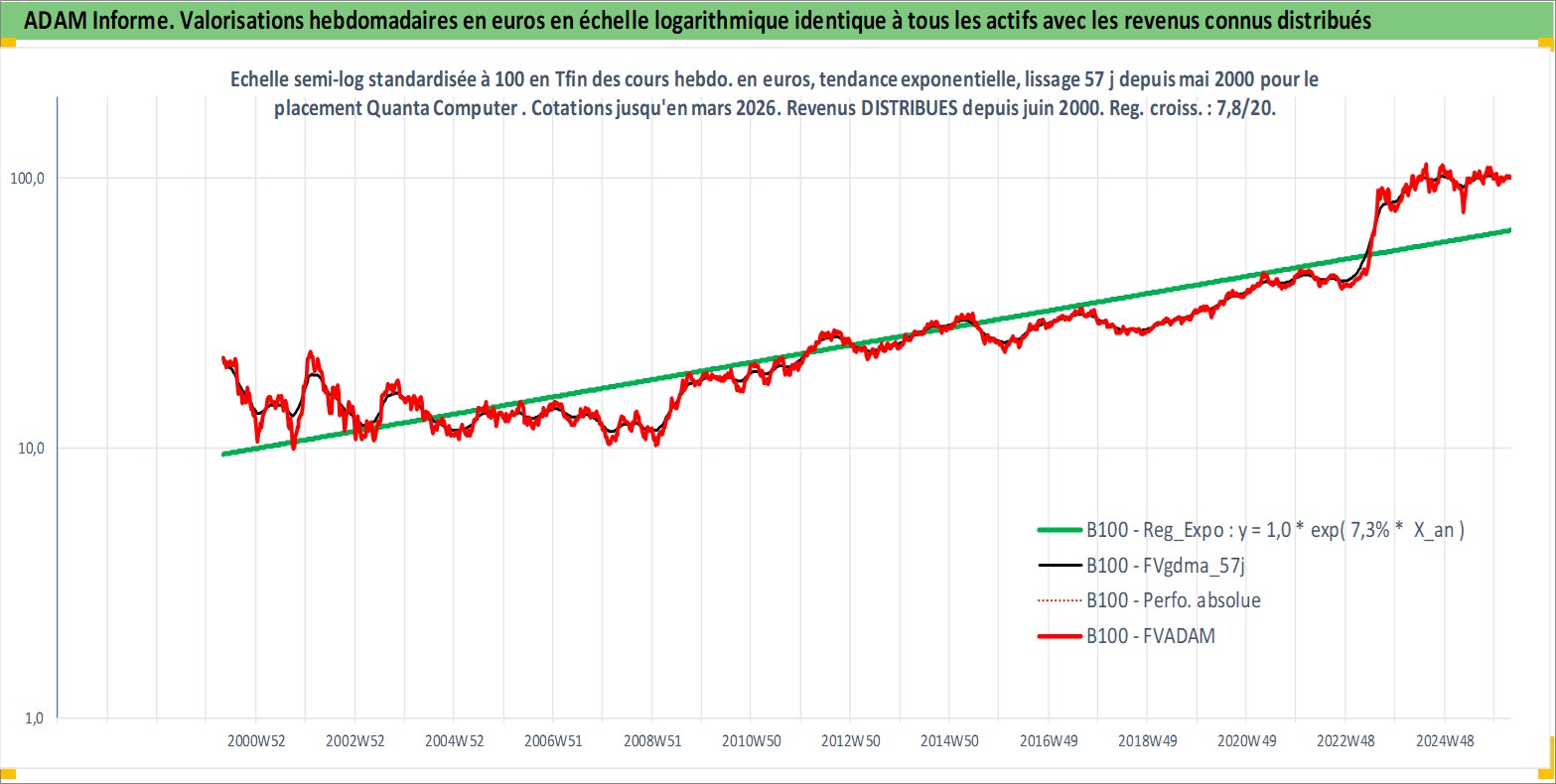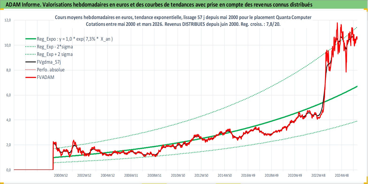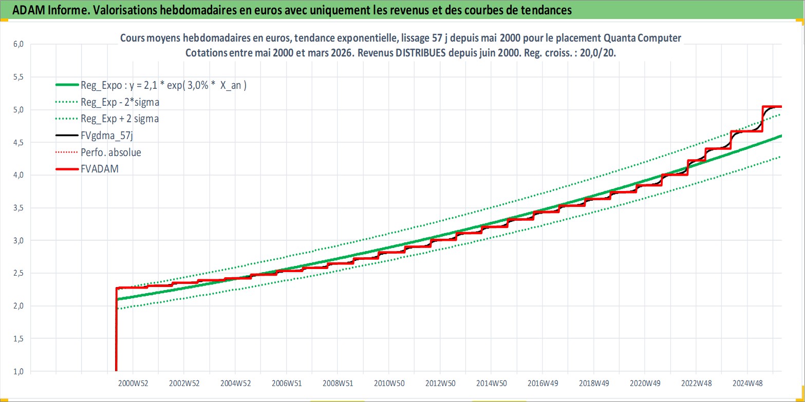 Site dédié aux investisseursPage dédiée sur site financeAnalyse des valorisations hebdomadaires de l'action Quanta Computer . Cet actif est cote en TWD. Les valorisations sont en contrevaleur EURO et couvrent les semaines 2000W18 a 2026W13. Les revenus de cet actif financier sont pris en compte depuis la semaine 2000W24. La note globale ESG de cet actif est estimee a 9.0 (apres rebasage entre 0 et 20).