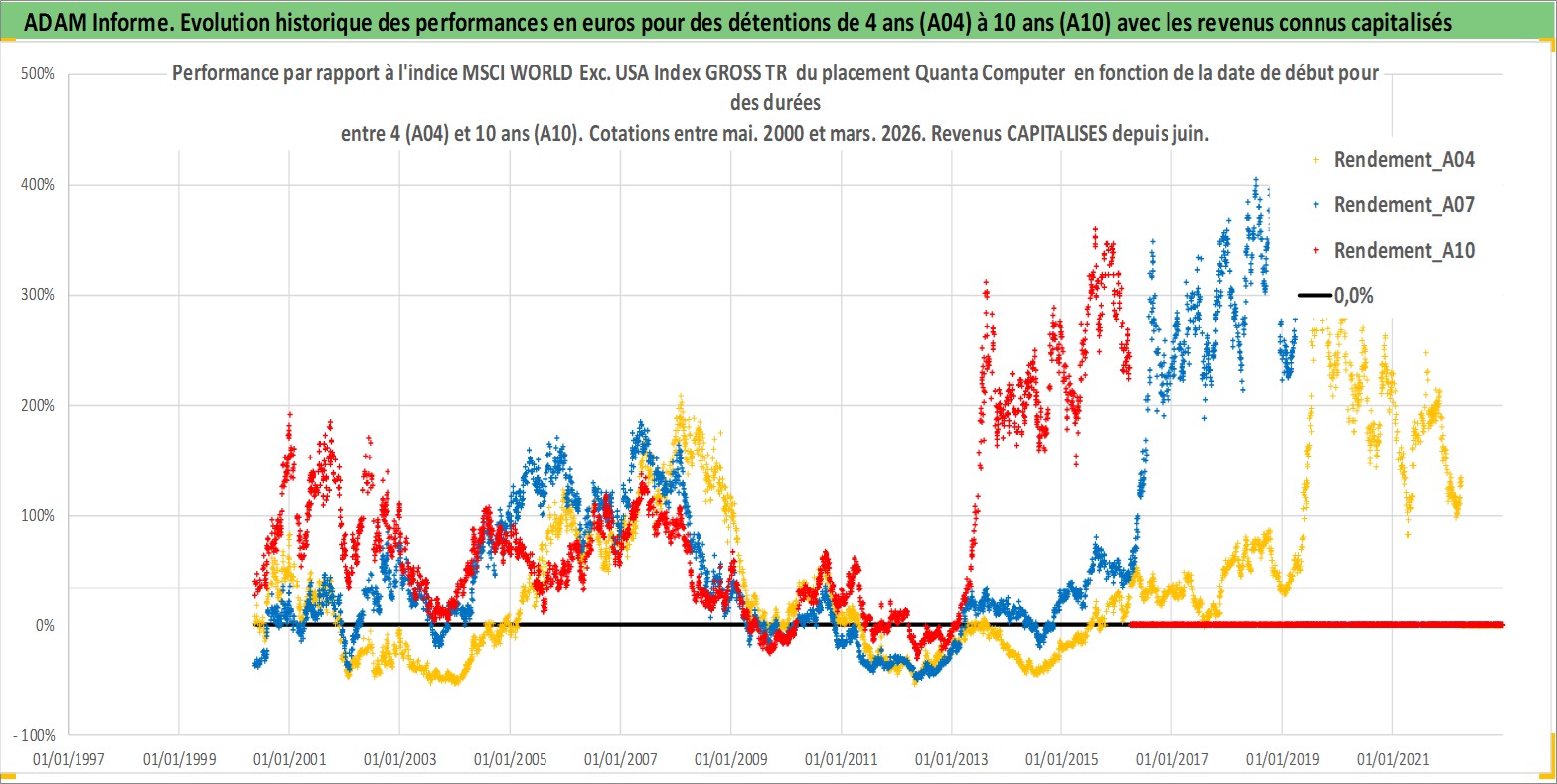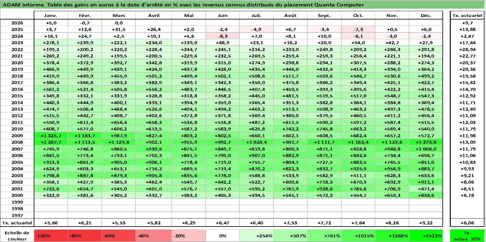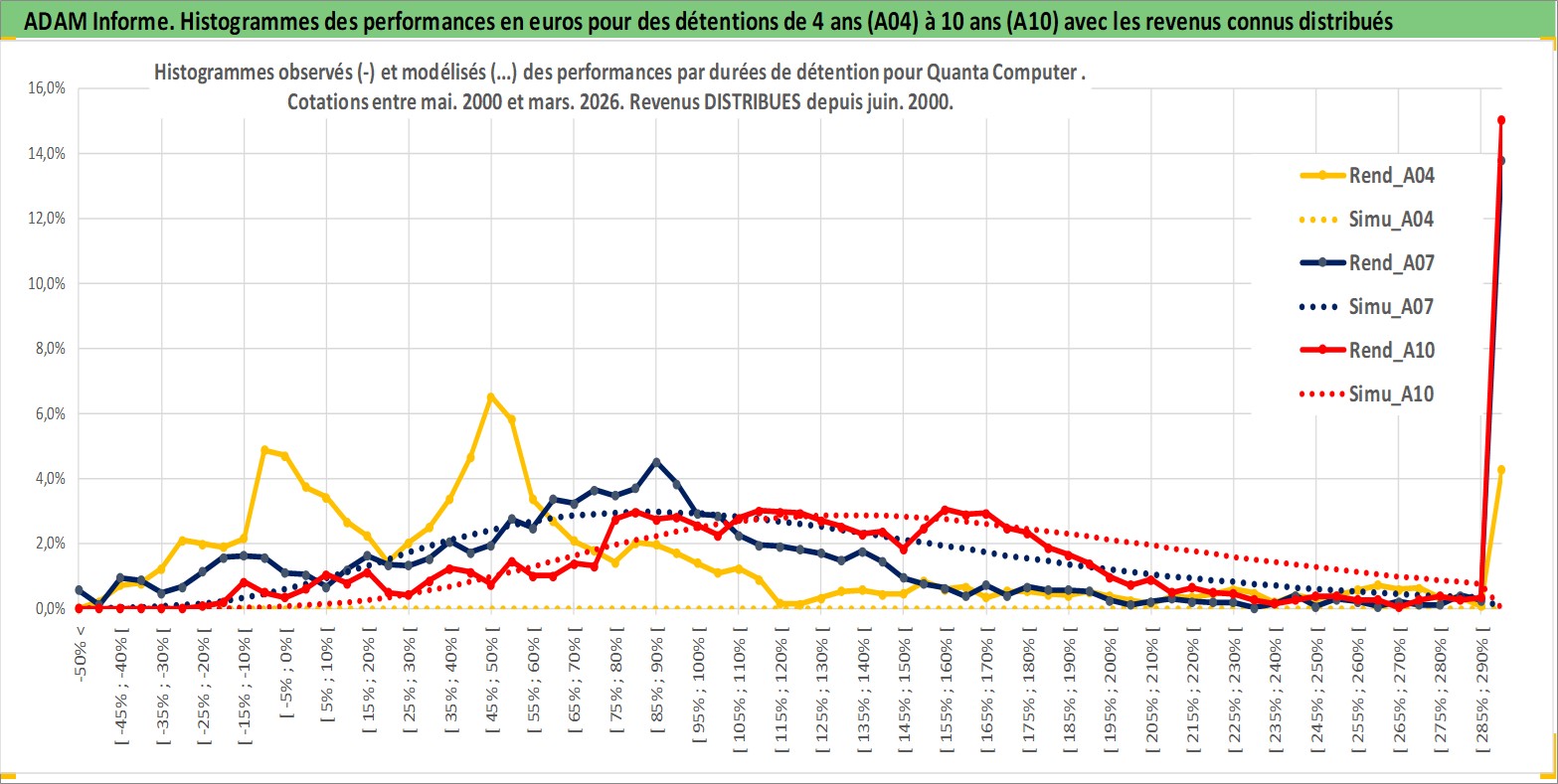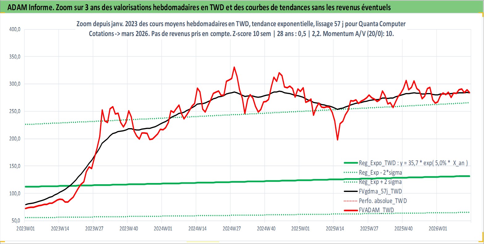 Site dédié aux investisseursPage dédiée sur site financeAnalyse des valorisations hebdomadaires de l'action Quanta Computer . Cet actif est cote en TWD. Les valorisations sont en contrevaleur EURO et couvrent les semaines 2000W18 a 2026W13. Les revenus de cet actif financier sont pris en compte depuis la semaine 2000W24. La note globale ESG de cet actif est estimee a 9.0 (apres rebasage entre 0 et 20).