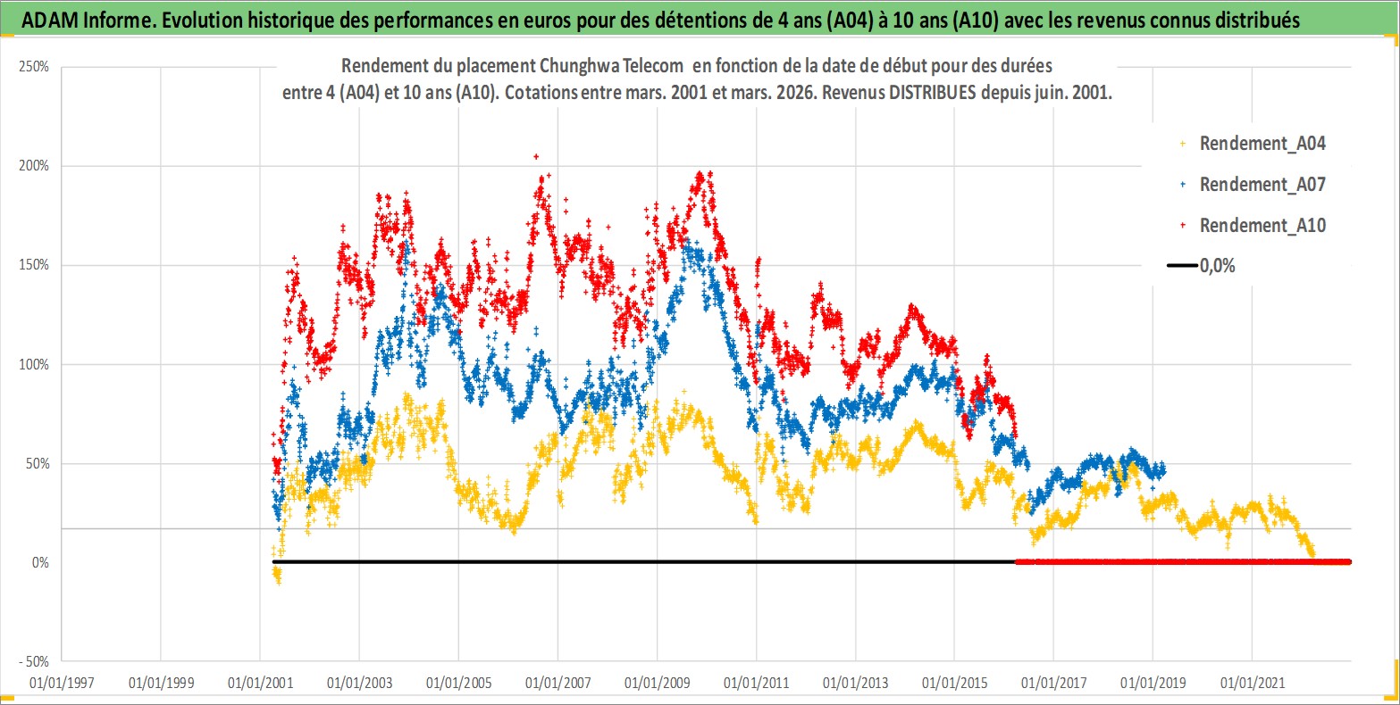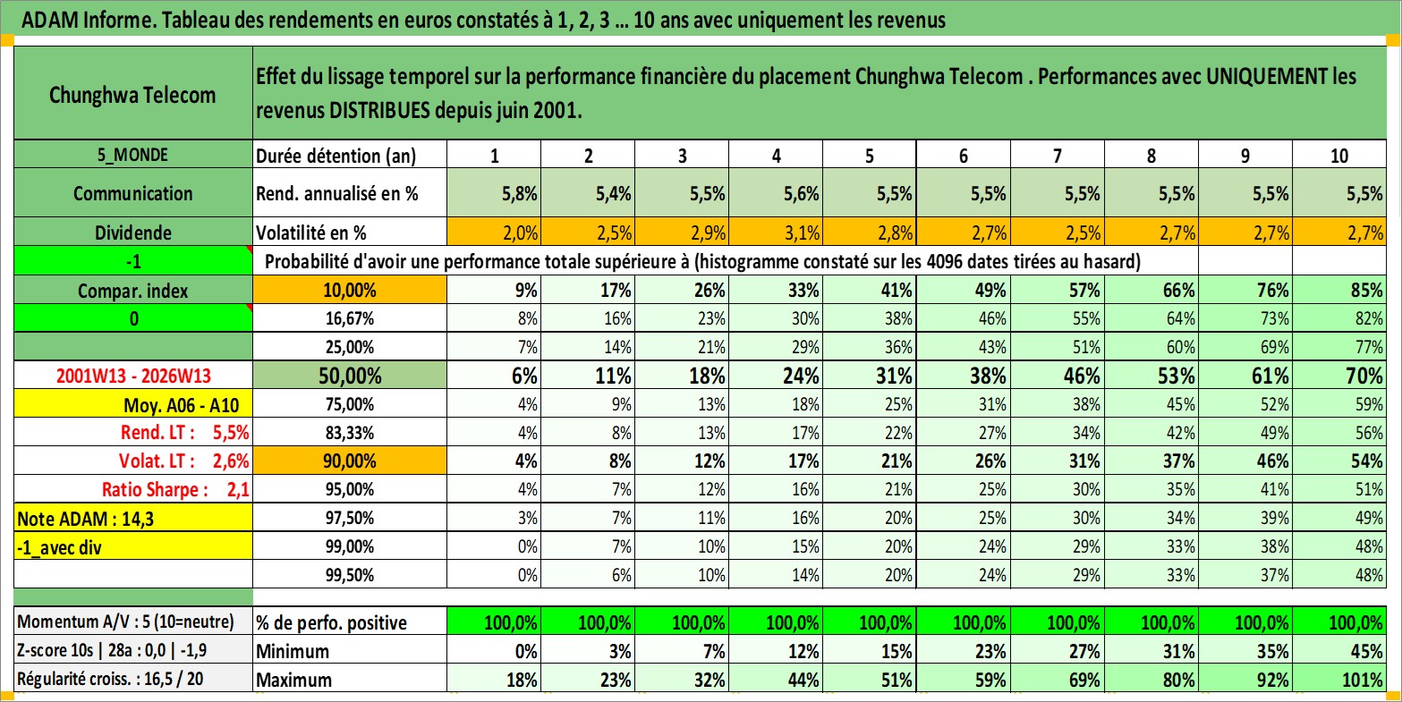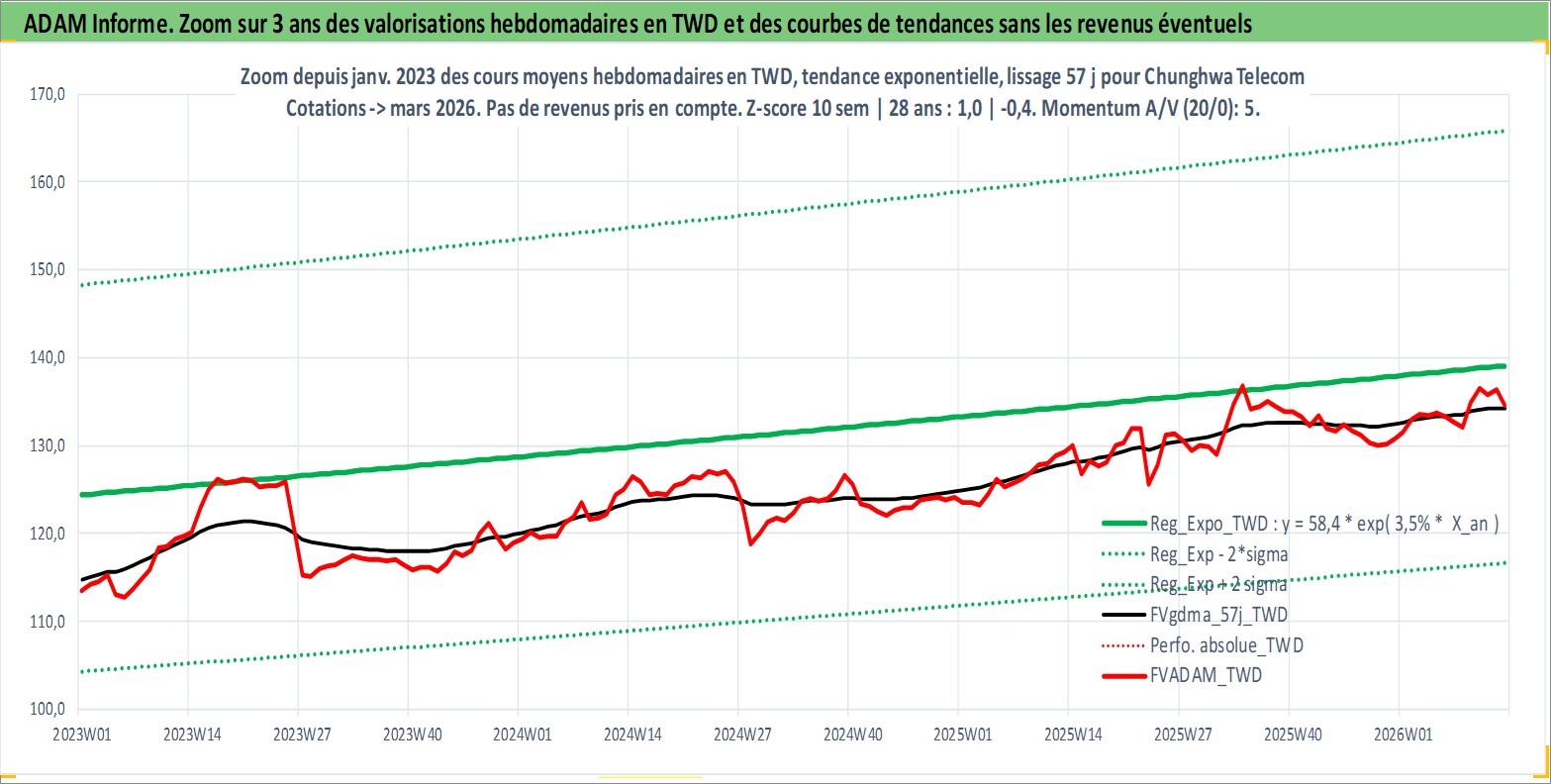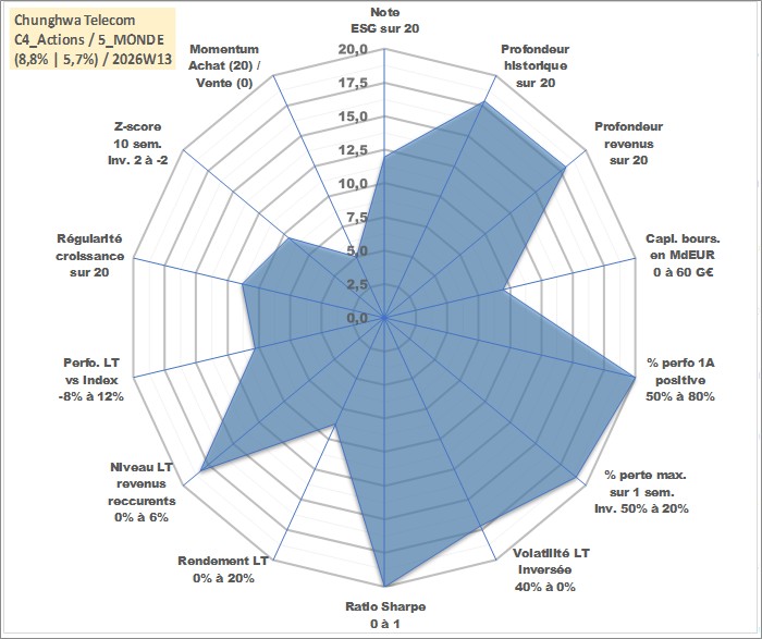Site dédié aux investisseursPage dédiée sur site financeAnalyse des valorisations hebdomadaires de l'action Chunghwa Telecom . Cet actif est cote en TWD. Les valorisations sont en contrevaleur EURO et couvrent les semaines 2001W13 a 2026W13. Les revenus de cet actif financier sont pris en compte depuis la semaine 2001W25. La note globale ESG de cet actif est estimee a 12.0 (apres rebasage entre 0 et 20).