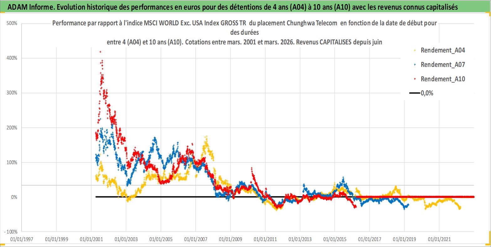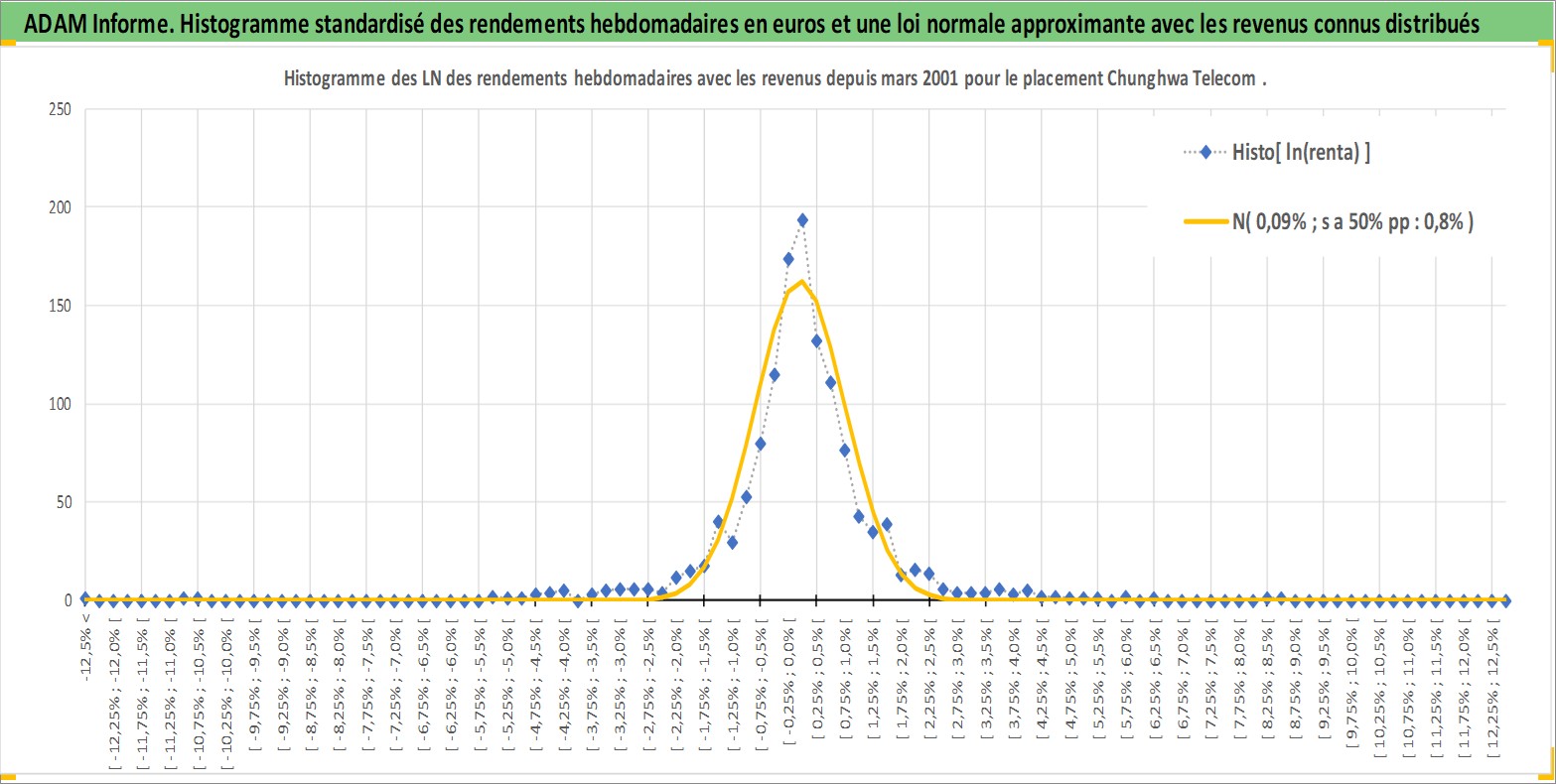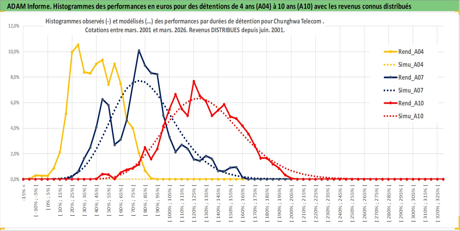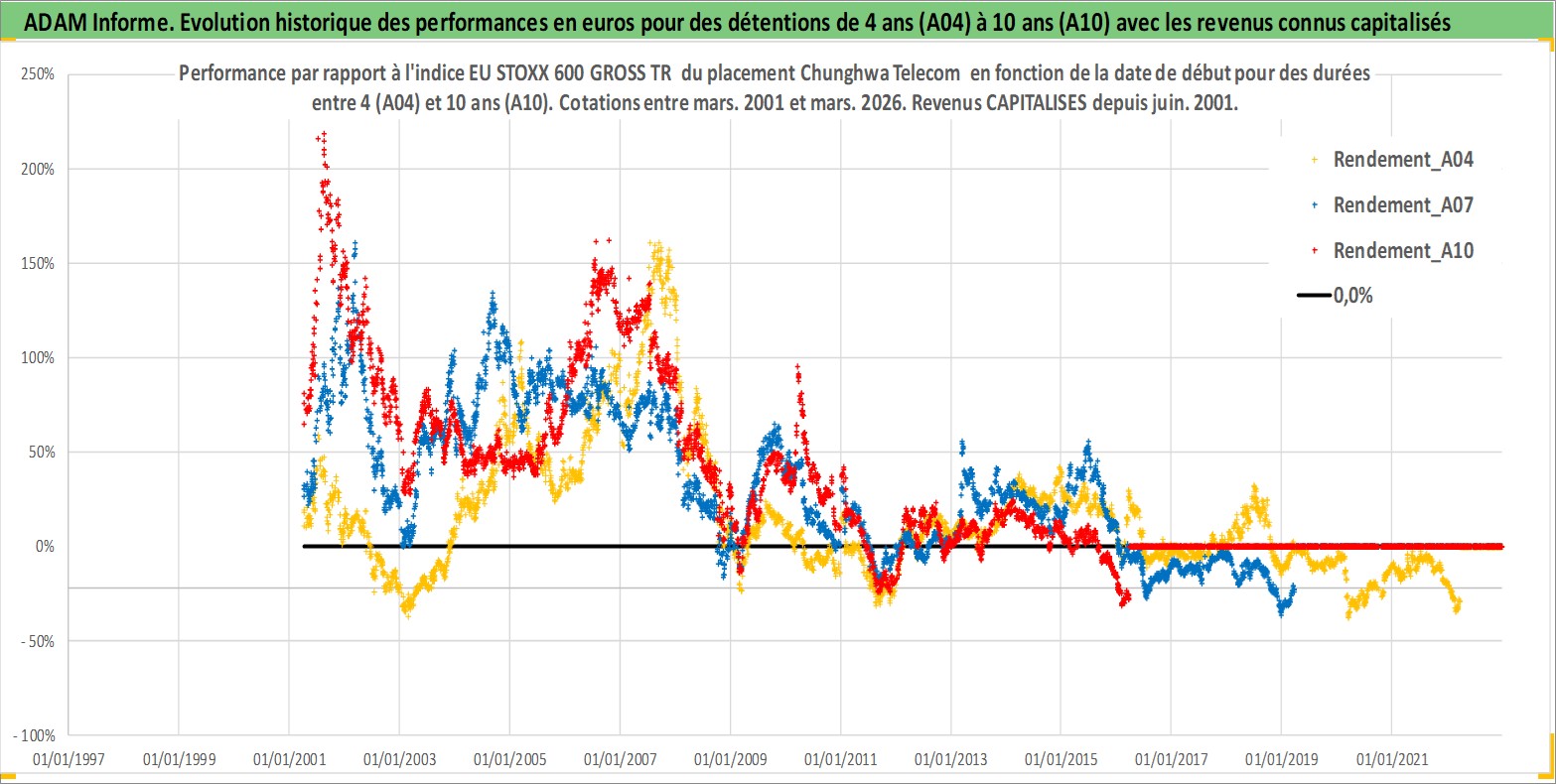 Site dédié aux investisseursPage dédiée sur site financeAnalyse des valorisations hebdomadaires de l'action Chunghwa Telecom . Cet actif est cote en TWD. Les valorisations sont en contrevaleur EURO et couvrent les semaines 2001W13 a 2026W13. Les revenus de cet actif financier sont pris en compte depuis la semaine 2001W25. La note globale ESG de cet actif est estimee a 12.0 (apres rebasage entre 0 et 20).