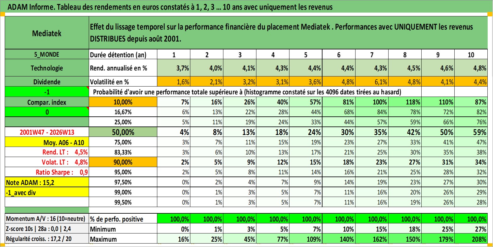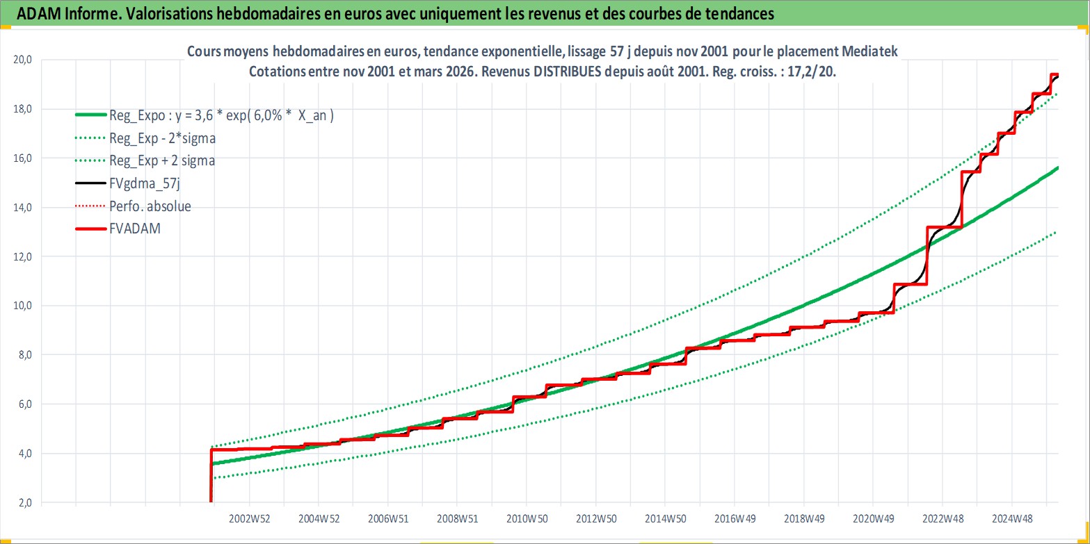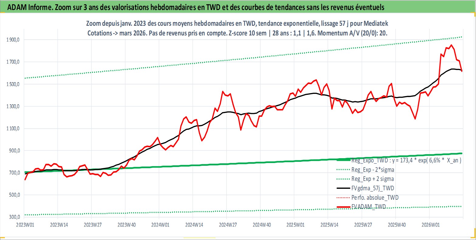 Site dédié aux investisseursPage dédiée sur site financeAnalyse des valorisations hebdomadaires de l'action Mediatek . Cet actif est cote en TWD. Les valorisations sont en contrevaleur EURO et couvrent les semaines 2001W47 a 2026W13. Les revenus de cet actif financier sont pris en compte depuis la semaine 2001W35. La note globale ESG de cet actif est estimee a 10.0 (apres rebasage entre 0 et 20).