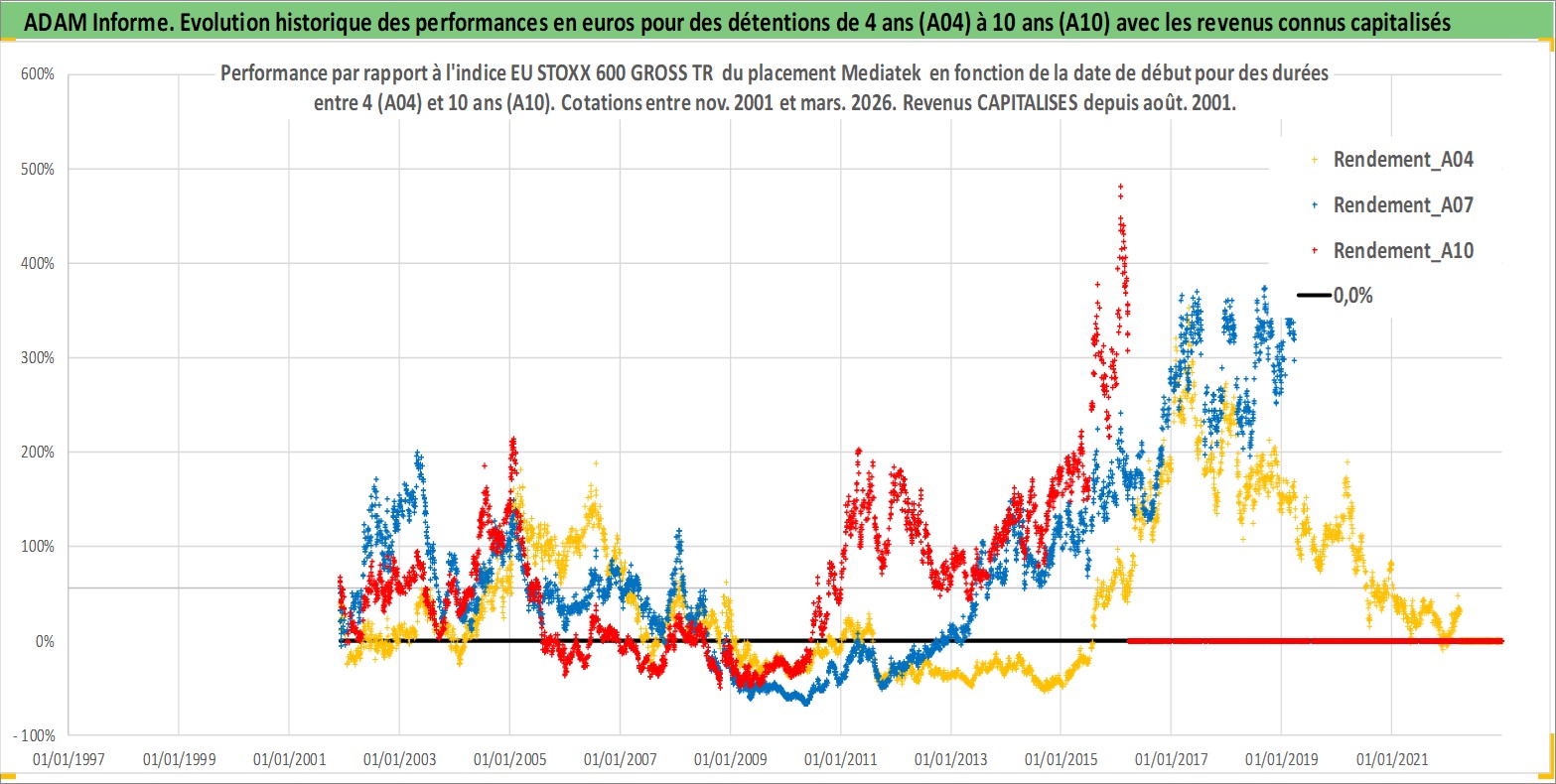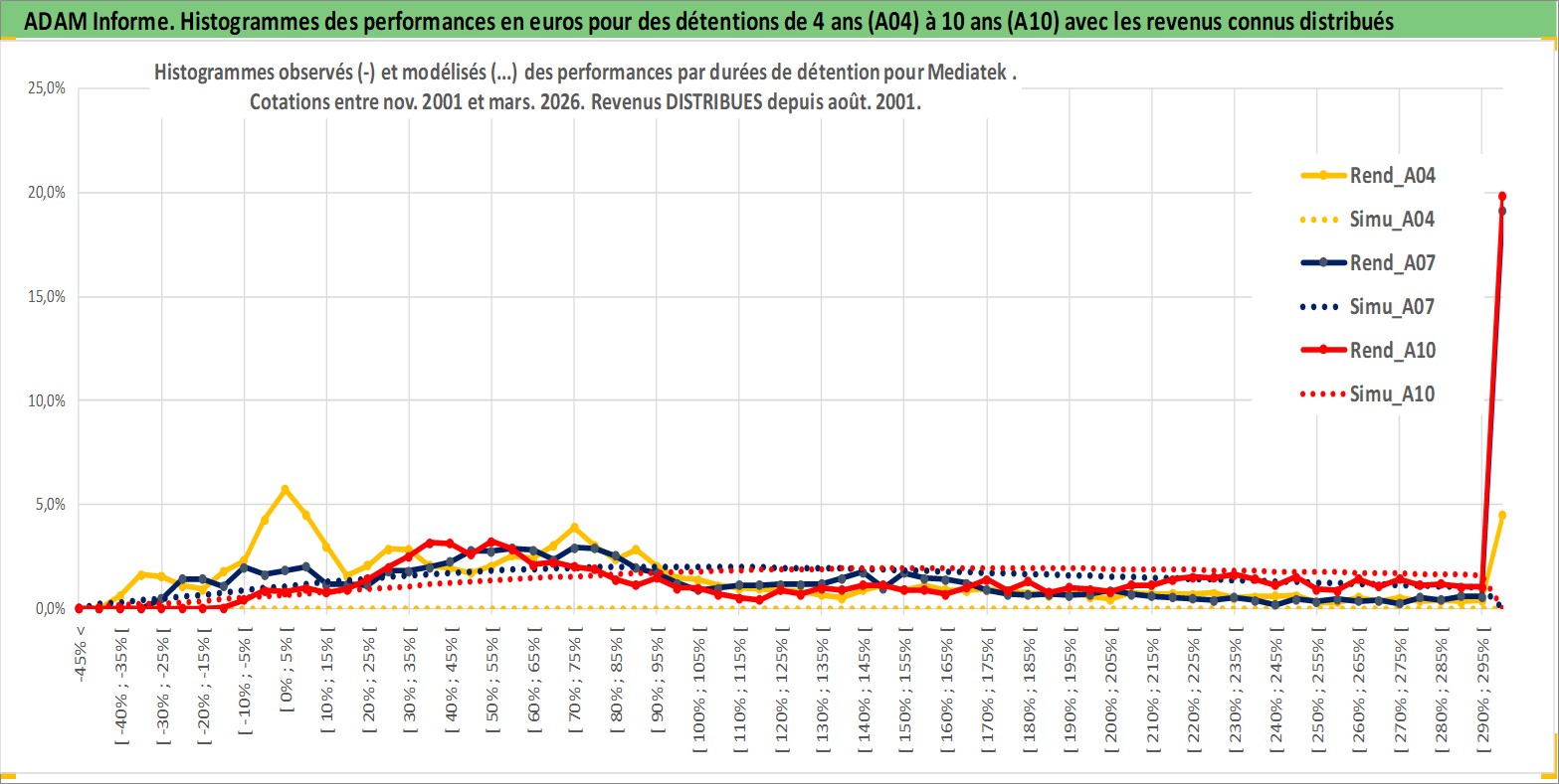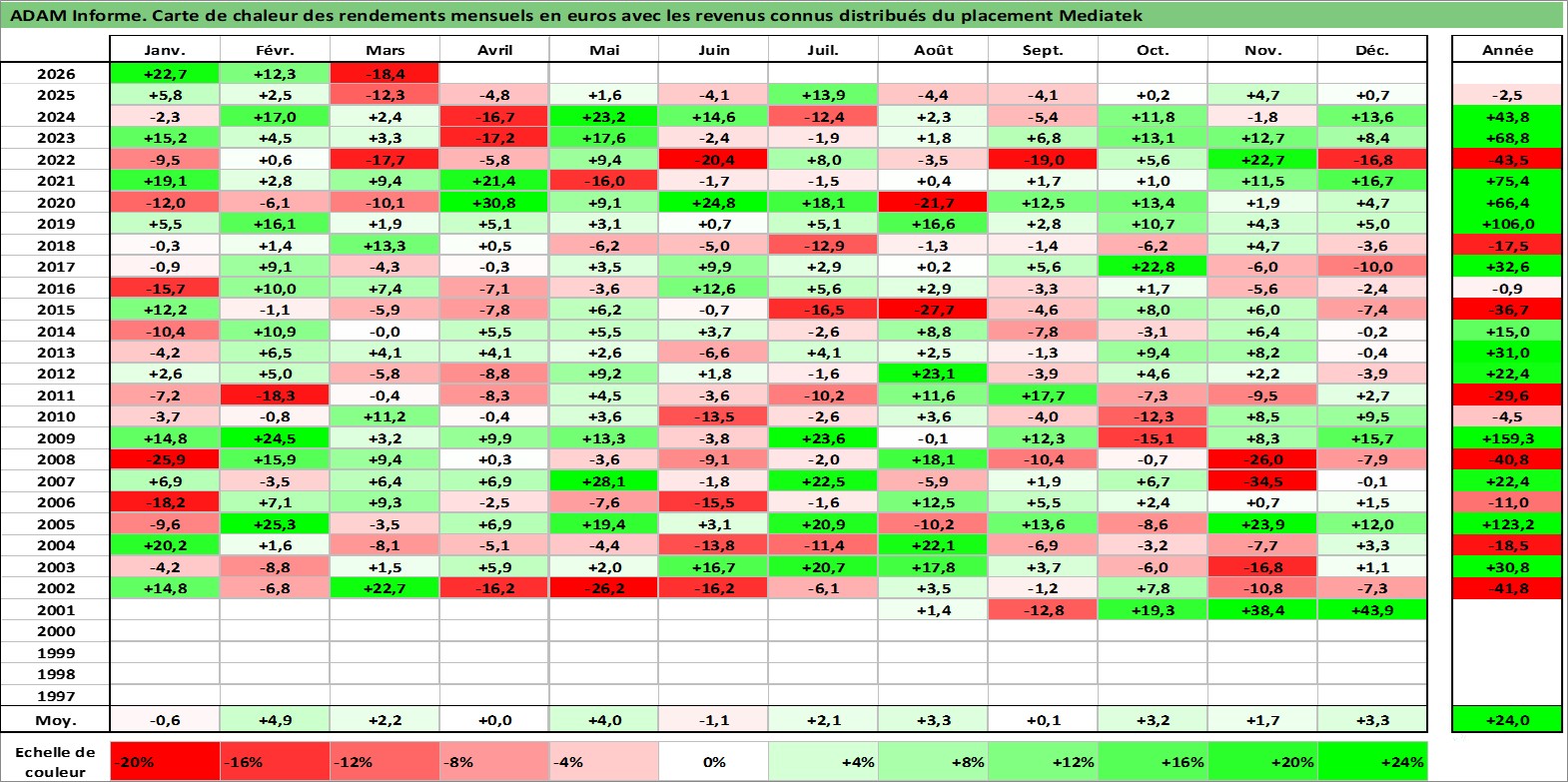 Site dédié aux investisseursPage dédiée sur site financeAnalyse des valorisations hebdomadaires de l'action Mediatek . Cet actif est cote en TWD. Les valorisations sont en contrevaleur EURO et couvrent les semaines 2001W47 a 2026W13. Les revenus de cet actif financier sont pris en compte depuis la semaine 2001W35. La note globale ESG de cet actif est estimee a 10.0 (apres rebasage entre 0 et 20).
